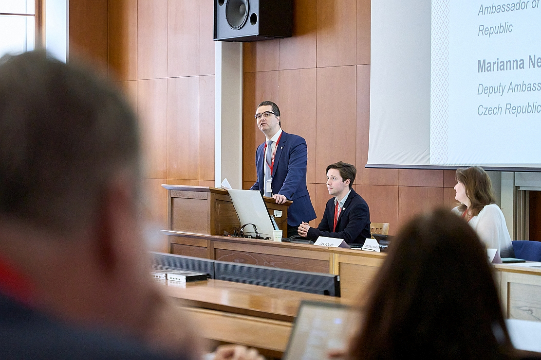 Vice-Rector Jan Polák at the podium where he appeared several times over the course of Friday's conference at Charles University.