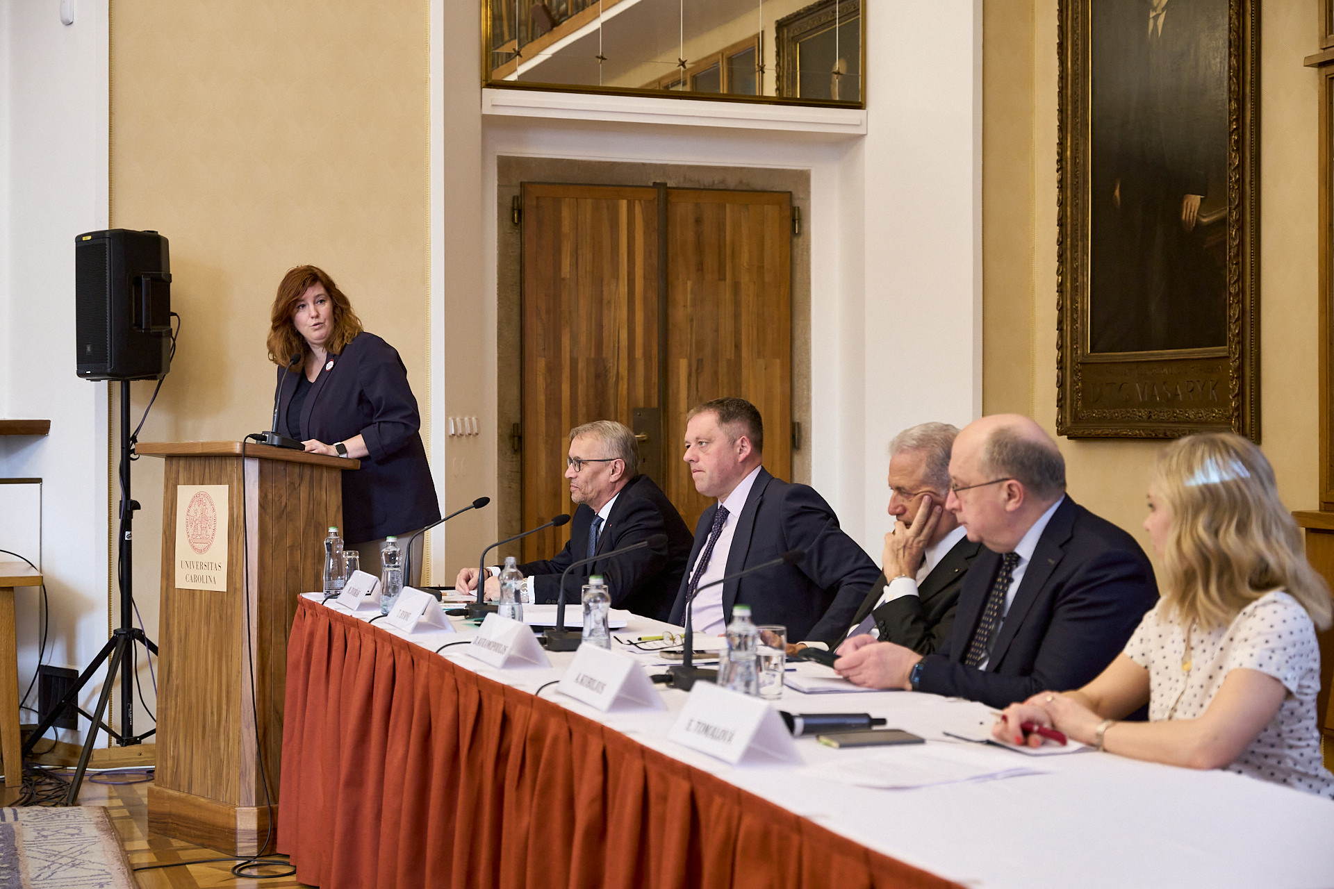 Vice-Rector Eva Voldřichová Beránková, at the podium, was one of the first to speak at the recent conference on EU accession at CU.