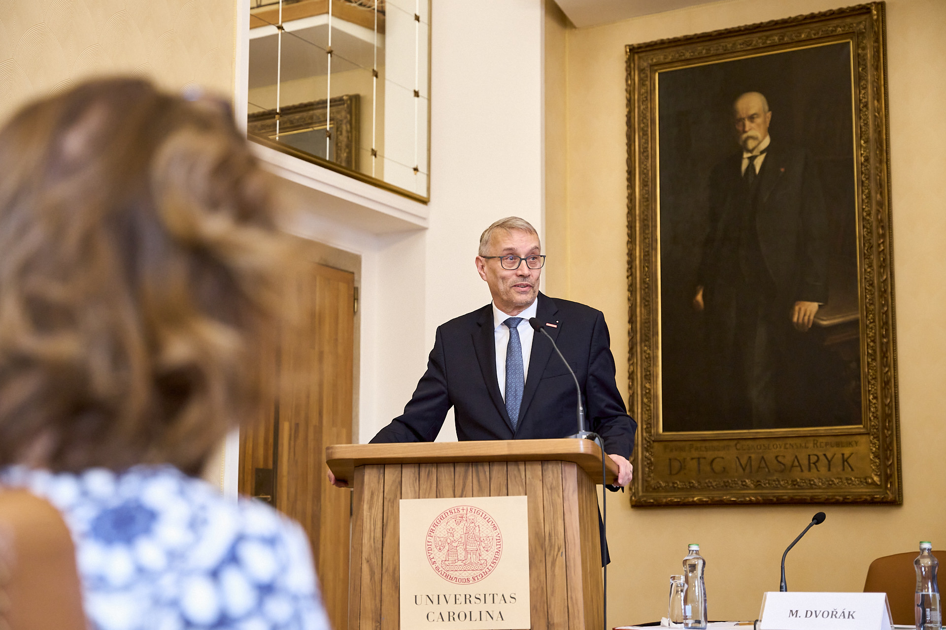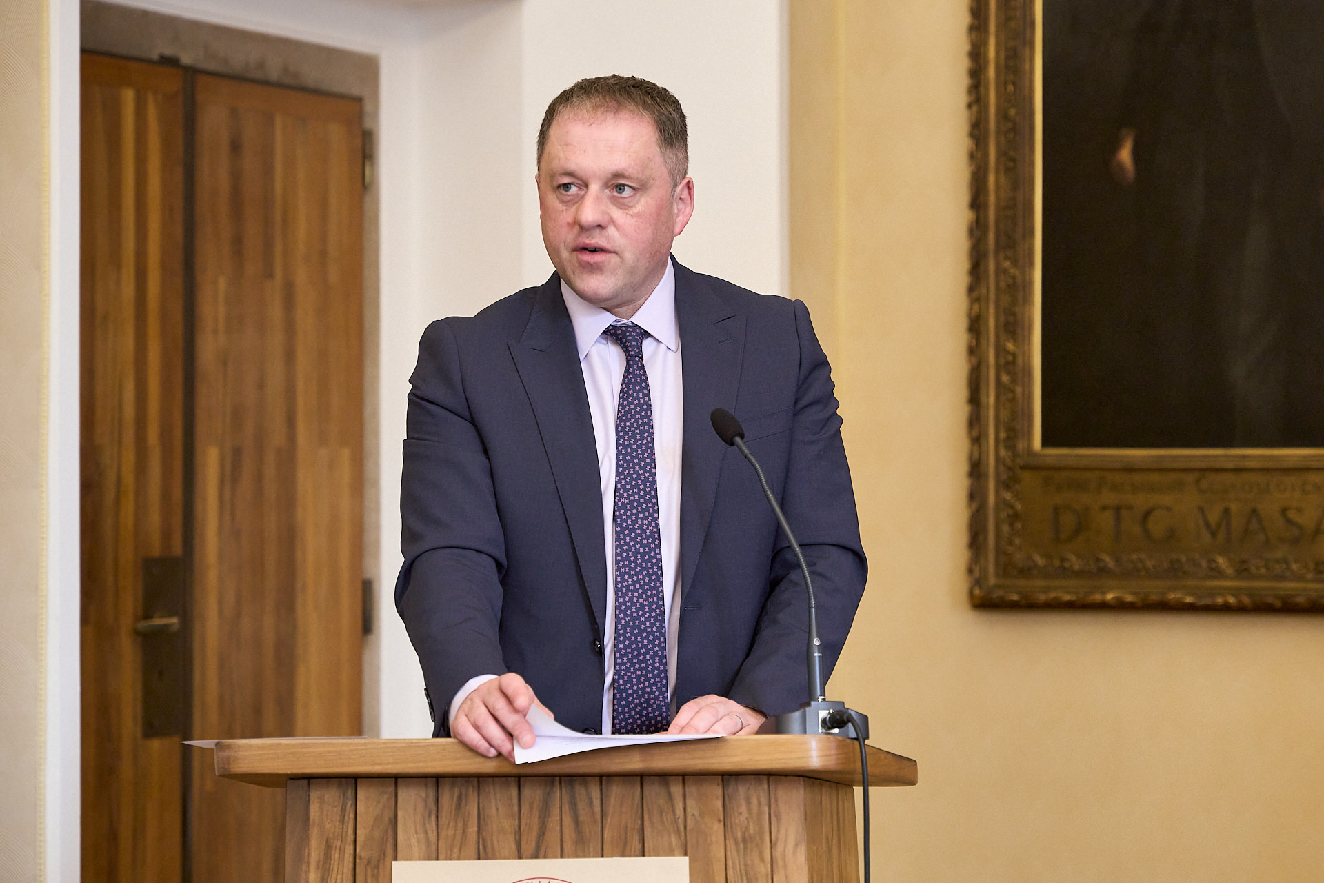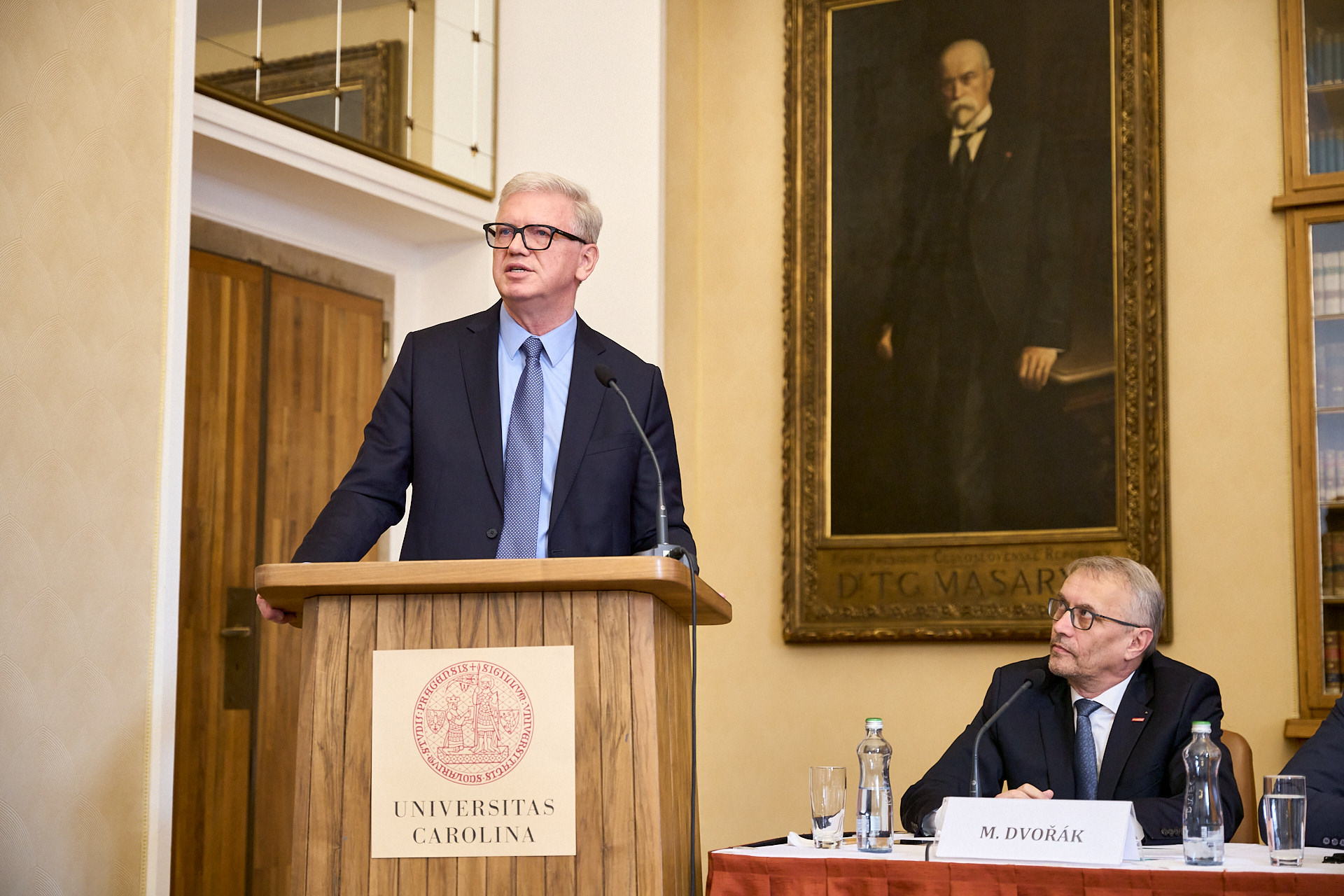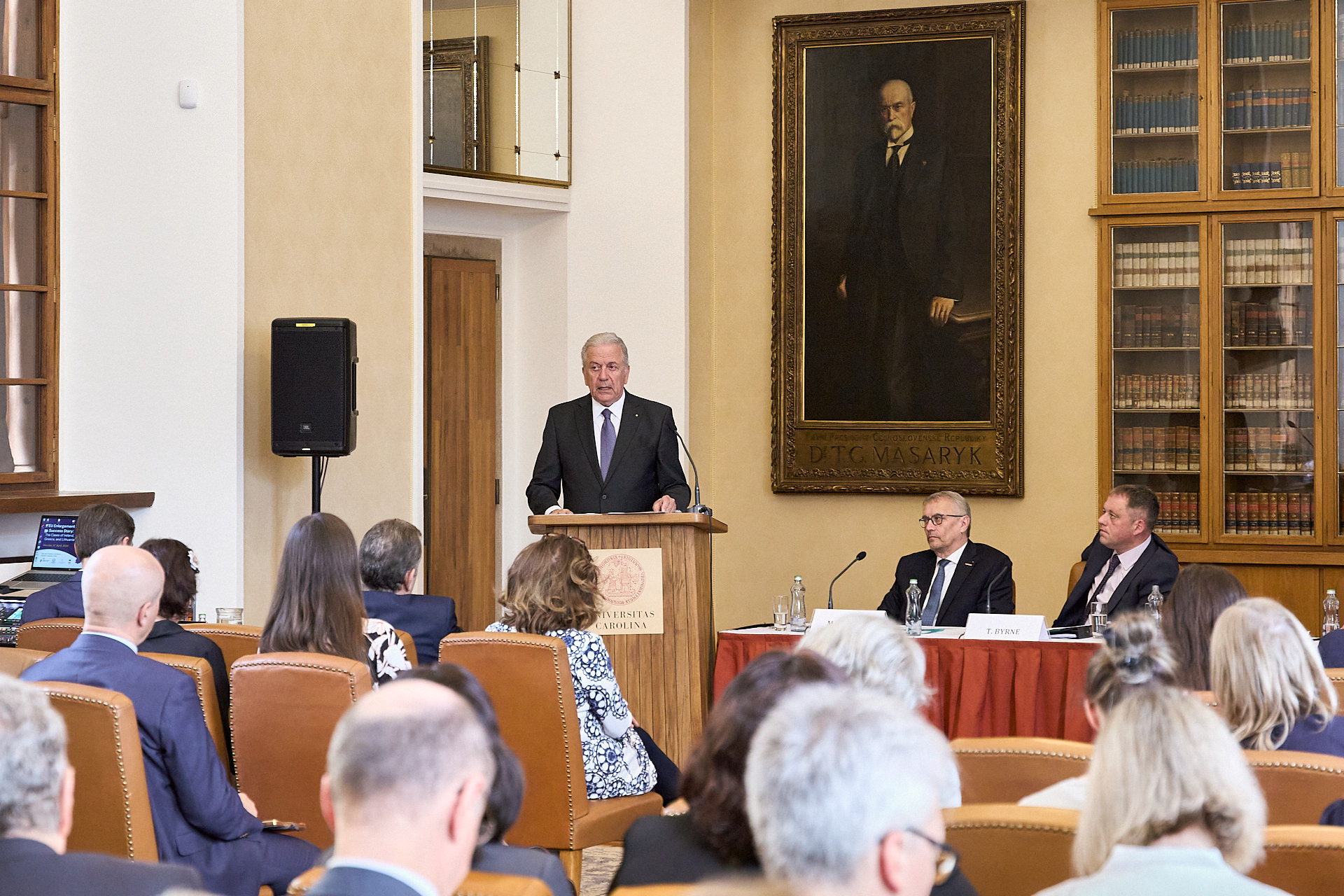 Eliška Tomalová, from the Institute of International Studies at CU, spoke briefly about EU accession before introducing the main speakers: the Czech government’s Minister for European Affairs Martin Dvořák, Ireland’s former Minister of State for European Affairs Tomas Byrne, former EU commissioner and former Athens mayor Dimitris Avramopoulos, and MEP and former prime minister of Lithuania Andrius Kubilius. Also invited to speak was Czechia's former Minister for European Affairs, Stefan Füle.
