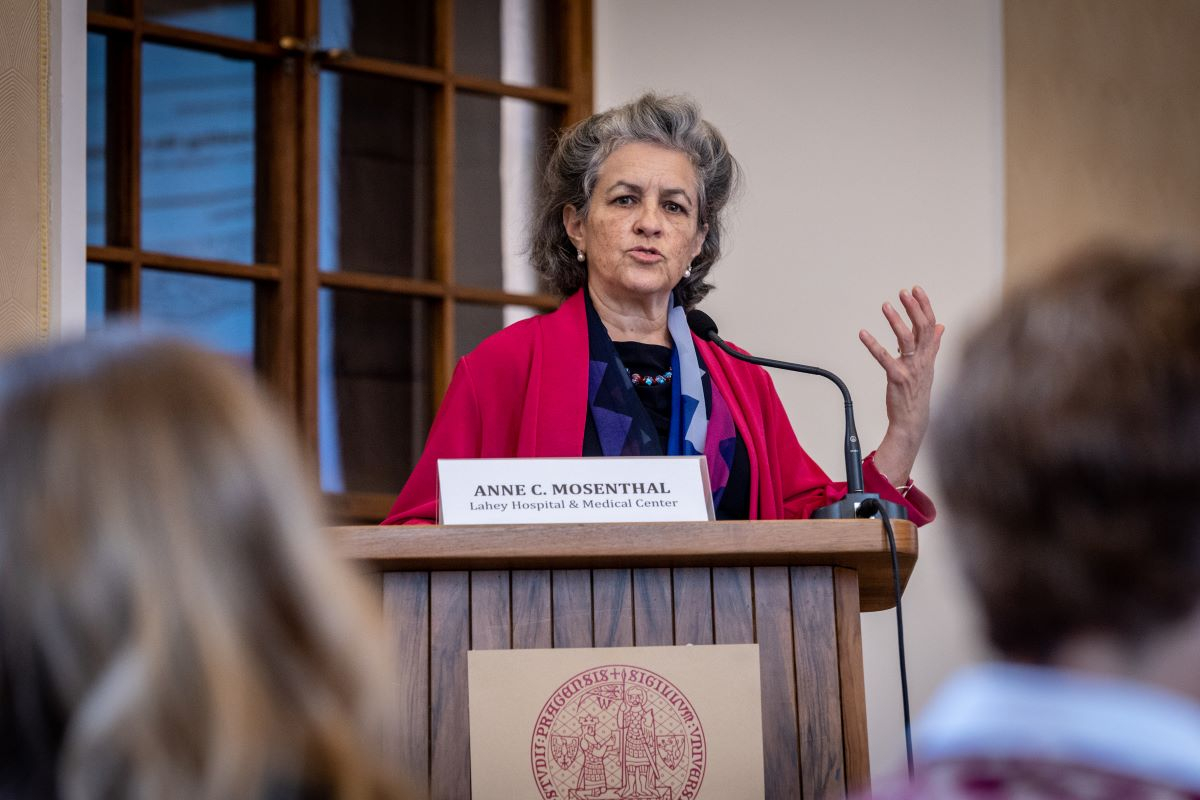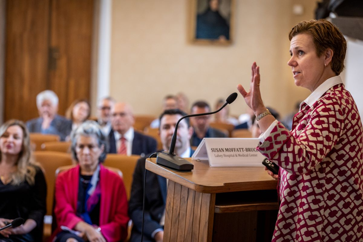Anne C. Mosenthal speaking at Tuesday's conference; Lahey president Susan Moffatt-Bruce, right.