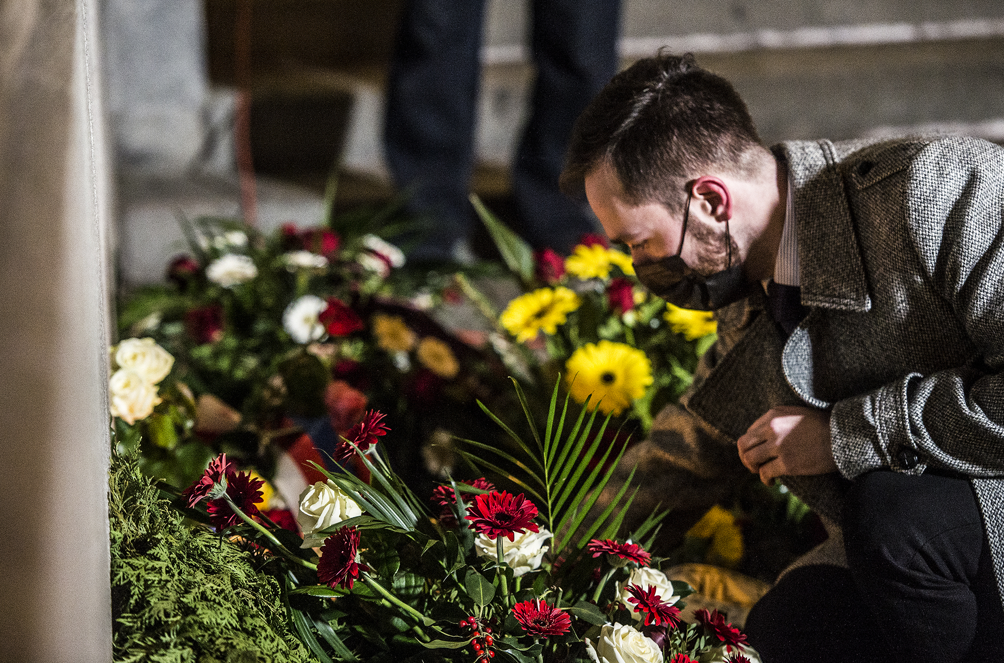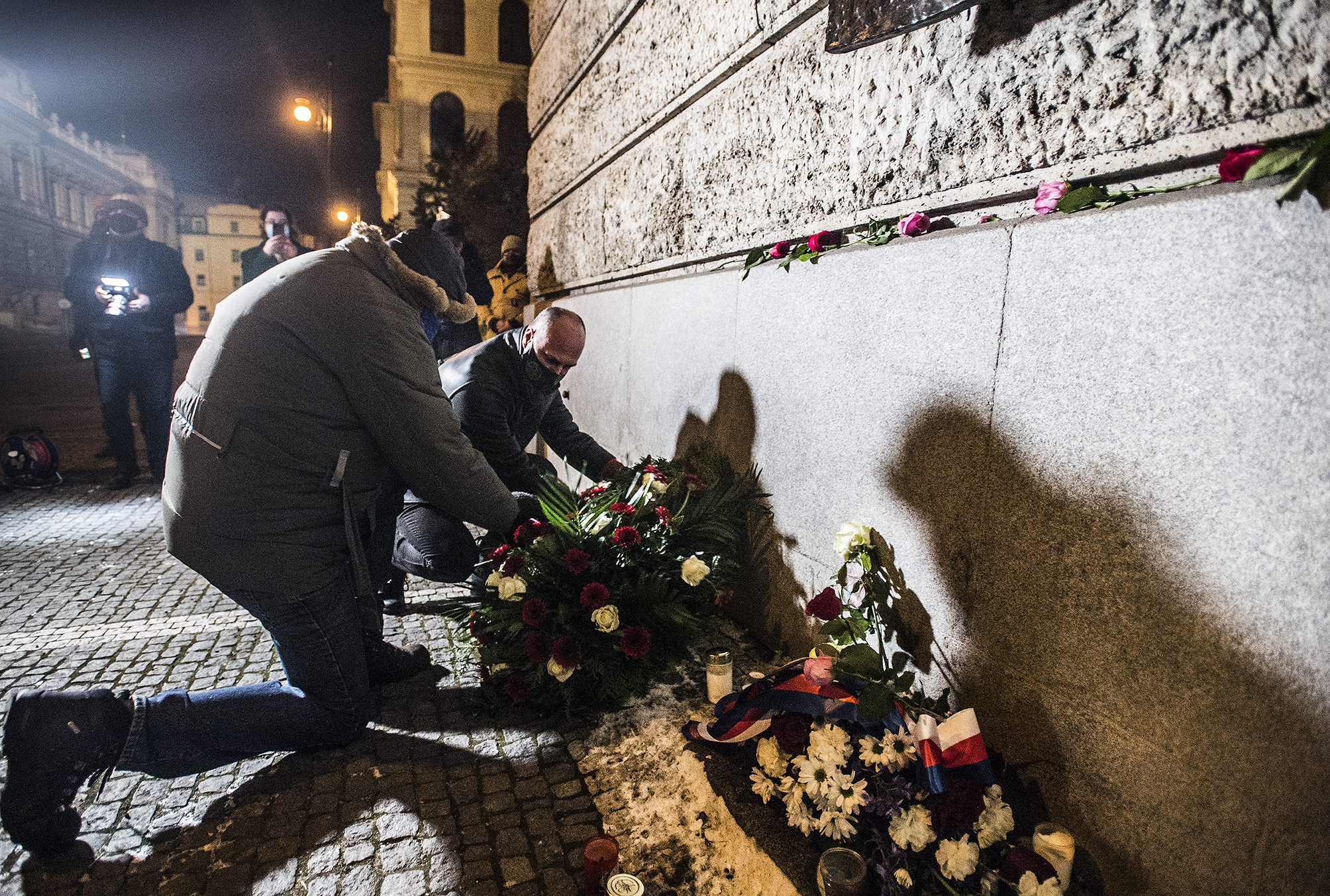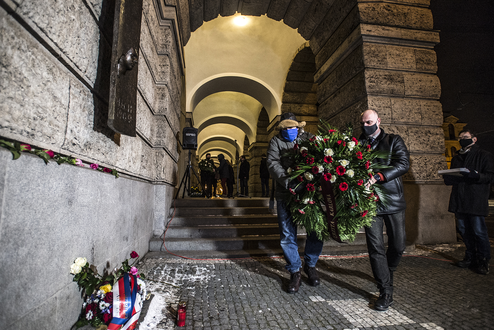 On Saturday, 16 January 2021, representatives of the Faculty of Arts, along with students and members of student organisations, met at the square that now bears Palach’s name, to remember his deed 52 years on. Attendees wore face masks because of the continuing coronavirus threat. CU Vice-Rector Jan Royt and Questor Tomáš Horáček laid wreathes at the memorial to Jan Palach in the inner courtyard at Charles University's Carolinum building.