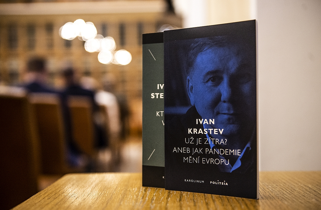 Ivan Krastev at CU's Karolinum Bookshop with Czech editions of his work including The Light that Failed co-written with Stephen Holmes.