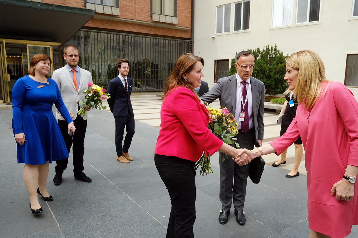 From left to right: MEPs Laura Ferrara and Jan Olbrycht, EP President Roberta Metsola, MEP Jan Zahradil, CU's Lenka Rovná and Martin Číhák.