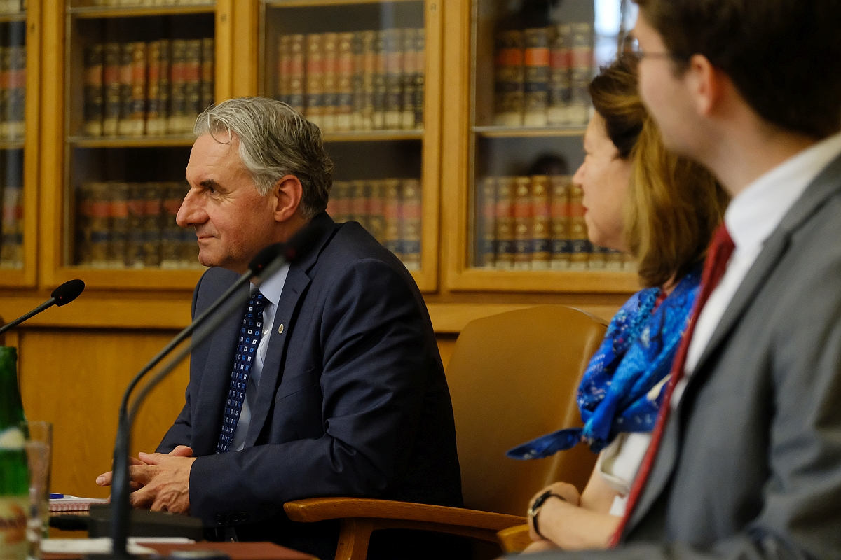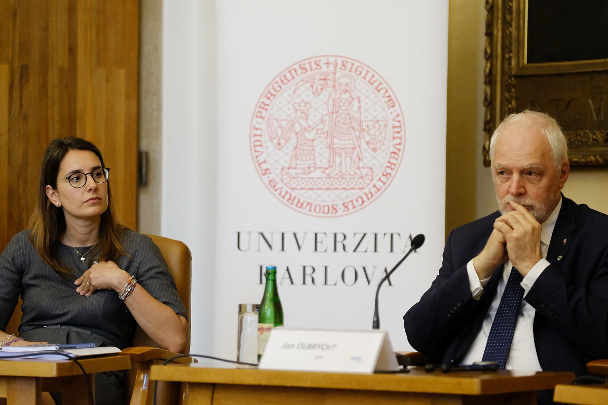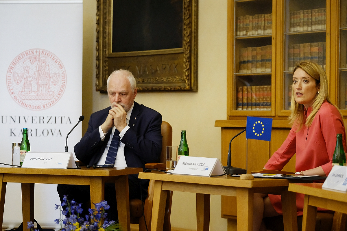 Charles University’s Lenka Rovná spoke first, welcoming Rector Milena Králíčková, who in turn (along with student representative Martin Čihák in the role of moderator) introduced EP President Metsola to a hall packed with both fresh-faced first years as well as more seasoned PhD students. She thanked Roberta Metsola and other speakers present (MEPs from Italy, Czechia and Poland – Laura Ferrara, Jan Zahradil and Jan Olbrycht, respectively), saying students as well as others in attendance, such as academics and journalists, were keen for the debate to begin.
