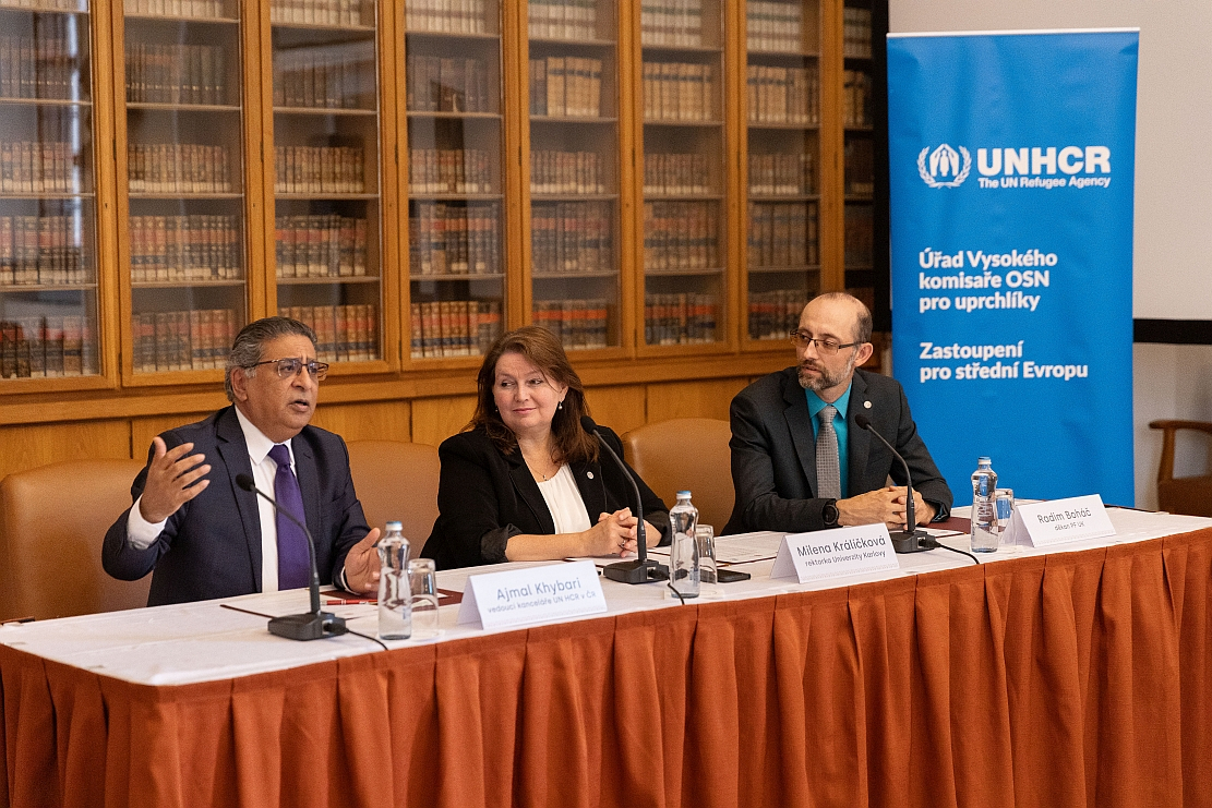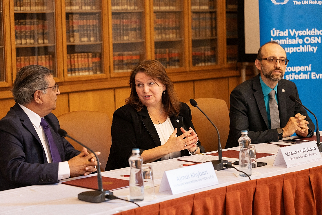 From left: Ajmal Khybari, the Head of UNHCR Office in Czechia; Charles University Rector Milena Králíčková; Faculty of Law Dean Radim Boháč.