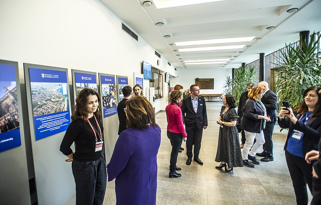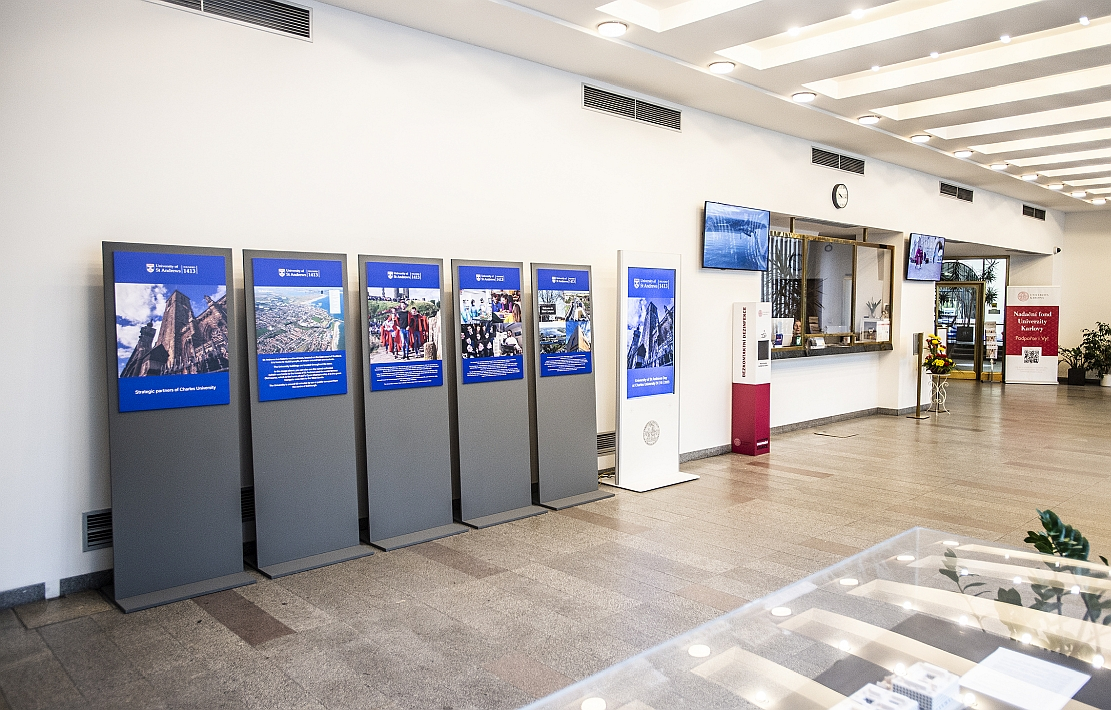 Charles University and delegates from the University of St Andrews had a chance to catch up this week in Prague, to reflect on past successes within their partnership agreement and build on further cooperation in the future. Representatives from both schools met at the foyer of the rectorate and historic Carolinum to open an exhibition about St Andrews before sitting down to a day of presentations and looking ahead.