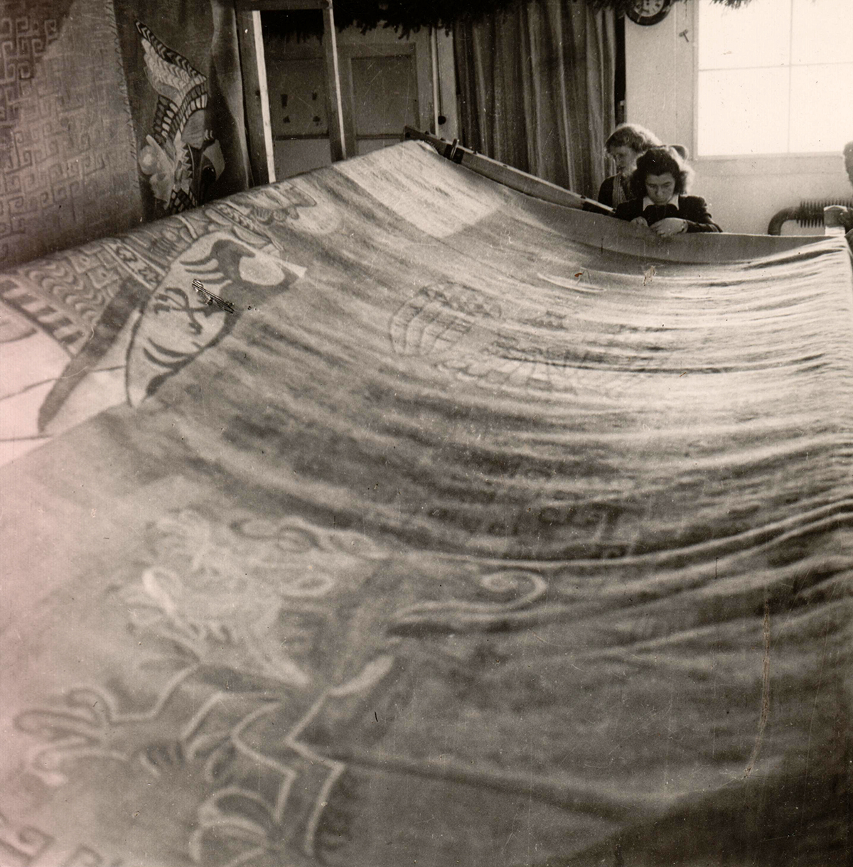 Production of university tapestry in the workshops in Jindřichův Hradec. Marie Teinitzerová herself is present in the back on the left. PHOTO: State Regional Archive in Třeboň. Collection - Cultural and Historical Archive, inv. no. 747, carton no. 97, order no. 777.