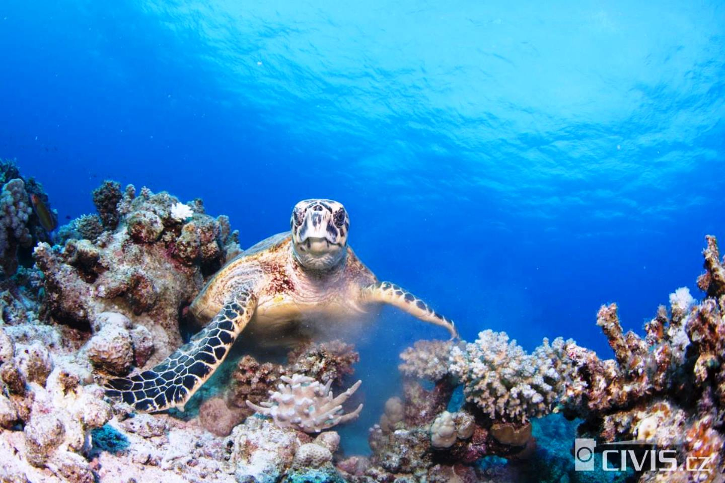 Hawksbill sea turtle (Eretmochelys imbricata) are large turtles that are critically endangered (Photo: Marcela Justiánová, www.morskezelvy.cz).