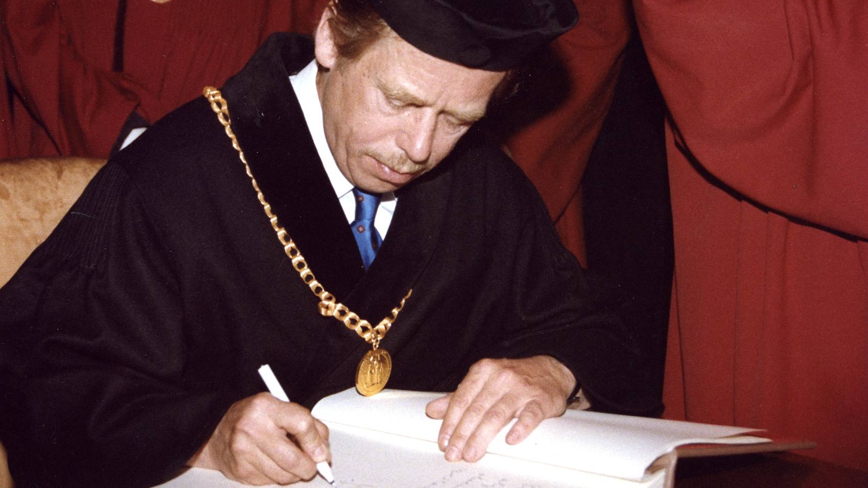 „Pánbůh nebo osud nebo dějiny tomu chtěly, že se tu stávám doktorem, aniž jsem tu řádně vystudoval…,“ zmiňoval Václav Havel ve svém děkovném projevu, když v roce 1990 přebíral ve Velké aule Univerzity Karlovy čestný doktorát. Byl první osobností, jíž byl udělen už na svobodné půdě univerzity.