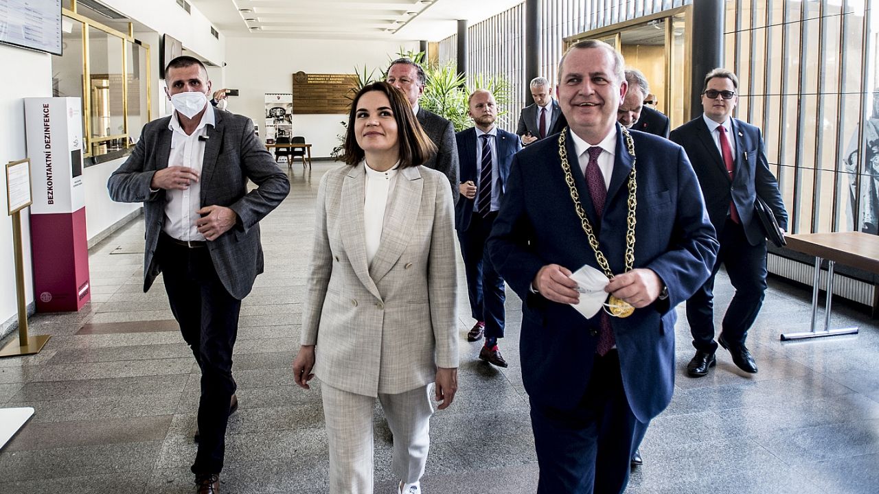 Belarusian opposition leader Sviatlana Tsikhanouskaya is on a four-day visit to the Czech Republic. The leader was invited to Prague by the speaker of the Senate, Miloš Vystrčil. On Monday afternoon, she and her team met for talks at Charles University. On the agenda: ways to help students and to support democracy in Belarus.
