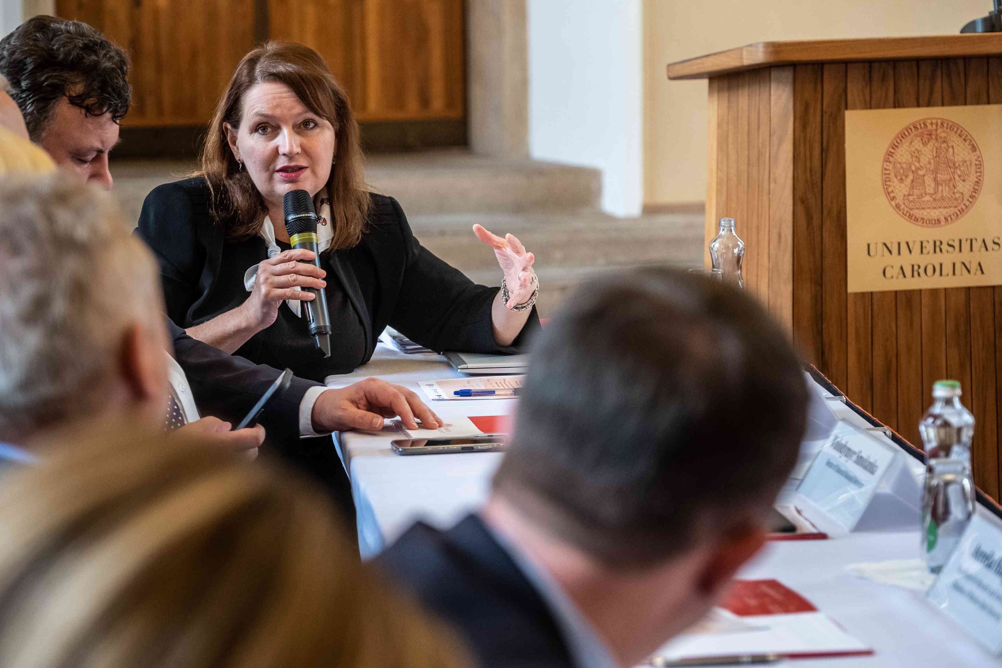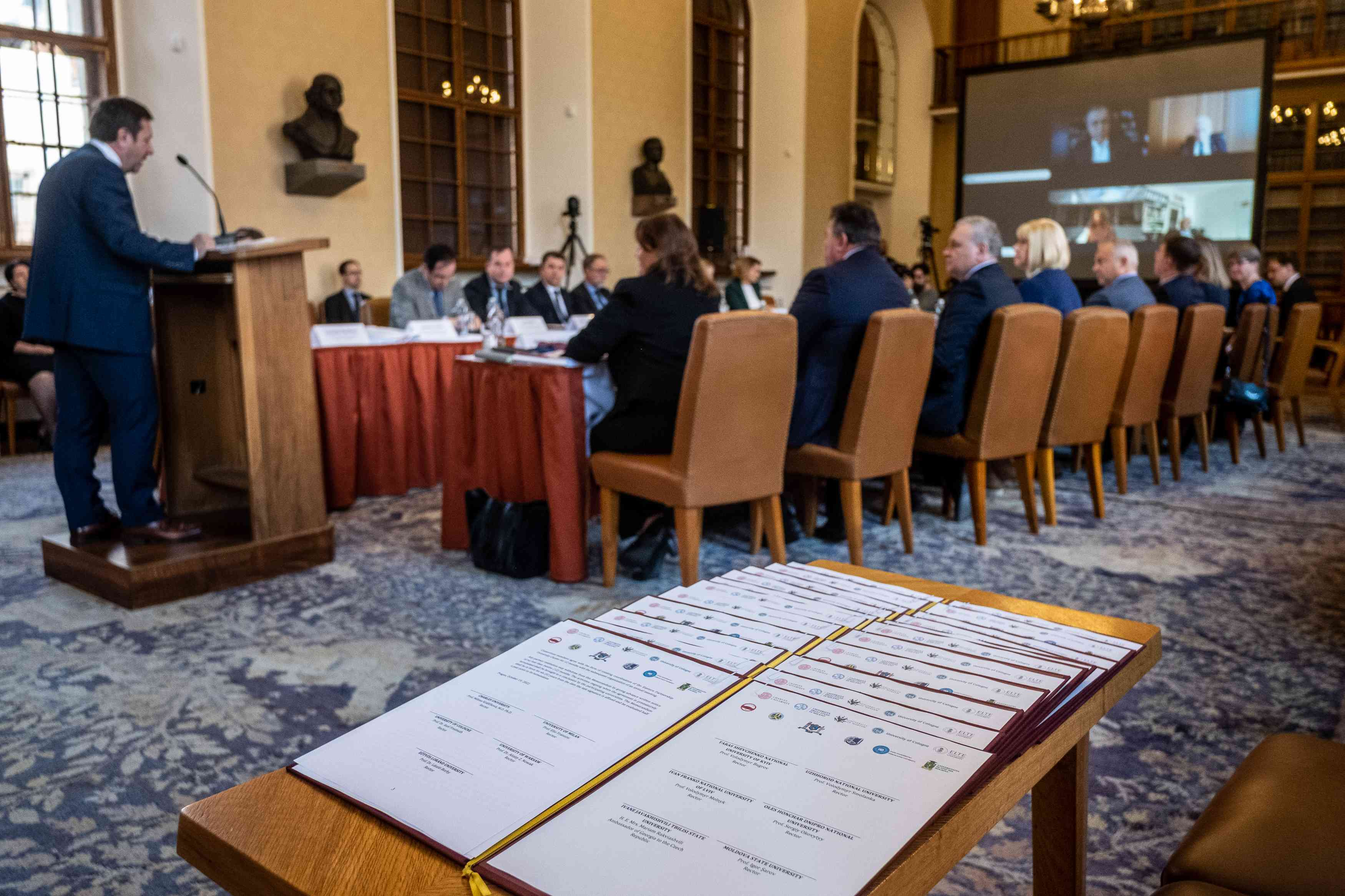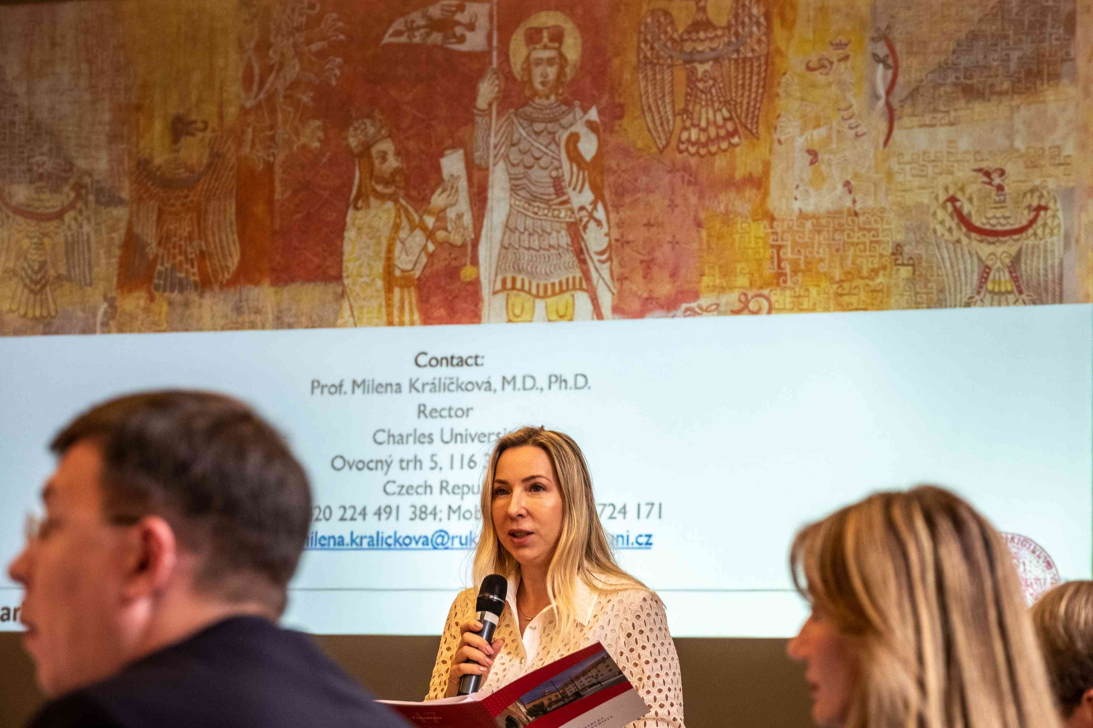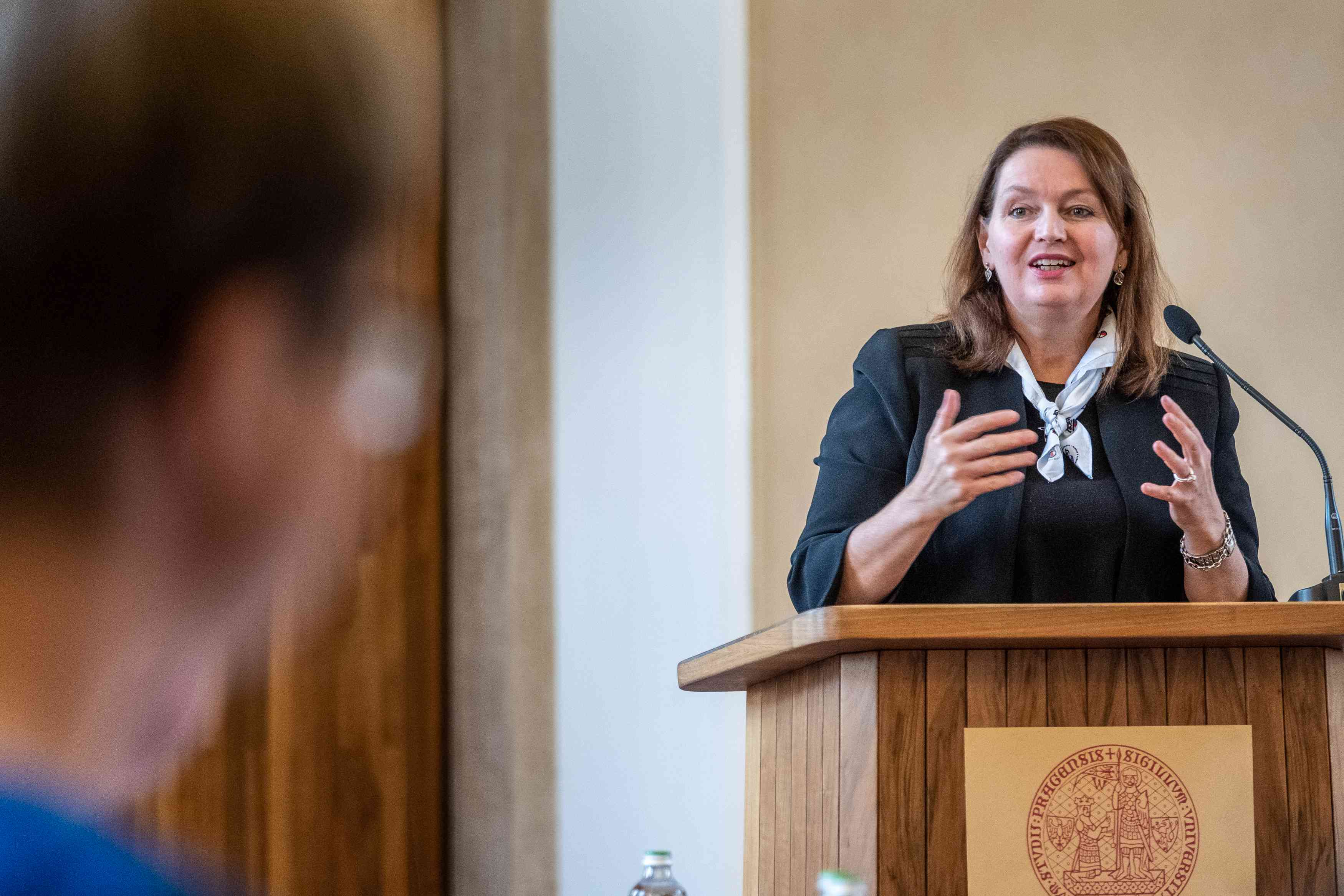 “I am extremely glad that it is Charles University that is behind the creation of this initiative. Thanks to projects like this, it is becoming a truly open space that supports students across countries and cultures. At the same time, I believe that this initiative will contribute in no small measure to the dissemination of European academic practices,” Milena Králíčková, the rector of Charles University pictured speaking at the lectern, said in a communiqué on the new consortium.
