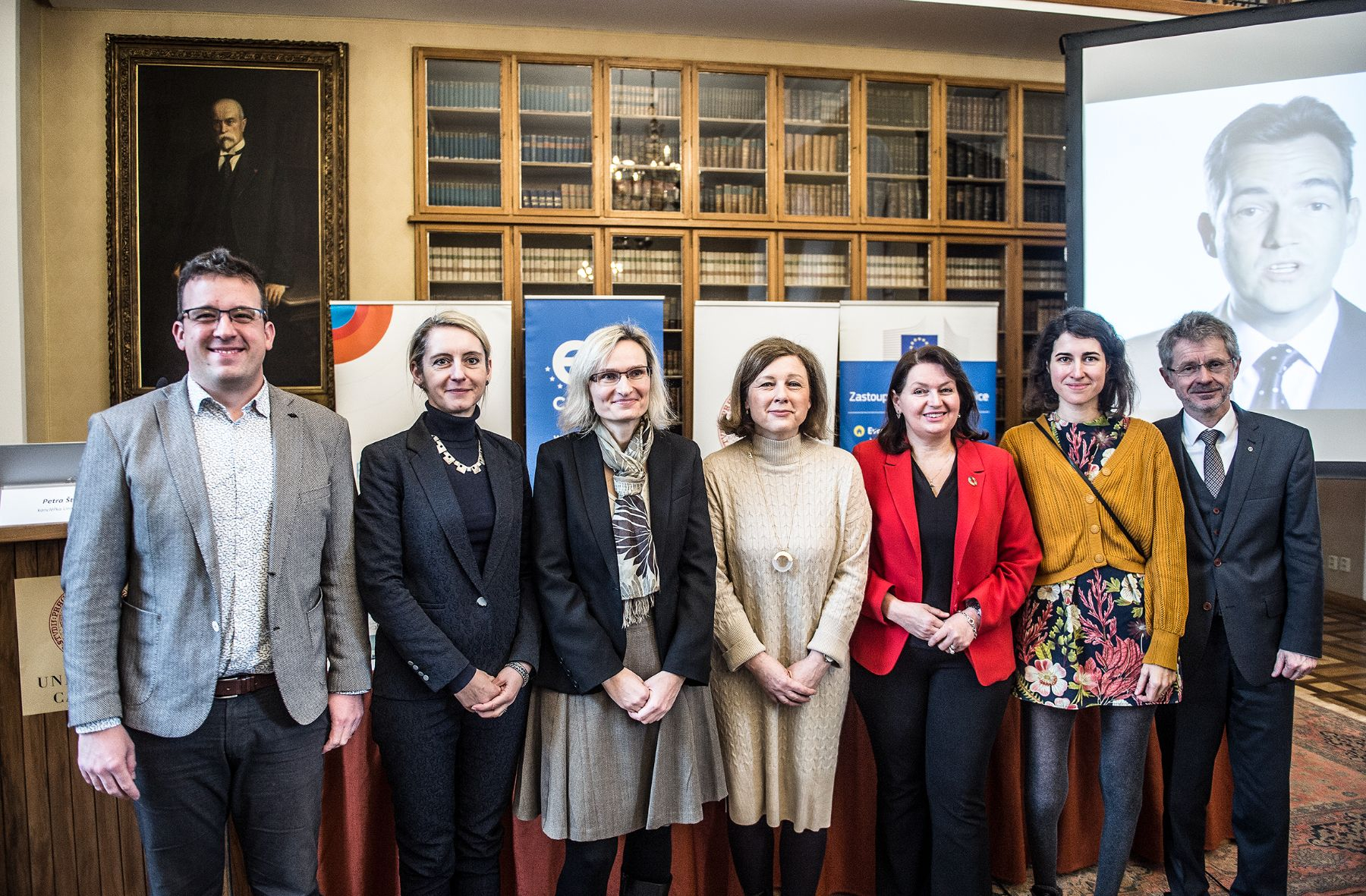 Na Univerzitě Karlově se setkali mimo jiné i eurokomisařka Věra Jourová (v béžovém) s rektorkou Milenou Králíčkovou (v červeném).