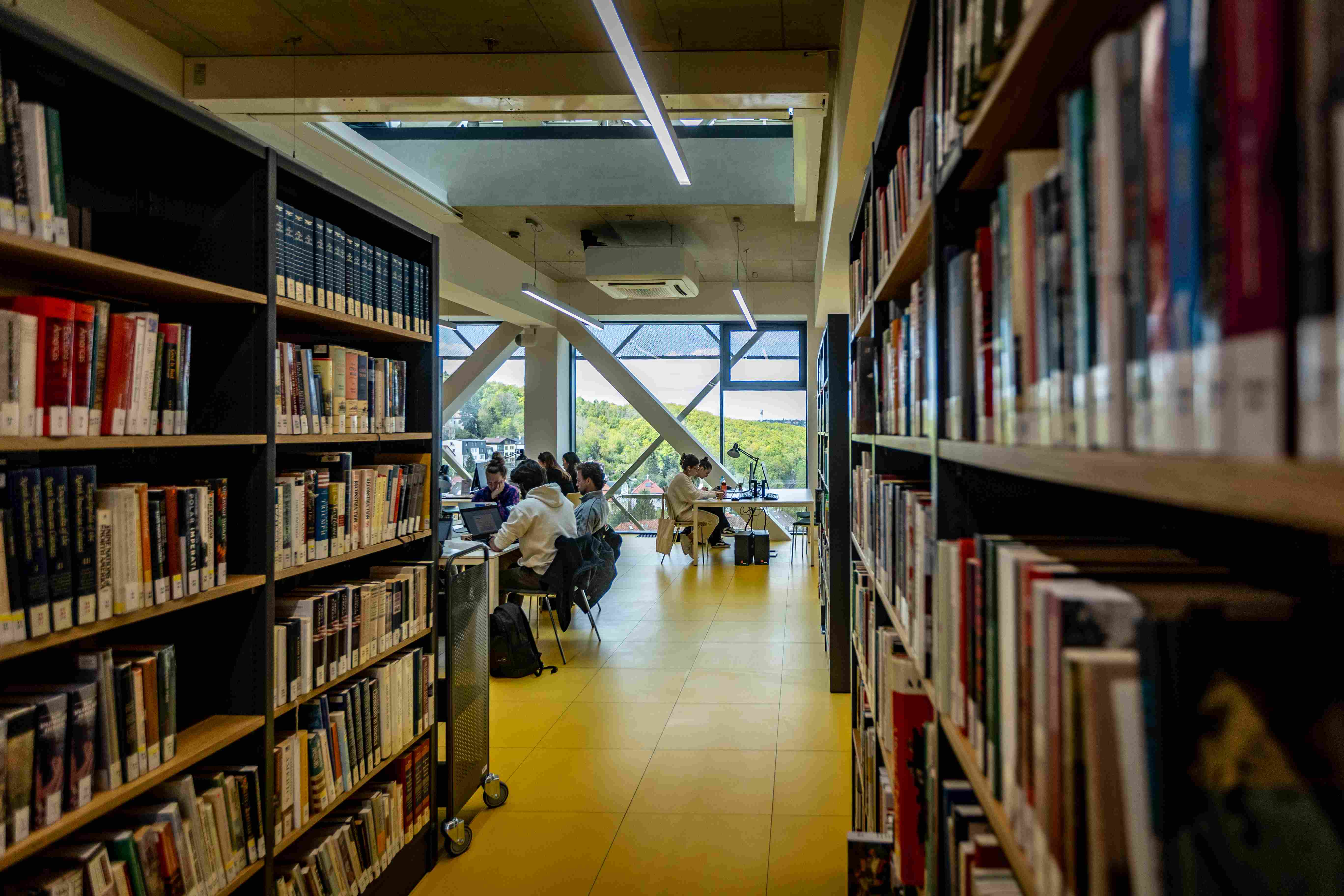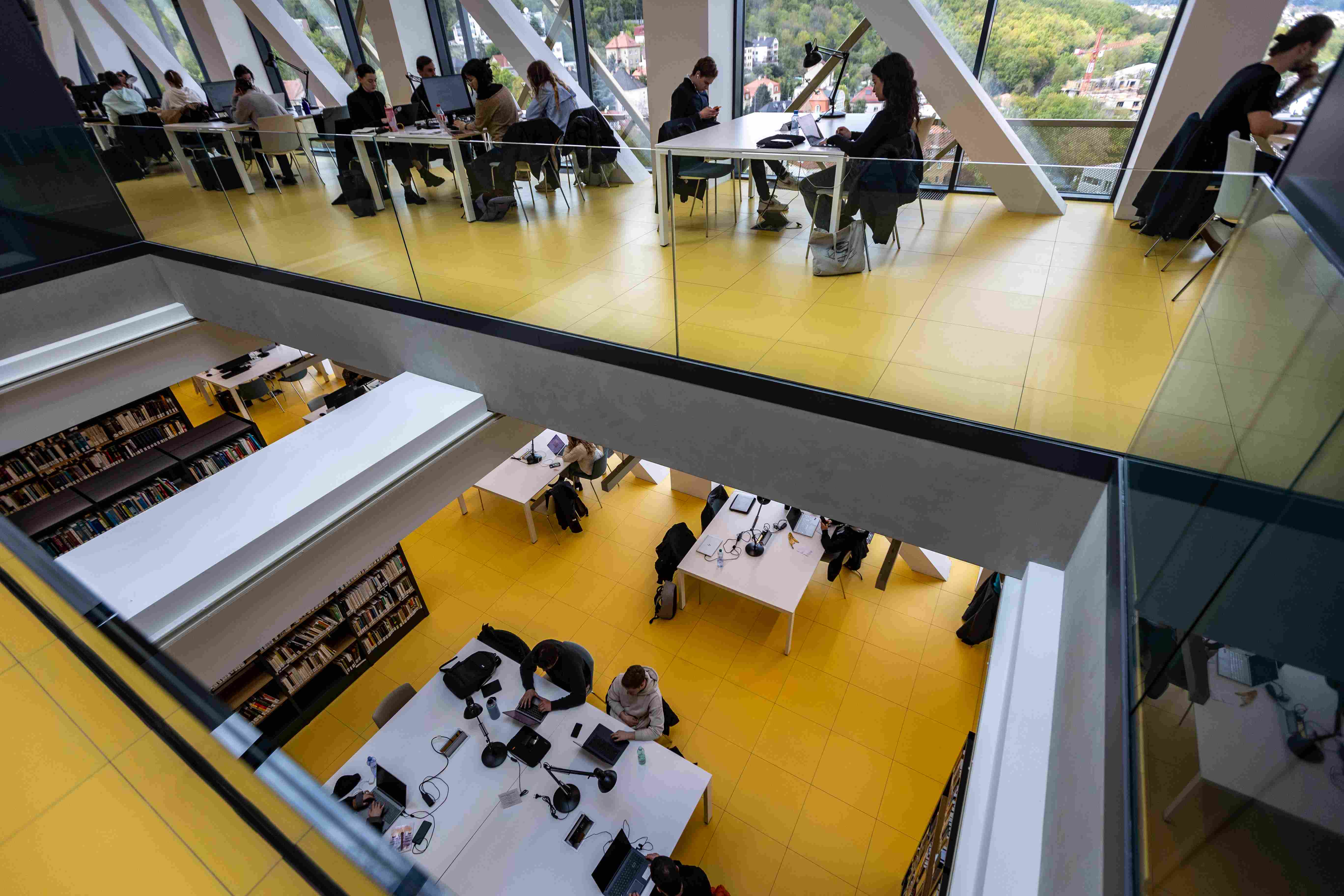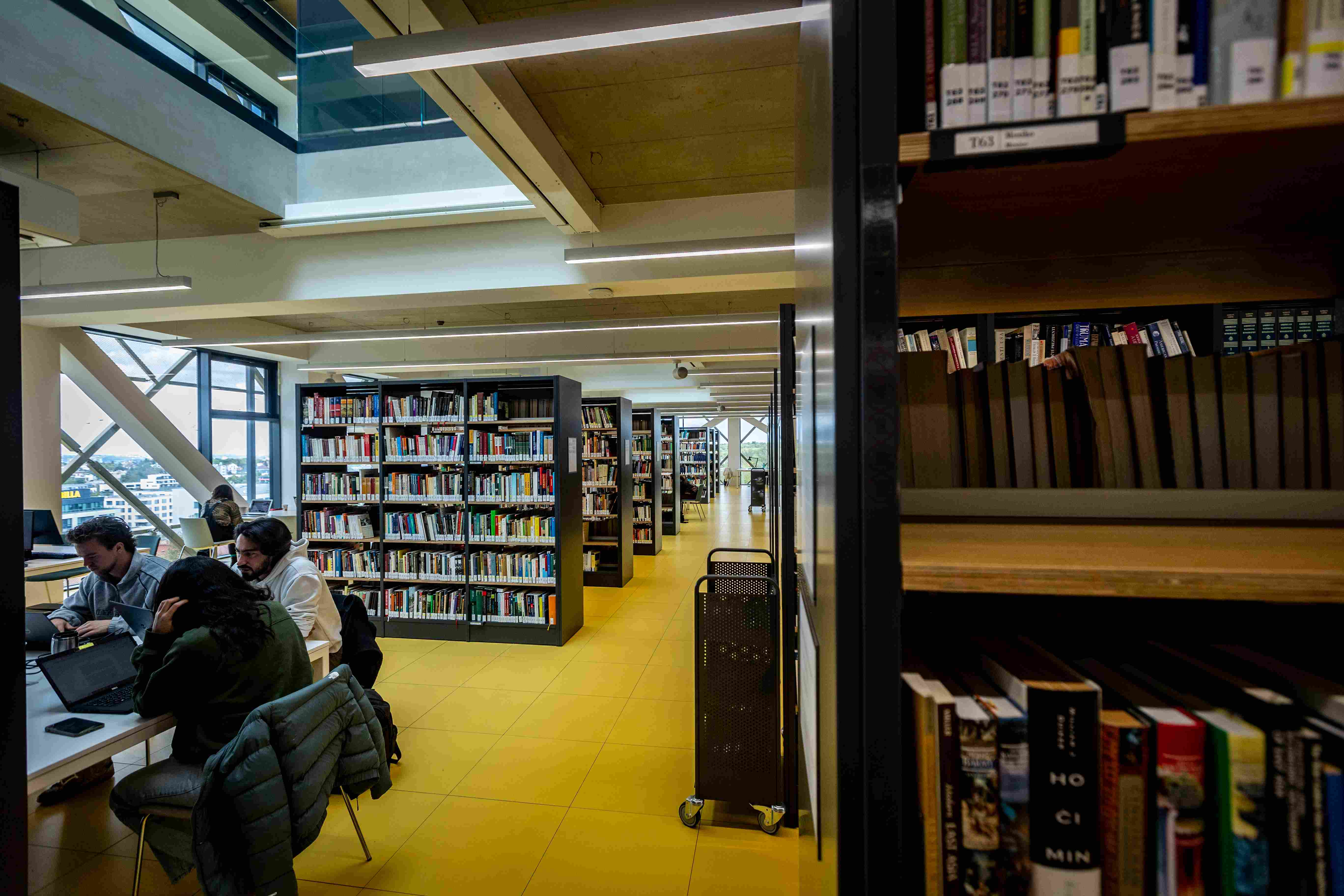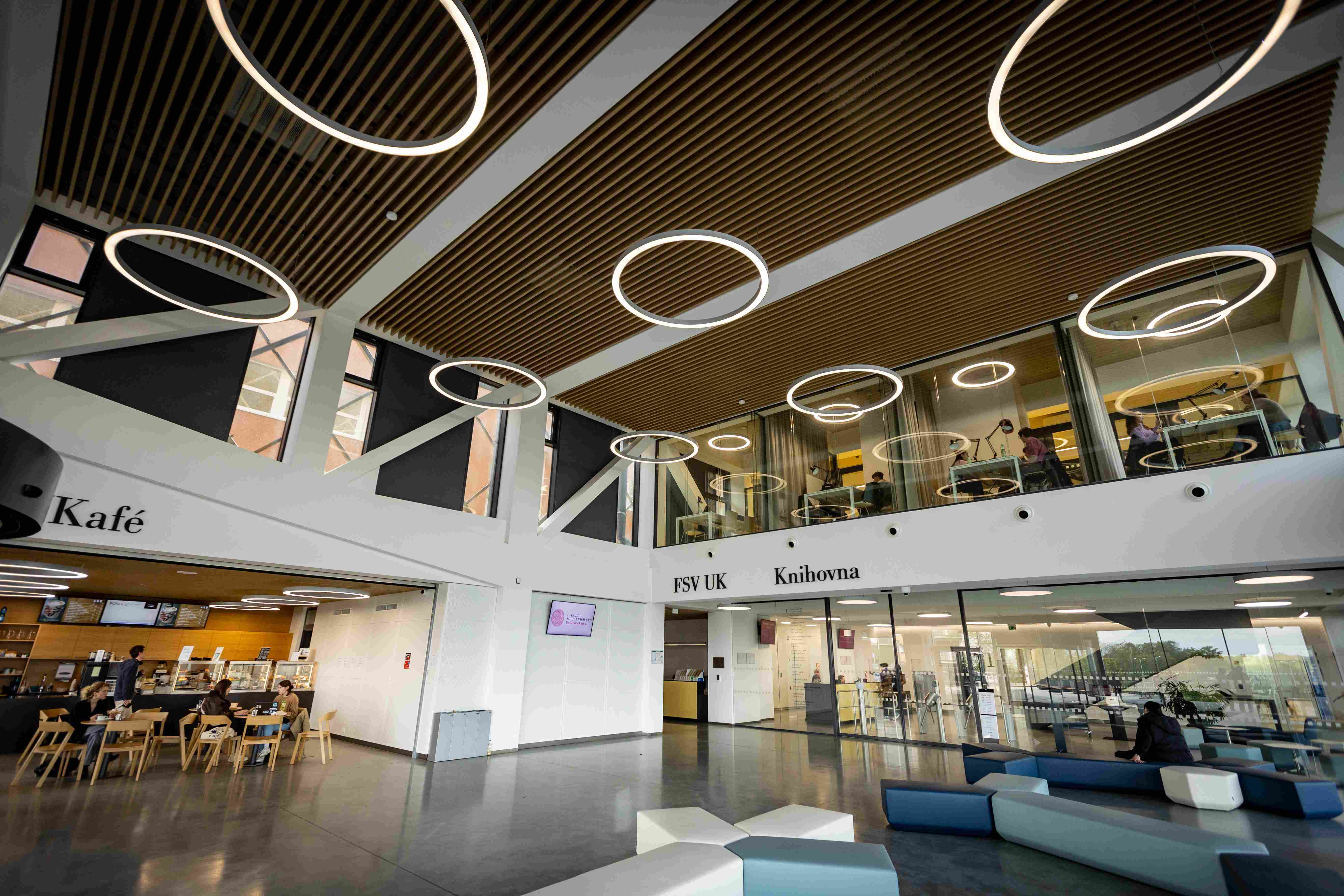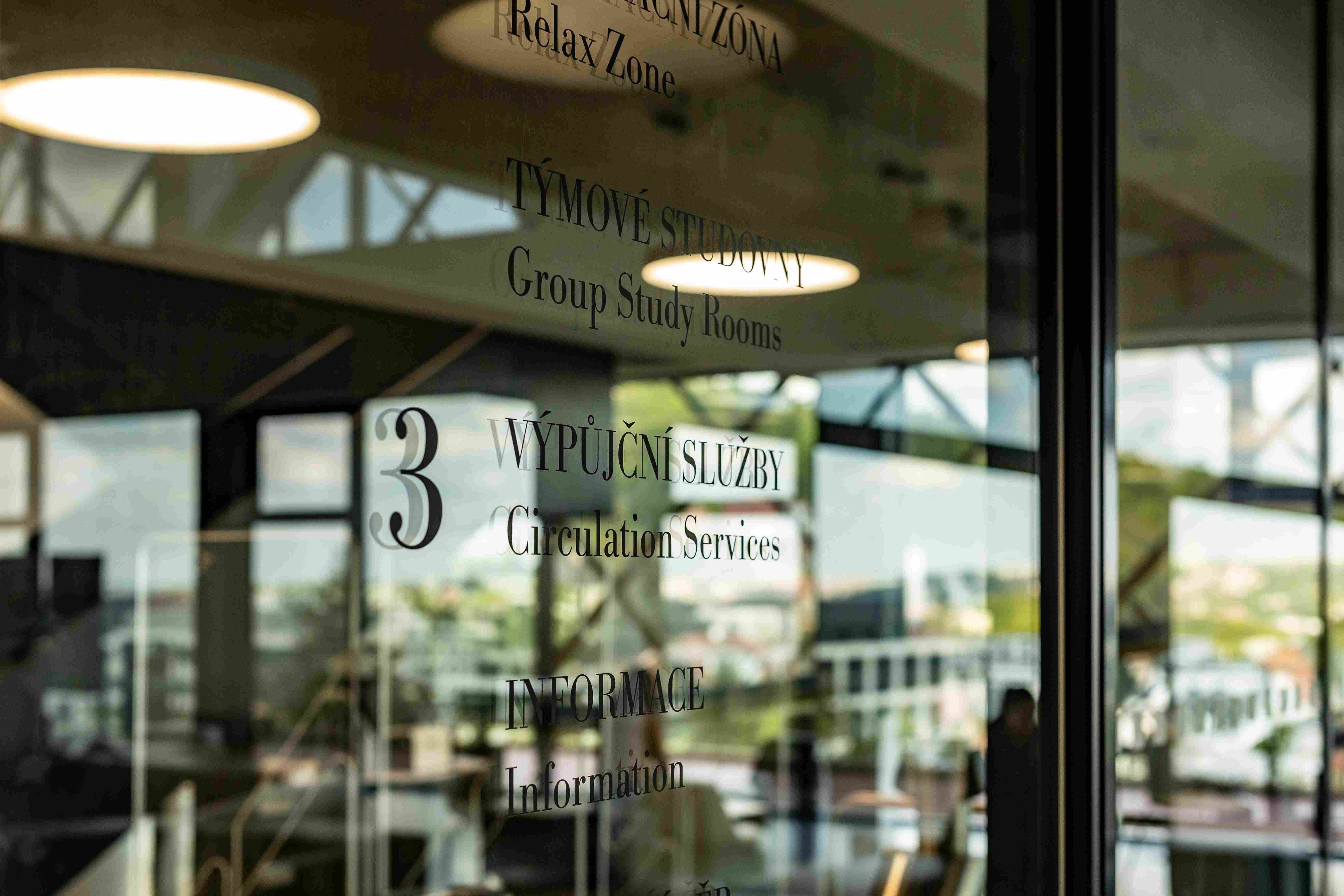 Upozorňuje na to hned u vchodu, kde je příjemná odpočinková platforma s lavičkami i zelení, odevzdávkový box na knížky. Uvnitř v atriu pak studentstvo najde příjemné zázemí; po levé straně útulné bistro, po pravé zase posezení (samozřejmě s rychlou univerzitní wi-fi).