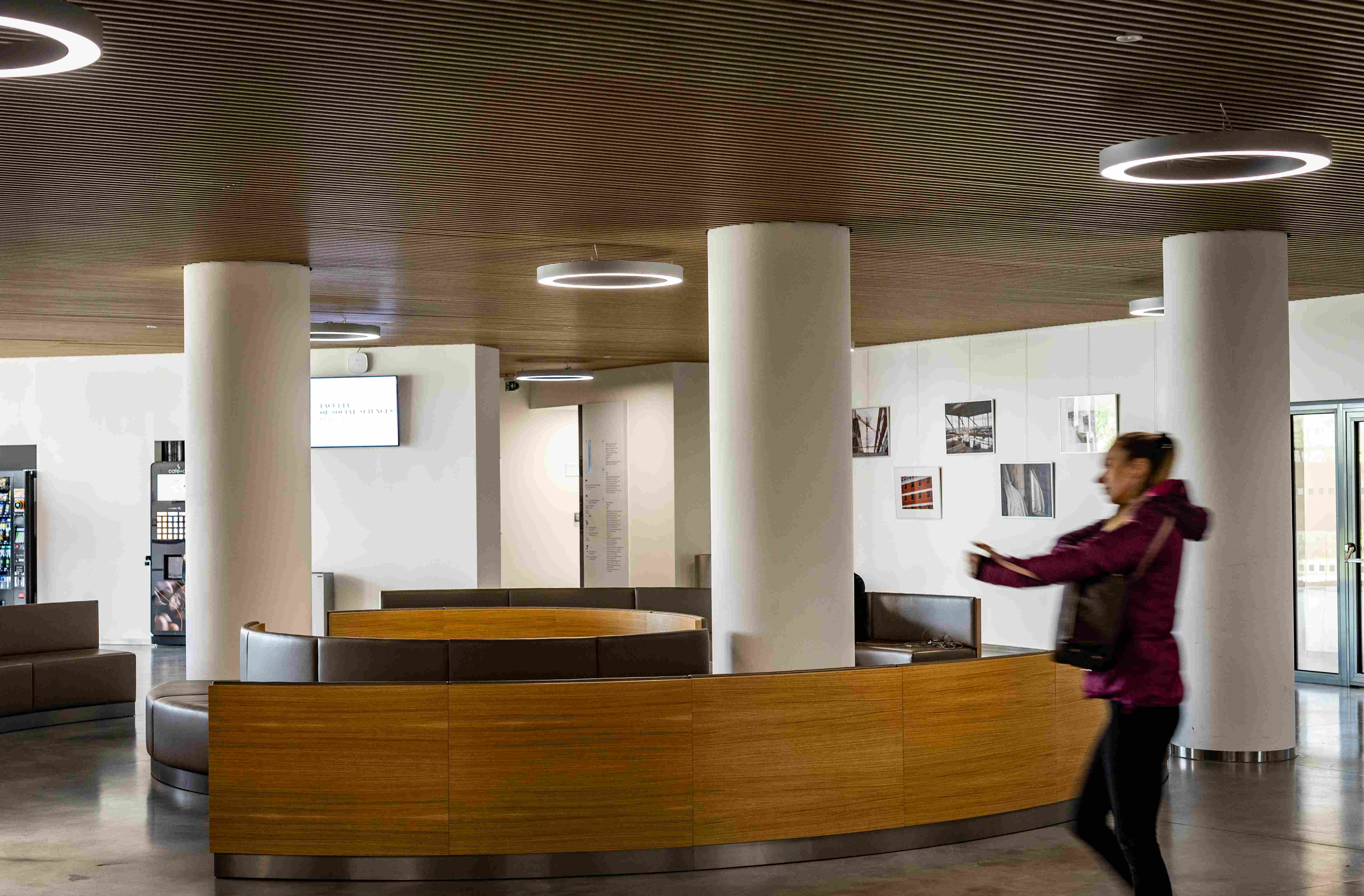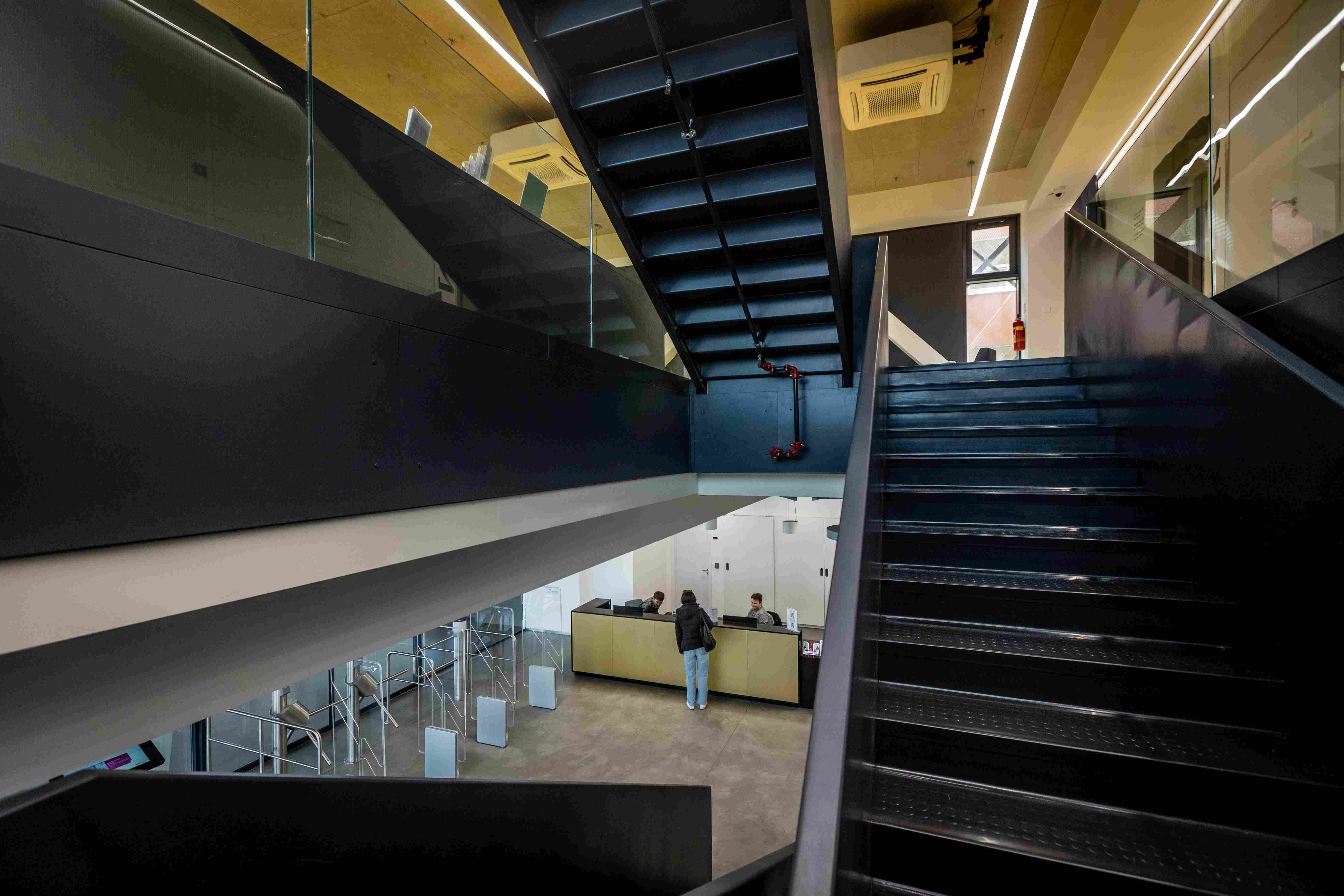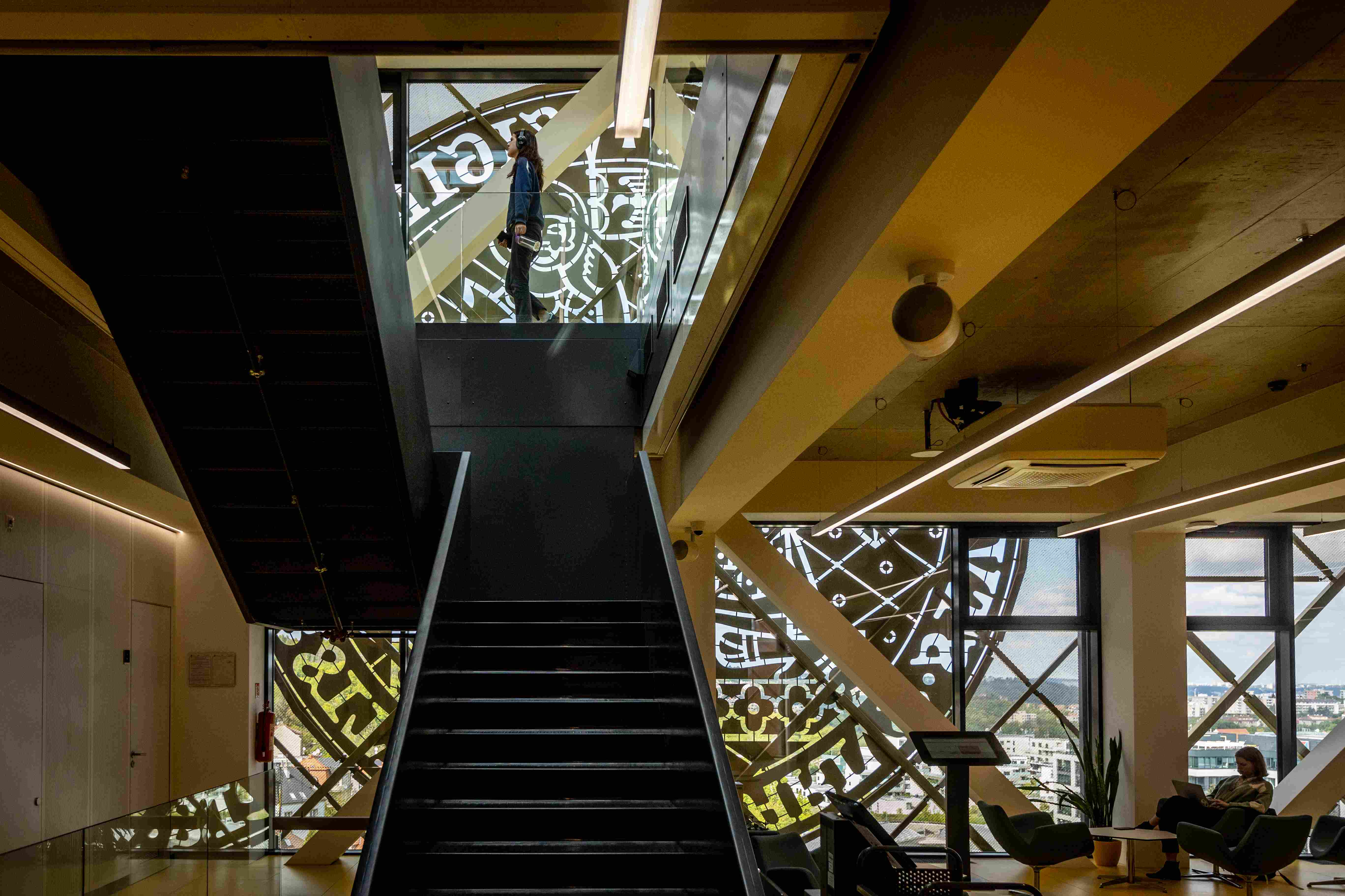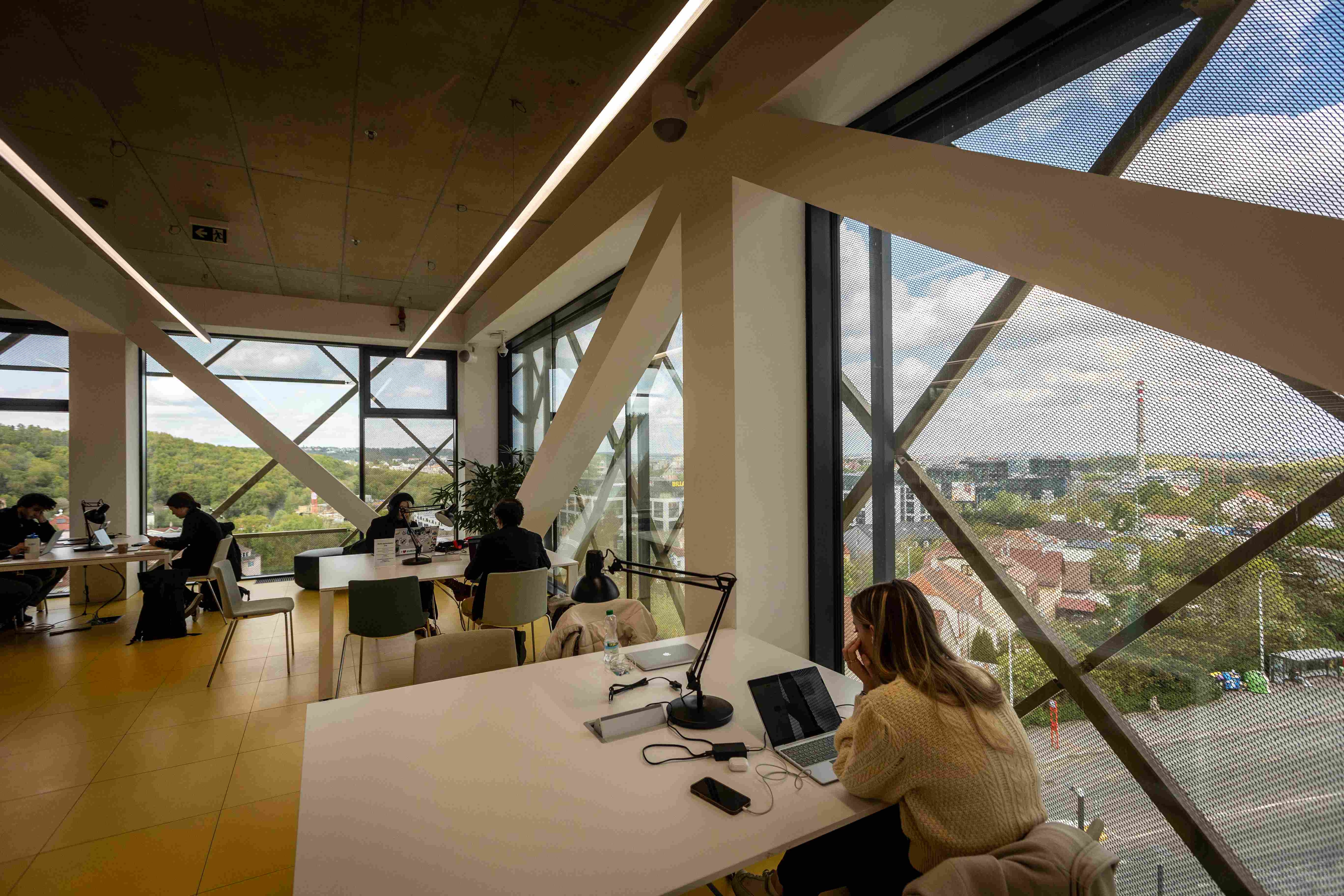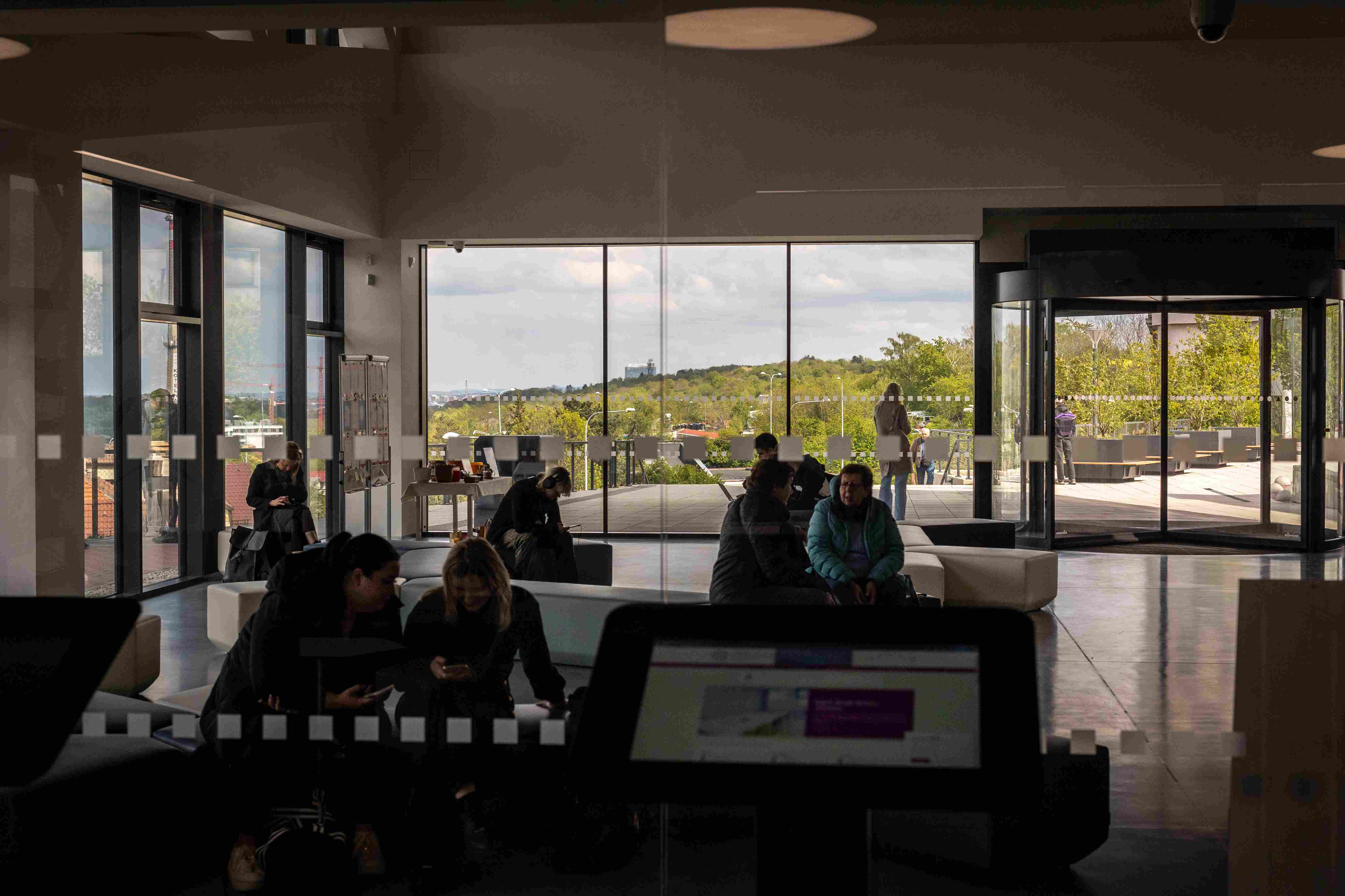 Upozorňuje na to hned u vchodu, kde je příjemná odpočinková platforma s lavičkami i zelení, odevzdávkový box na knížky. Uvnitř v atriu pak studentstvo najde příjemné zázemí; po levé straně útulné bistro, po pravé zase posezení (samozřejmě s rychlou univerzitní wi-fi).