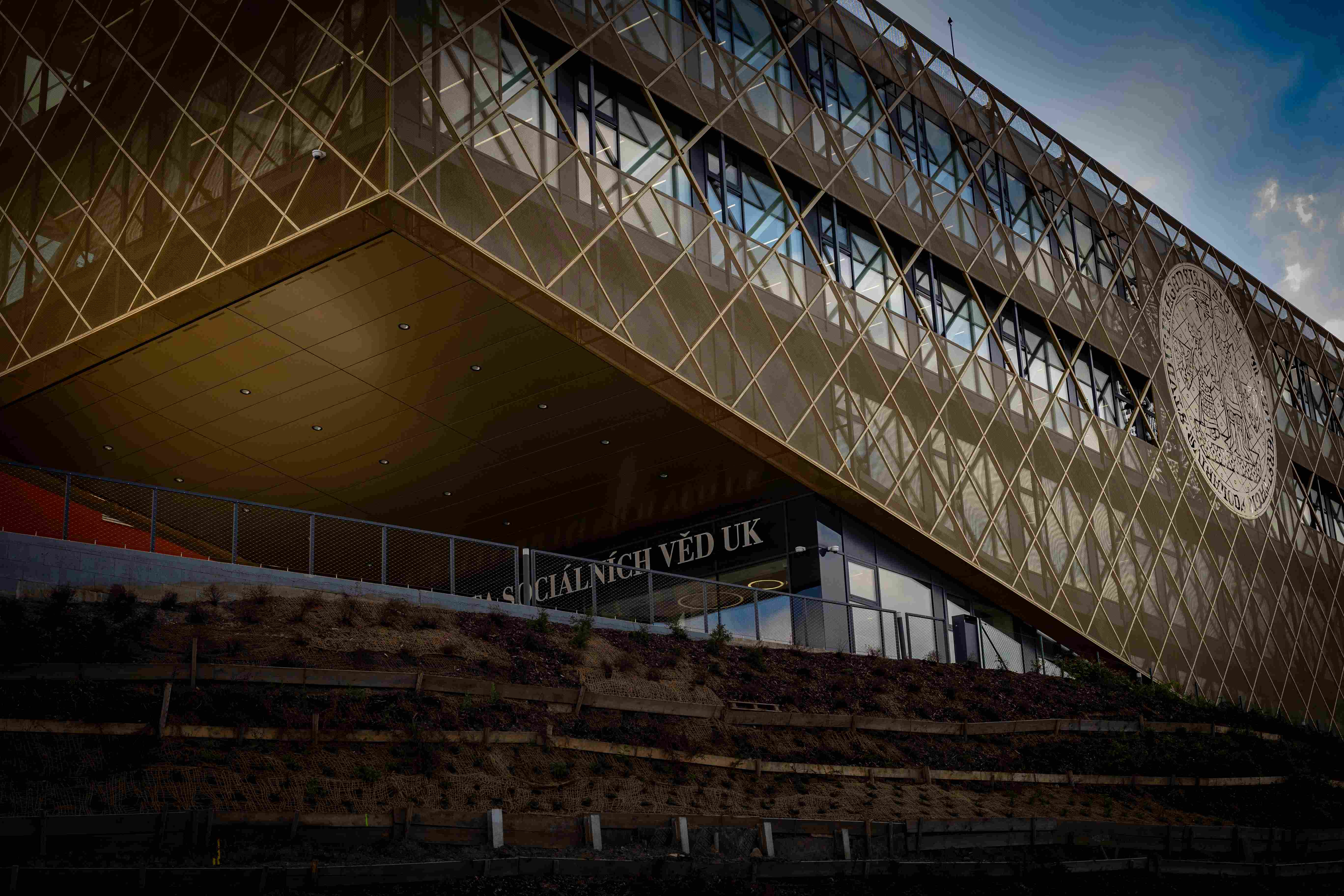 Dominantou univerzitního vršku, kde dříve mívaly částečně zázemí i FHS UK a FF UK, je vytrčená „kostka“ nové budovy do prostoru. Hlavní architektkou projektu se stala Miroslava Tylšová ze studia Apris 3M. Při projektování nové budovy kladli architekti dle tiskové zprávy FSV UK důraz „i na podmínky udržitelnosti a energetickou efektivitu“. Stavbu pokrývá zlatý plášť z takzvaného tahokovu, který objekt zastiňuje a spolu se systémem speciálních nachlazovacích stropů přispívá k větší tepelné pohodě uvnitř. Na plášti je rovněž vyobrazena univerzitní bula – s průměrem 7,6 metru se jedná o největší znak UK použitý v Praze.