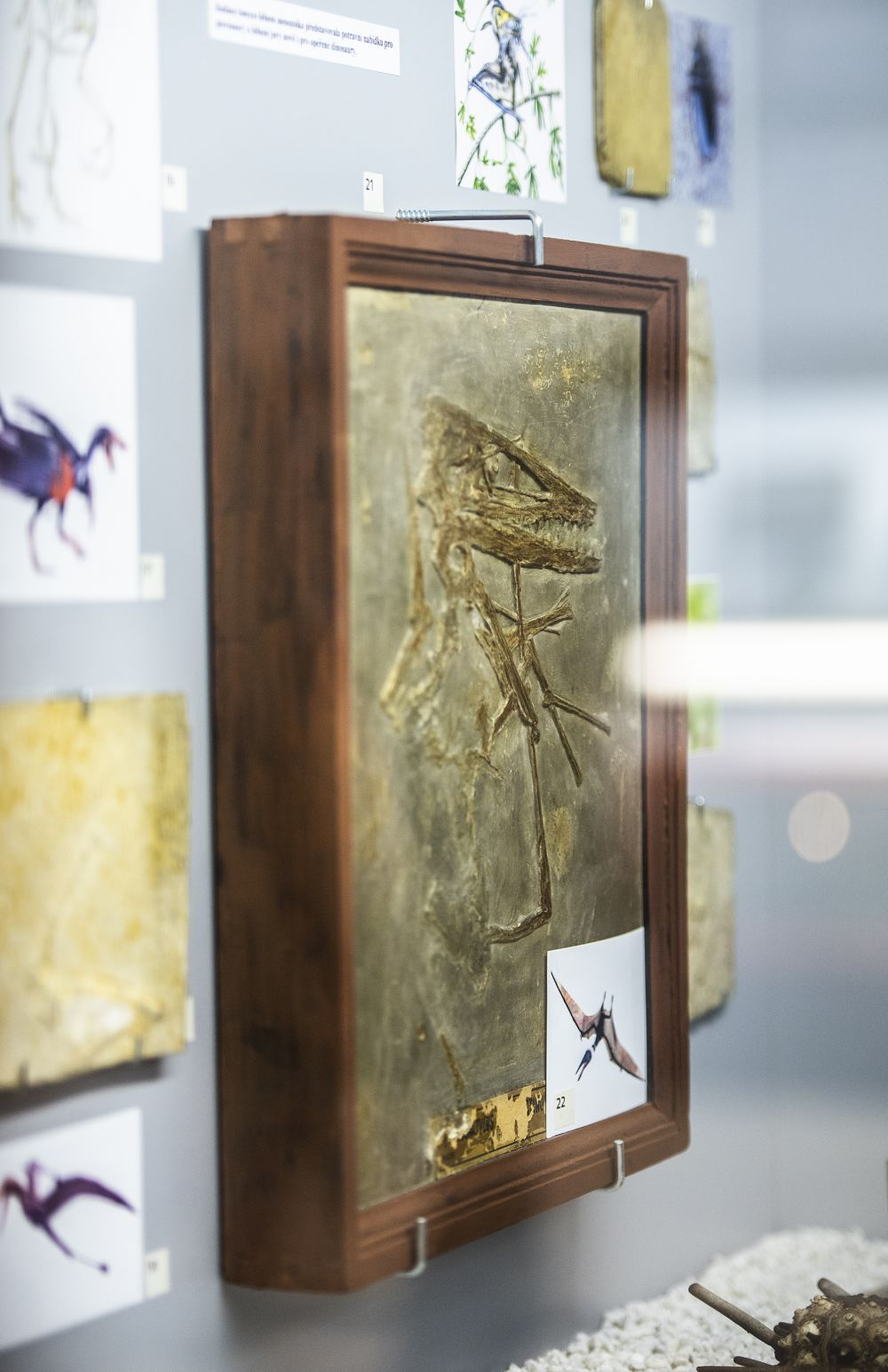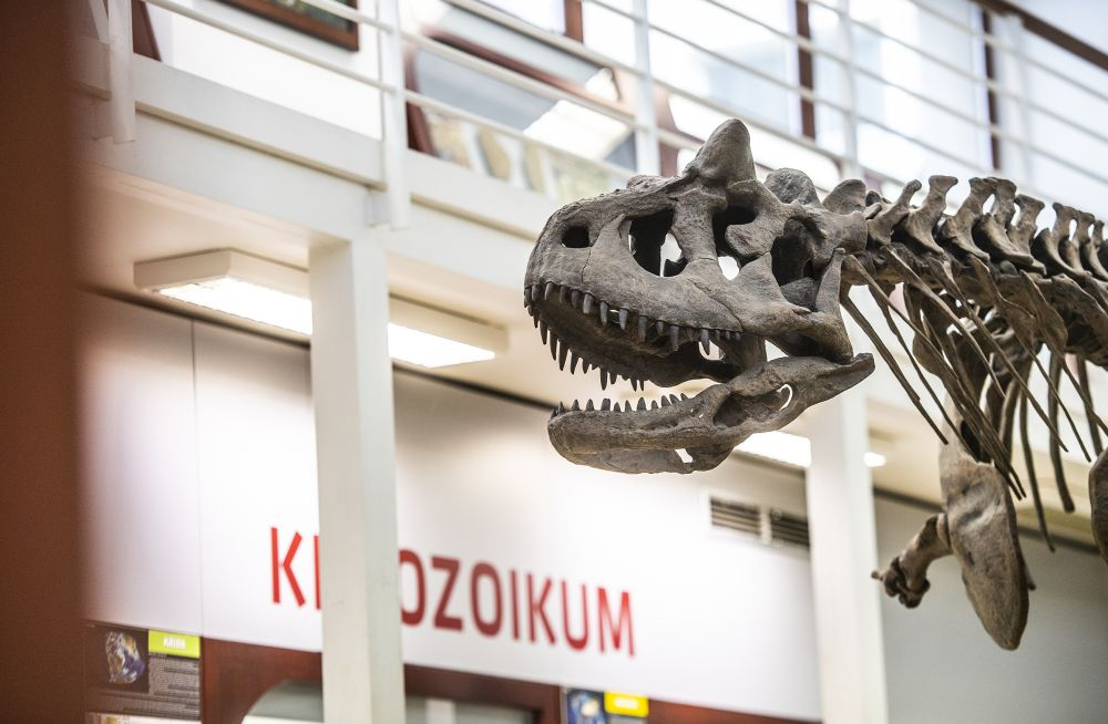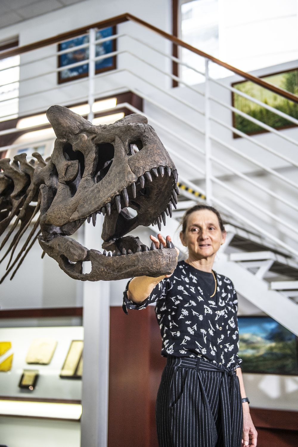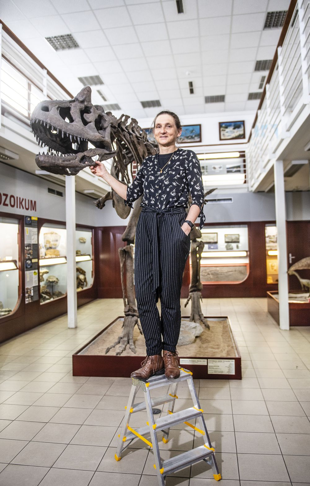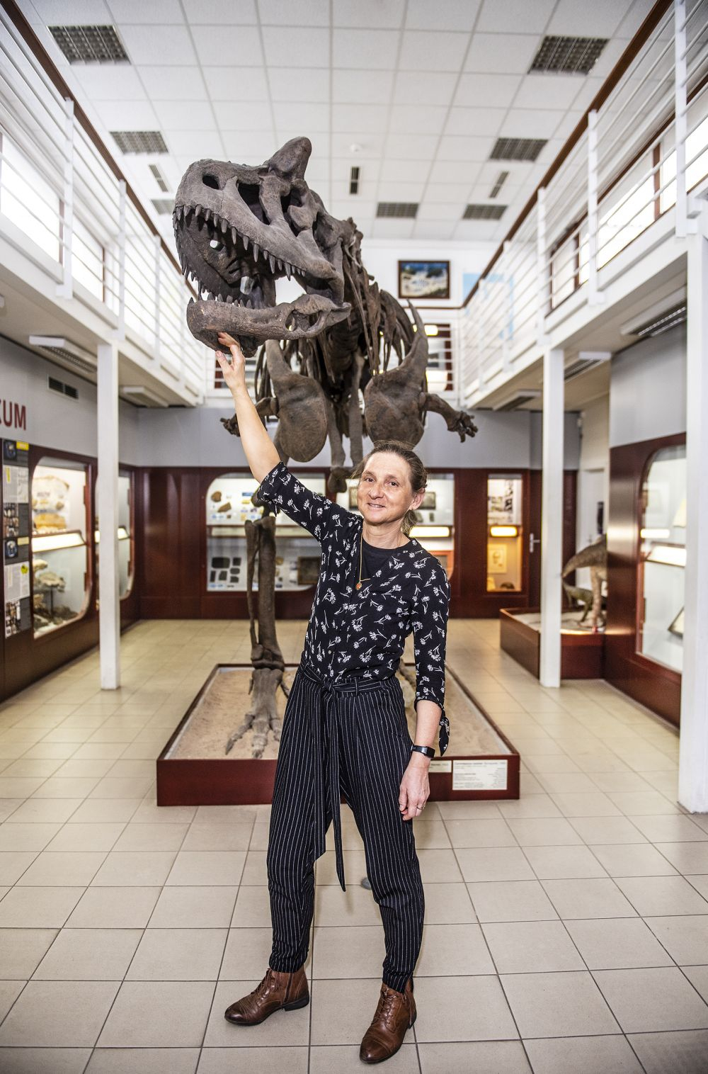 Katarína Holcová s replikou dinosauří kostry Cornotaura v univerzitním Chlupáčovu muzeu historie Země.