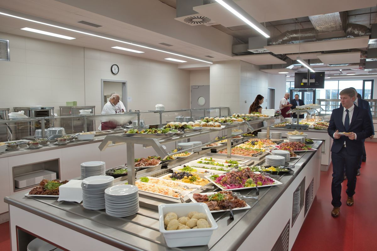 Denně zdejší kuchyně vyexpeduje až tisíc porcí obědů, přičemž nabídka zahrnuje vedle polévky a tří hlavních jídel – jedno z nich je vegetariánské – i omezený počet minutek a rovněž teplý a studený bufet. Kdo si ani tak nevybere, může se přímo nad jídelnou občerstvit v kavárně. Spolu se studenými a teplými nápoji – k mání je zde pravidelně pizza, wrap nebo sendviče či obložené housky – nabídka platí ve všední dny až do 18 hodin!