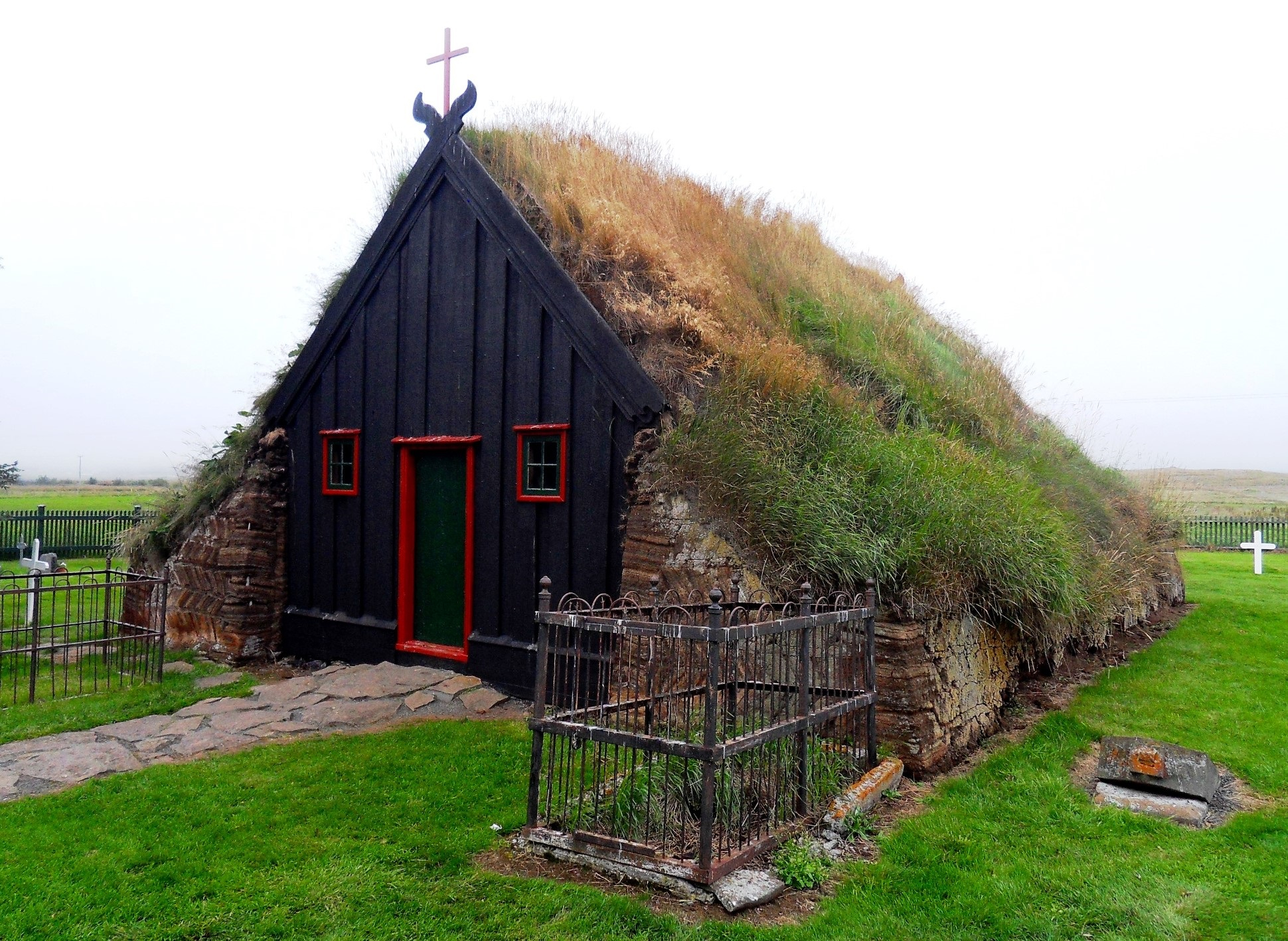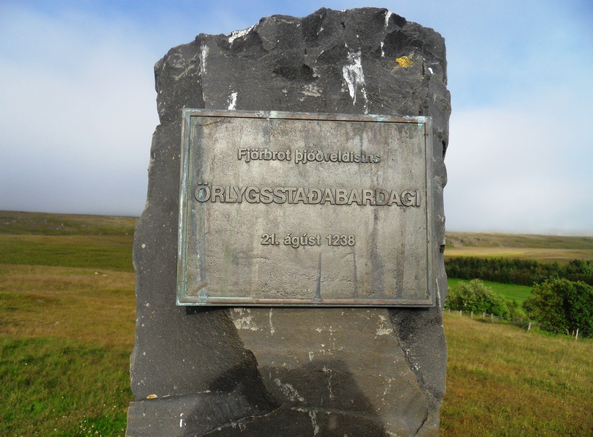 Vlevo památník bitvy na Örlygsstaðech, rozhodující události „věku Sturlungů“.