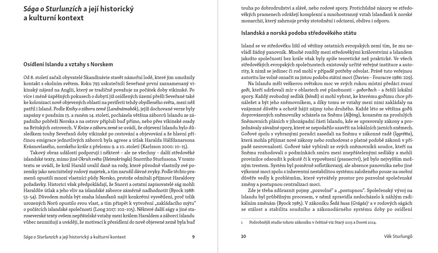 Práci na samotném překladu předcházel badatelský zájem o středověký Island. Ságy o „věku Sturlungů“ zkoumám v rámci své akademické činnosti na Filozofické fakultě UK už přibližně deset let. Na jejich překlad jsem pomýšlela už dlouho, ale zpočátku to byla spíše výzva, na kterou jsem si moc netroufala. Po zvládnutí několika dalších překladatelských úkolů – kolektivního překladu „lživých ság“ (2015) pod vedením Jiřího Starého (rozhovor s ním přinášíme níže - pozn. red.) a překladu rodových ság s nadpřirozenými motivy, vydaných v knize Sám spatříš svět stínů (2018) – jsem se k tomu nakonec odhodlala. Samotná práce na Věku Sturlungů, od výběru textů přes zadání projektu u Grantové agentury UK až po finální redakční úpravy a vydání, trvala asi tři roky.