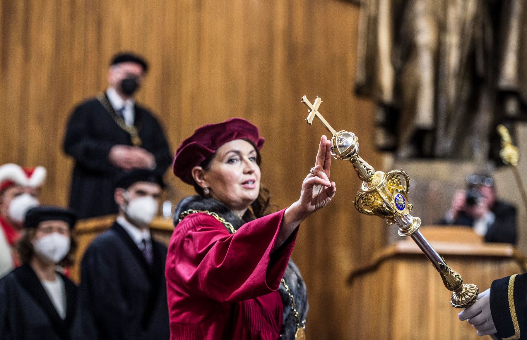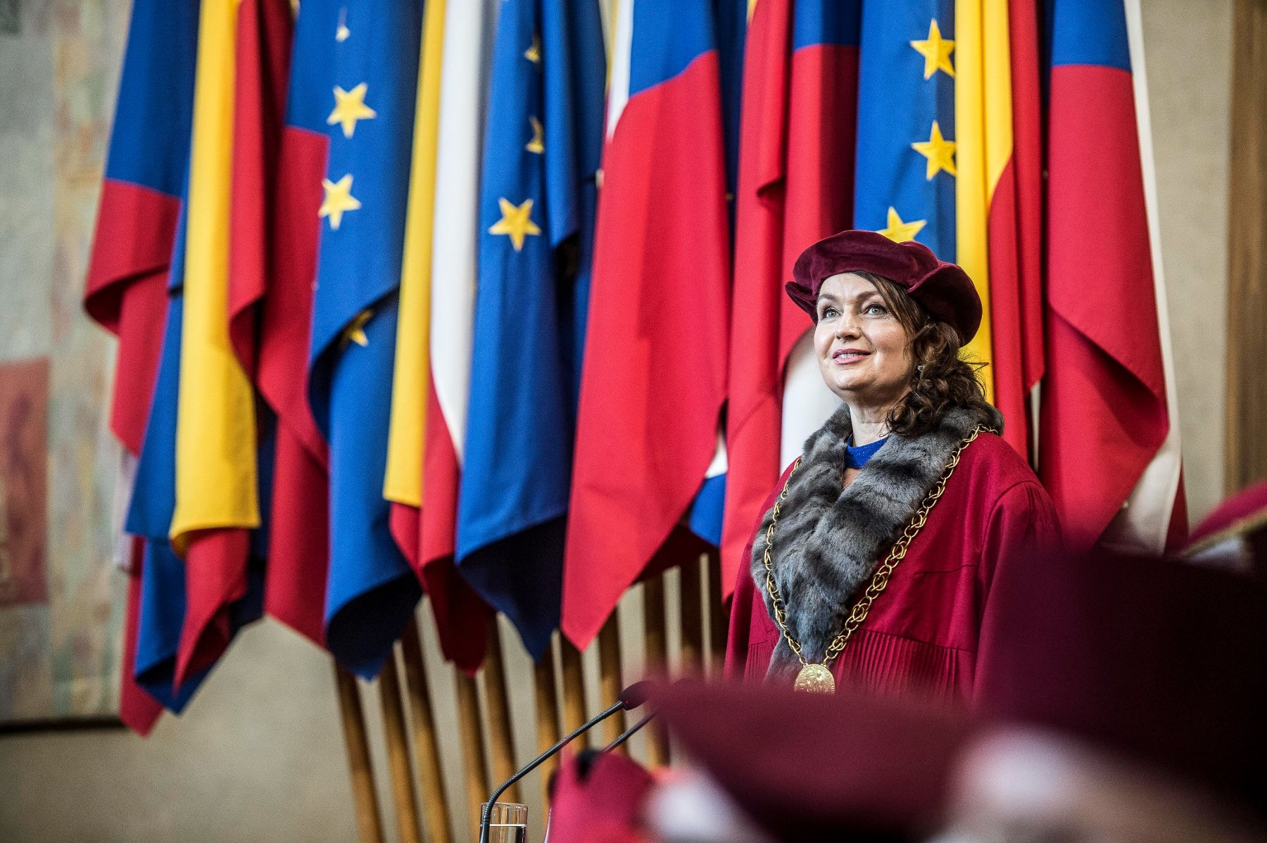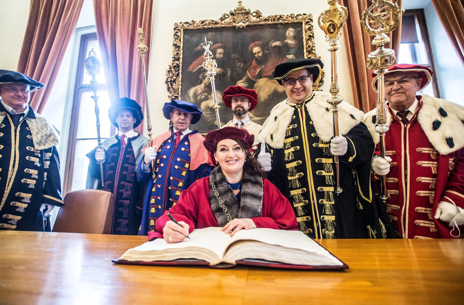 Profesorka Milena Králíčková při slavnostním zápise do pamětní knihy UK během slavnostní rektorské inaugurace dne 3. března 2022.