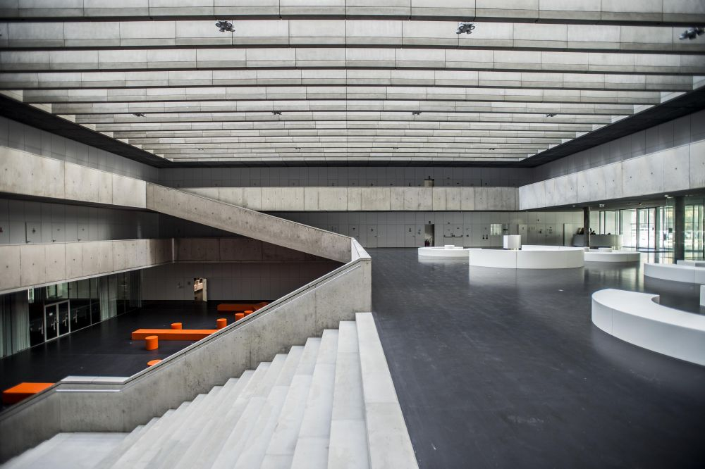 Pro stavby, které realizoval váš ateliér, je typický pohledový beton, sklo a zároveň velmi výrazný barevný akcent v interiéru. Na fakultě se jedná především o nepřehlédnutelné oranžové sezení ve dvoraně…