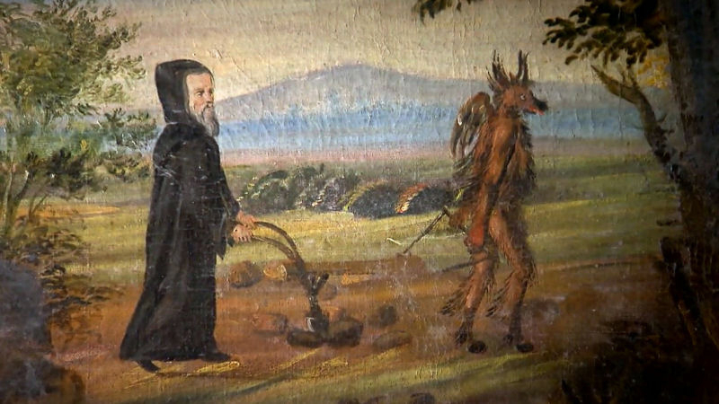 Svatý Prokop se zapřaženým čertem. Čert prý pole v okolí Sázavy zorává dodnes...