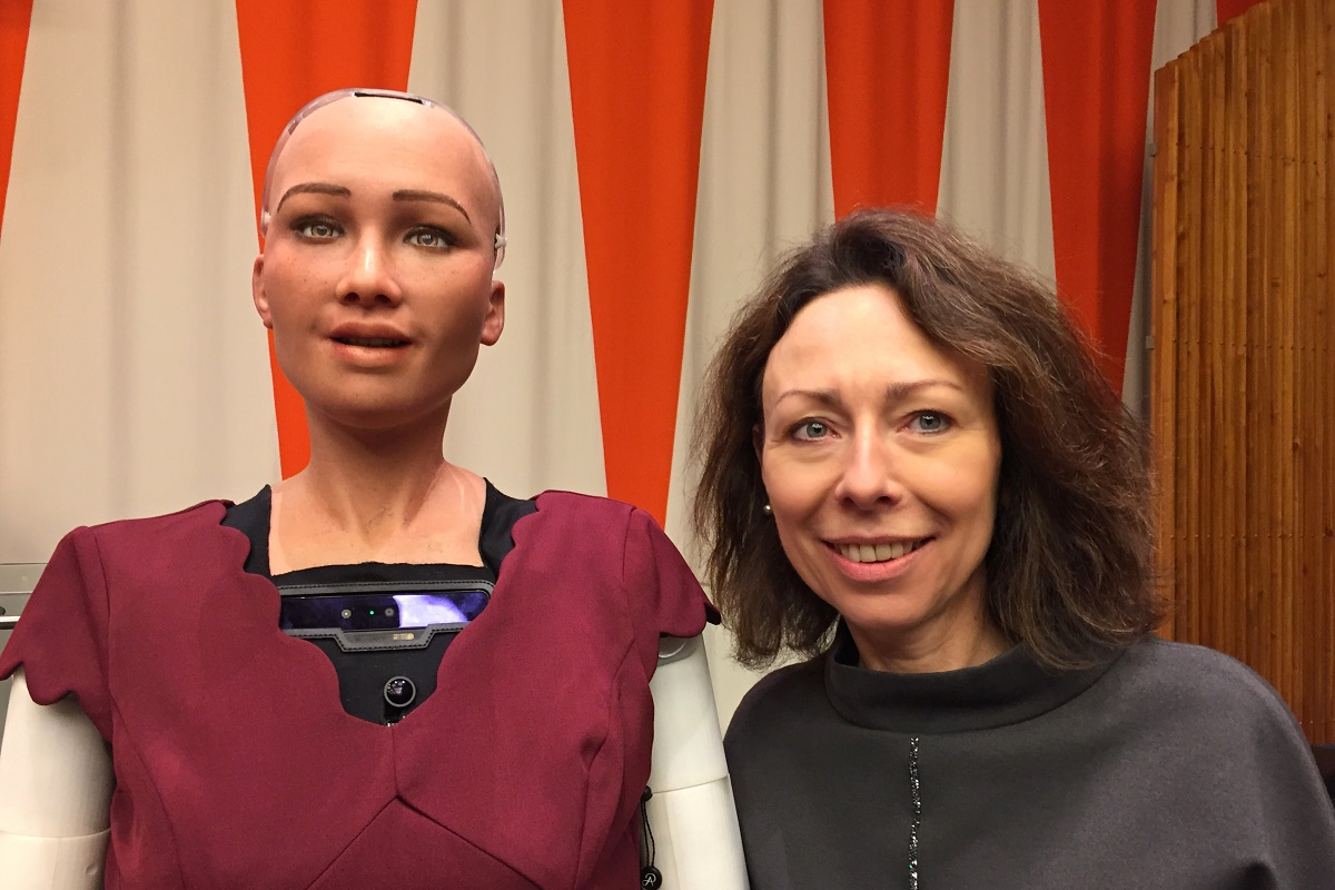 S AI robotem Sofií v rámci prvního interaktivního dialogu při jednání Hospodářské a sociální rady Organizace spojených národů ECOSOC.