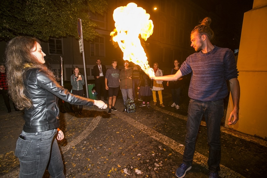 Sleduji herce skotačící v atriu Právnické fakulty a přemýšlím, kam dál. Program je pestrý a nabitý. „Trošku bojujeme s časem,“ přiznává maminka malého chlapce, s nímž právě vyšla z jednoho z přednáškových sálů a teď hledá v mobilní aplikaci Noci vědců, kdy přesně probíhají v Chemickém ústavu Přírodovědecké fakulty UK na Albertově hrátky s ohněm. „Chtěl bych vědět, jak je to s těmi světluškami,“ vysvětluje důvod spěchu desetiletý Martin. Dokud nezjistí, proč jim svítí zadečky, nepůjde spát. Alternativní prostor Kampusu Hybernská, jehož program je rovněž zaměřený na děti, budou muset letos oželet. Tak snad příští rok – na patnáctém ročníku Noci vědců.