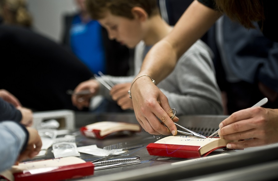 „Chcete si zkusit steh?“ ptá se mladá medička a představuje mi své pomocníky – pinzetu, jehelec, jehlu a nit. Nejistě vzdychnu. Vypadá to lákavě a až podezřele jednoduše, když člověk sleduje hbité ruce budoucí lékařky. Jehelec jsou takové delší úzké nůžky a jehla zase zatočený drátek ve tvaru půl kruhu. „Nůžky“ se drží jen dvěma prsty dlaní dolů, rozevírají se tlakem k sobě a při šití se jimi drží jehla. Nezvládla jsem ani jeden steh, zato se mi podařilo přišít k podložce vlastní prst. Medička je evidentně na takové výsledky zvyklá a ochotně mi všechno zopakuje. „Jednou obtočit nit, po druhé obtočit, protáhnout, utáhnout. Jednou obtočit, protáhnout, utáhnout. Potřetí… A fik, ušmiknout,“ předvede mi během dvaceti vteřin krásný steh. „Proč se to musí dělat tak složitě a nemůžeme zapošívat běžnými uzlíky?“ ptám se trochu naivně a hodně vyčerpaně. „Lidská kůže je křehká, kdybychom dělali klasické, popraskala by. Stejně tak s jehlou – půlkruhovou používáme kvůli tomu, že rovná by zajela příliš hluboko a poničila by tkáně.“