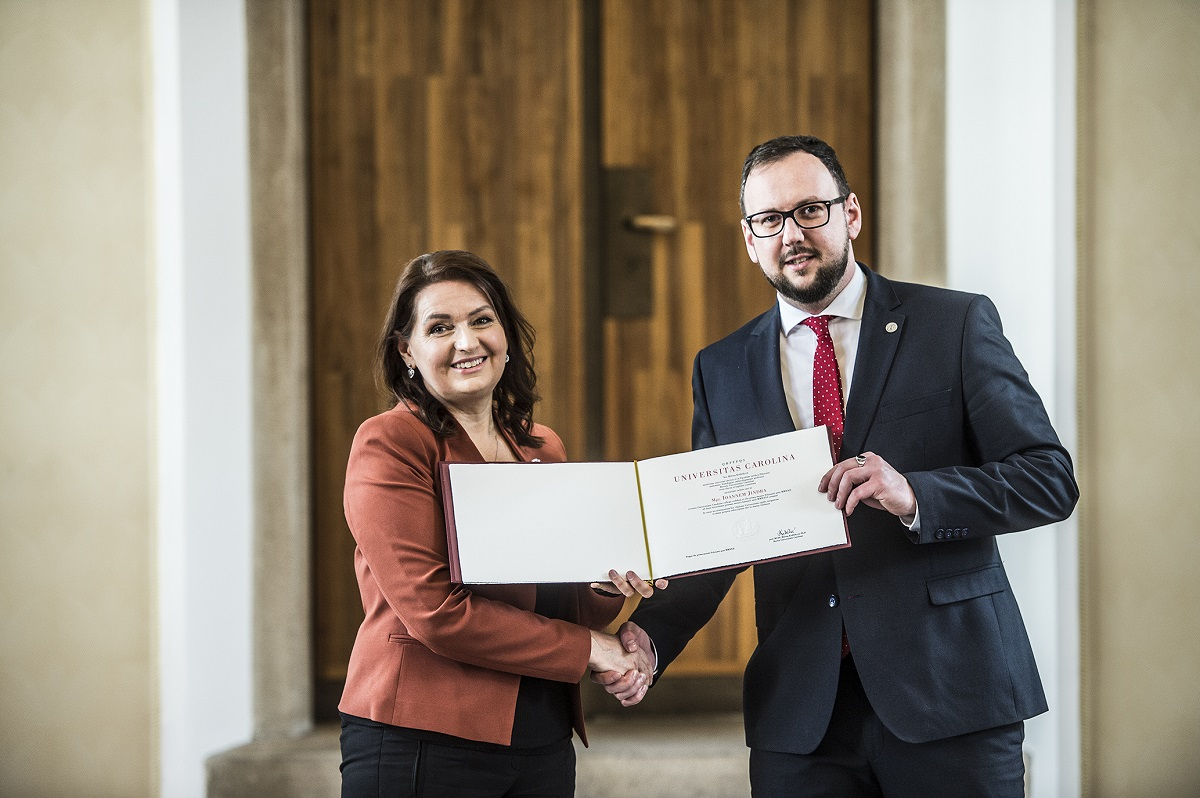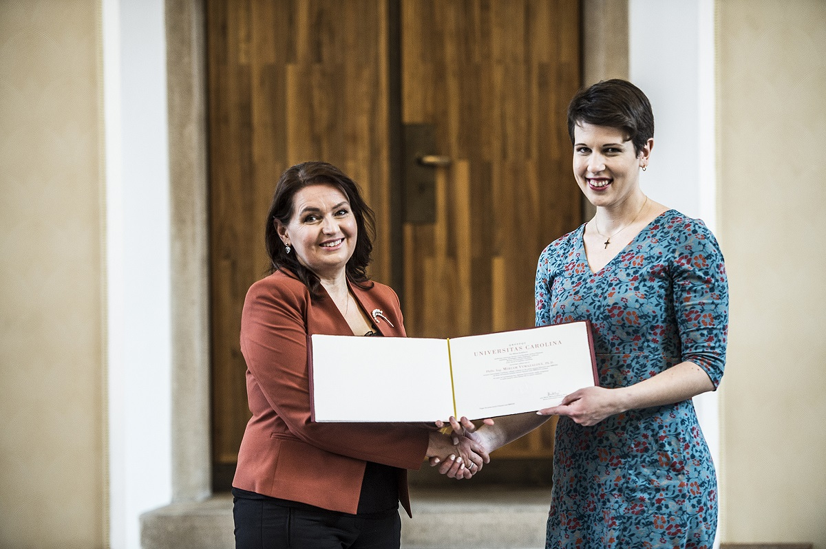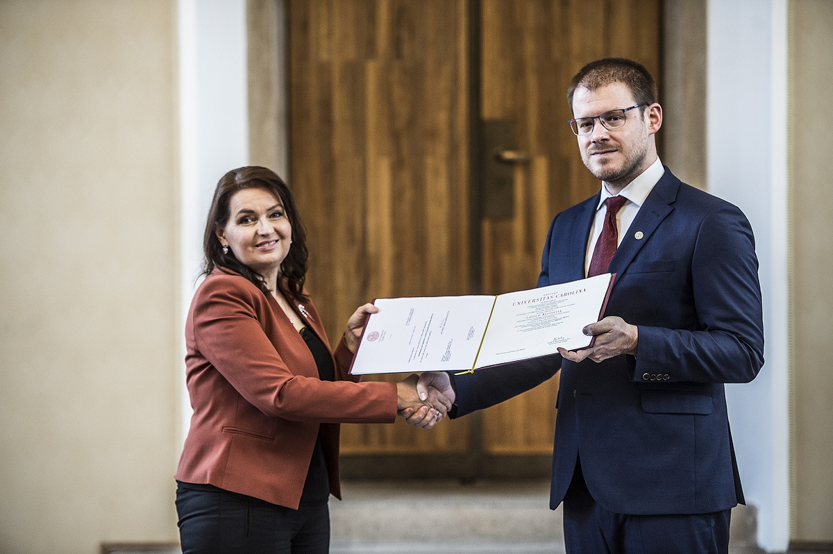 Objektiv fotoaparátu zaznamenal i okamžiky, kdy rektorka Milena Králíčková předávala svým kolegům – novým členům kolegia – jejich jmenovací dekrety, jak je vidět ve fotogalerii níže: