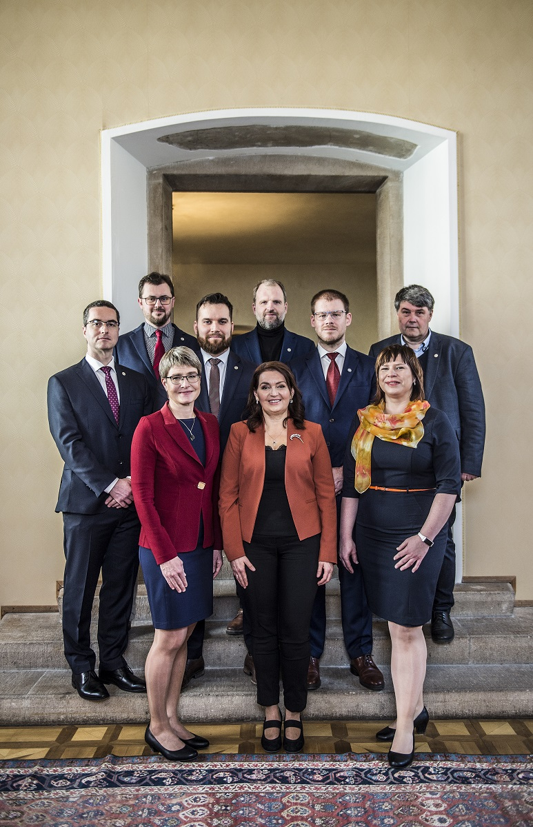 V první řadě uprostřed rektorka Králíčková s prorektorkami Křížovou a Martínkovou, nad nimi: Polák, Vlach, Doleček, Skopal, Krištoufek a Kuklík.