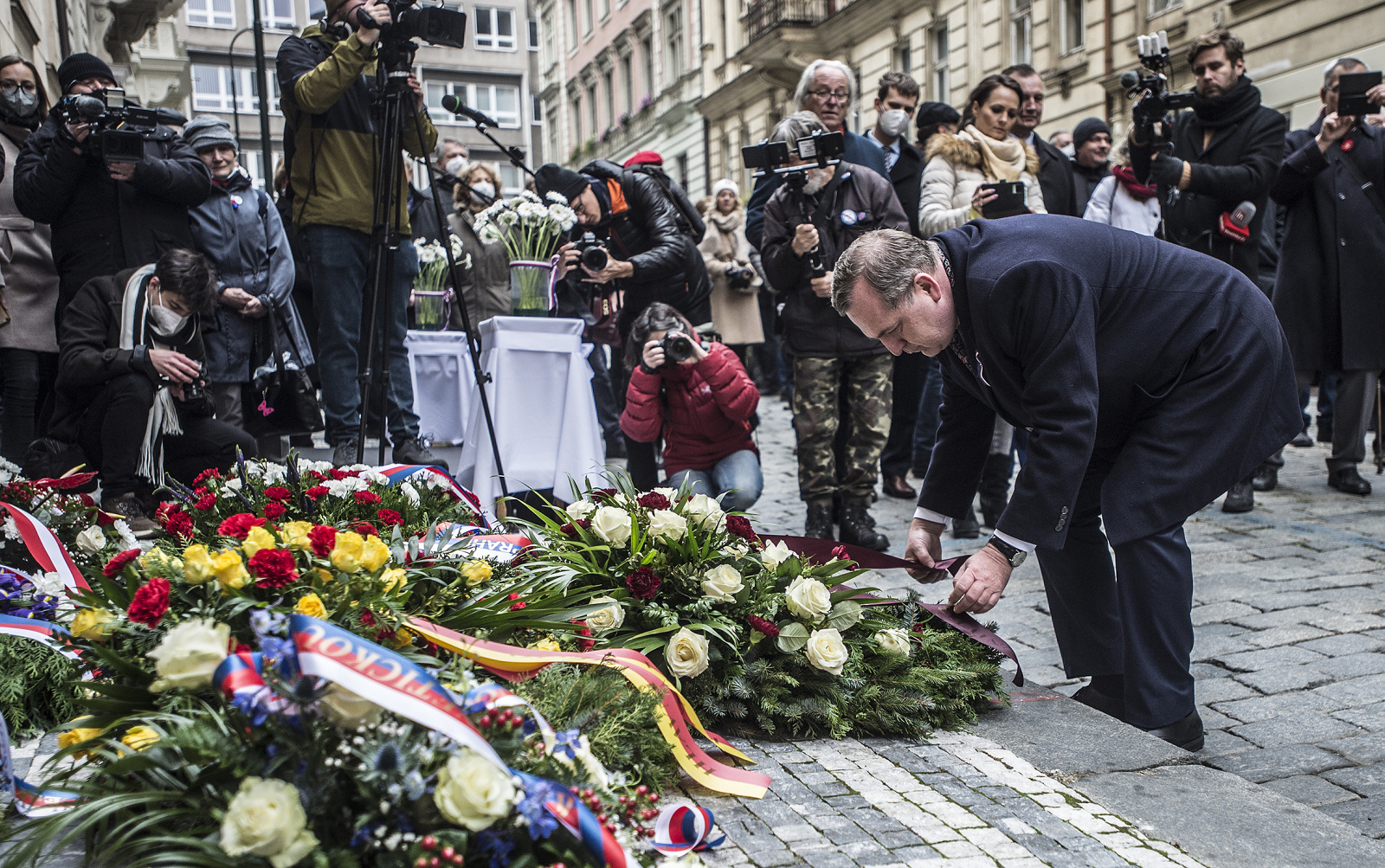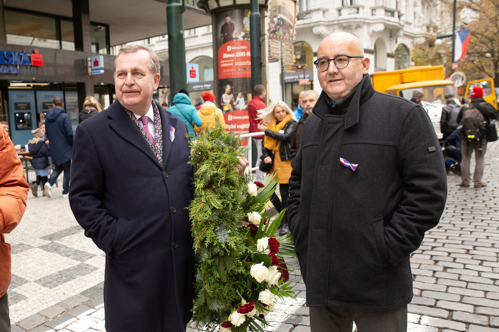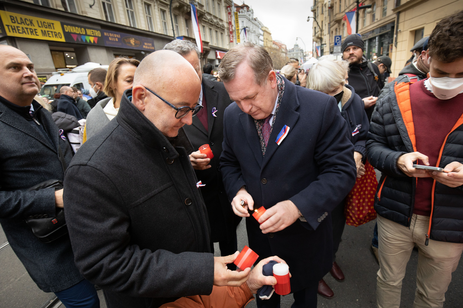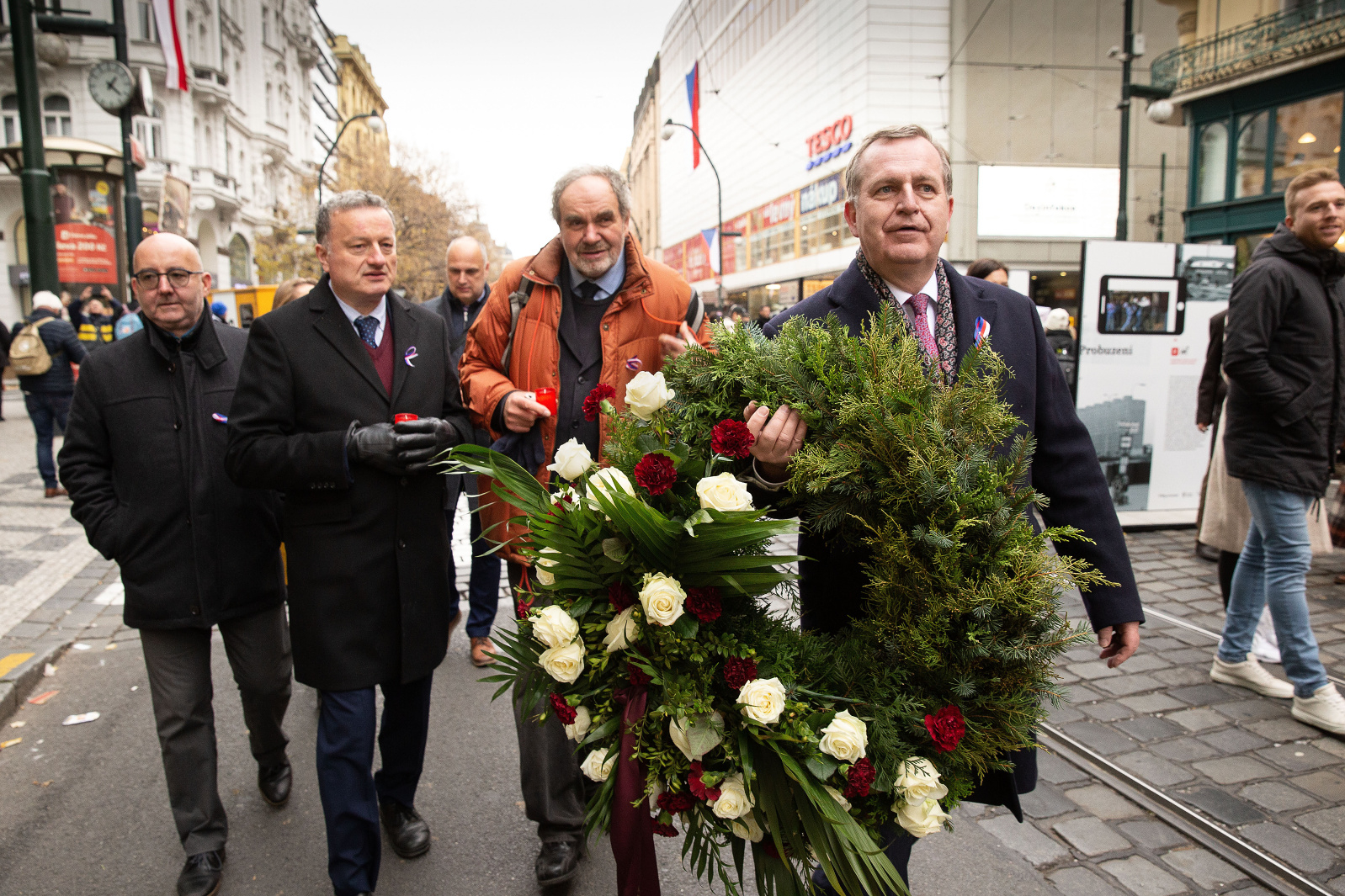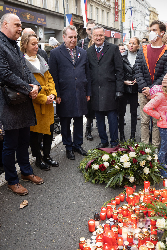 Občané a také delegace UK šla následně oslavit velký den demokracie, během kterého budoucí premiér a emeritní rektor Masarykovy univerzity Petr Fiala (ODS) představil složení nové české vlády, na Národní třídu. Tam, kde komunistická policie na podzim 1989 tvrdě zasáhla proti demonstrantům. Věnec přinesli rektor Zima a prorektoři Jan Royt, Jan Konvalinka a Miroslav Bárta (na snímku za rektorem zprava doleva).