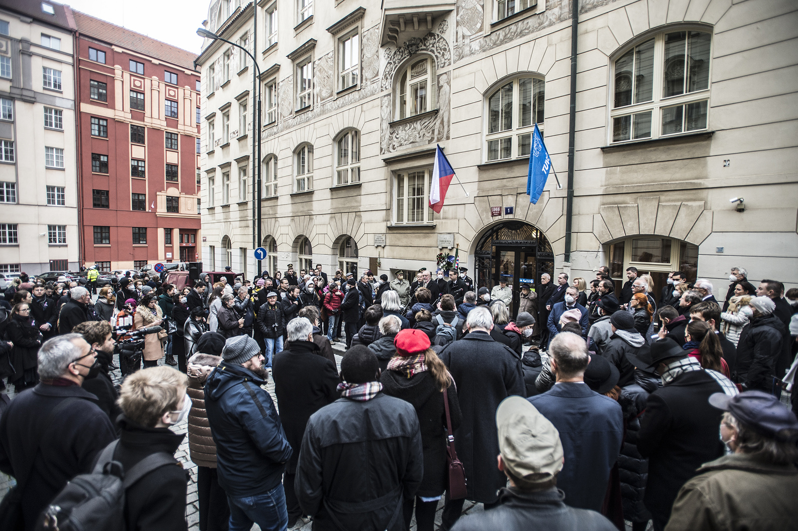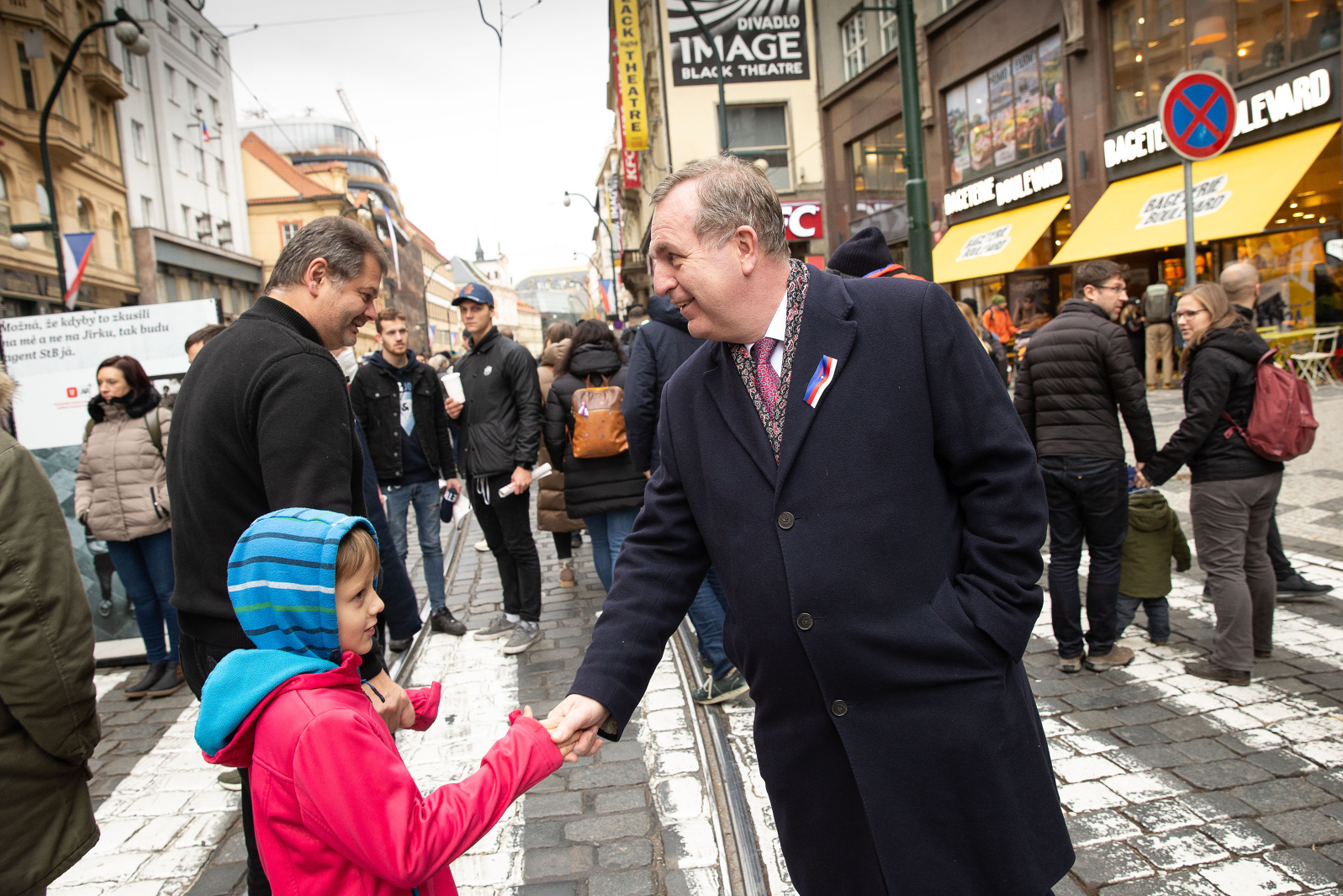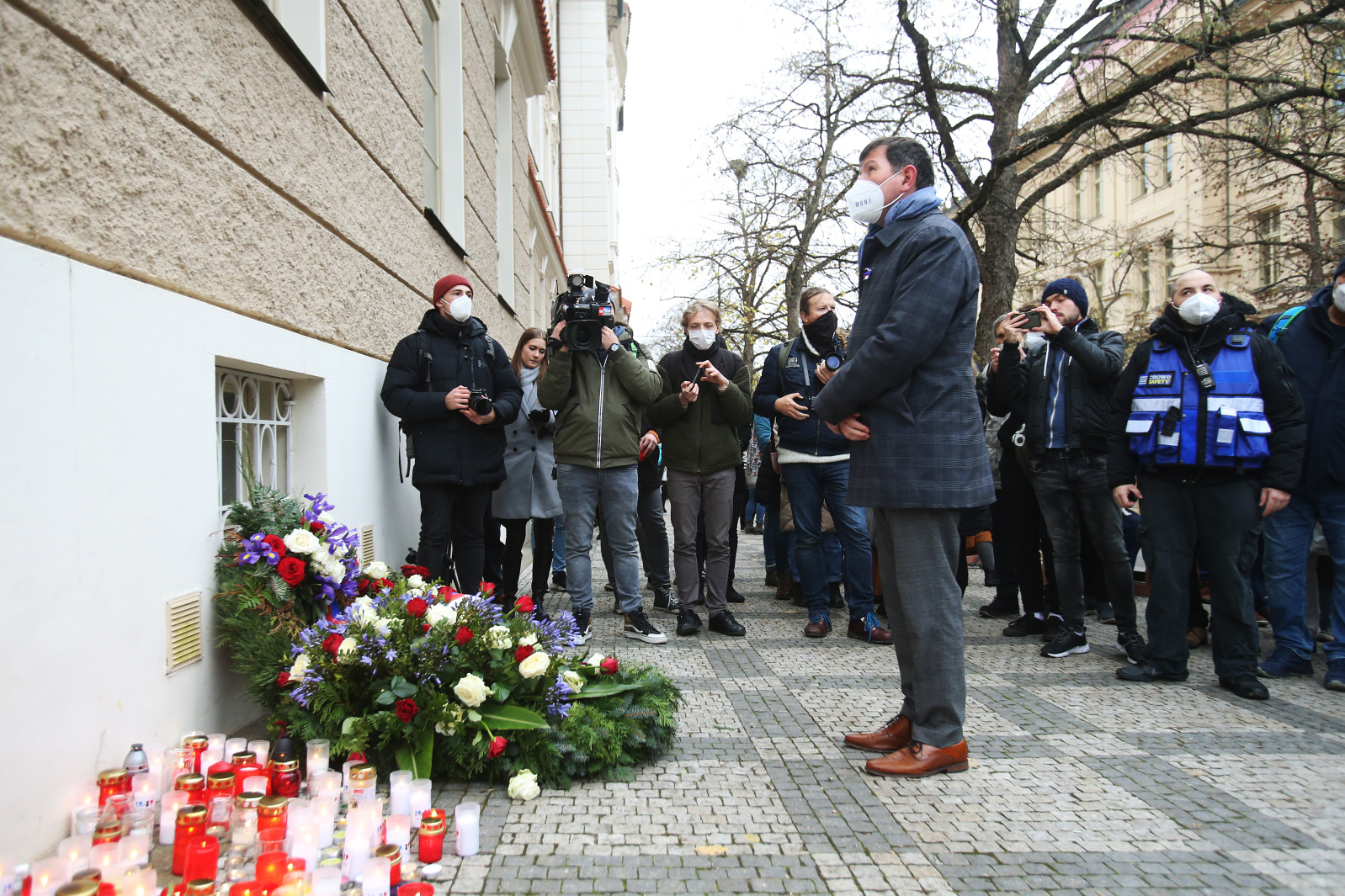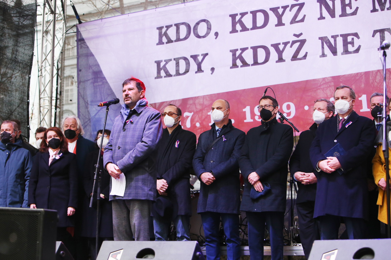 Občané a také delegace UK šla následně oslavit velký den demokracie, během kterého budoucí premiér a emeritní rektor Masarykovy univerzity Petr Fiala (ODS) představil složení nové české vlády, na Národní třídu. Tam, kde komunistická policie na podzim 1989 tvrdě zasáhla proti demonstrantům. Věnec přinesli rektor Zima a prorektoři Jan Royt, Jan Konvalinka a Miroslav Bárta (na snímku za rektorem zprava doleva).