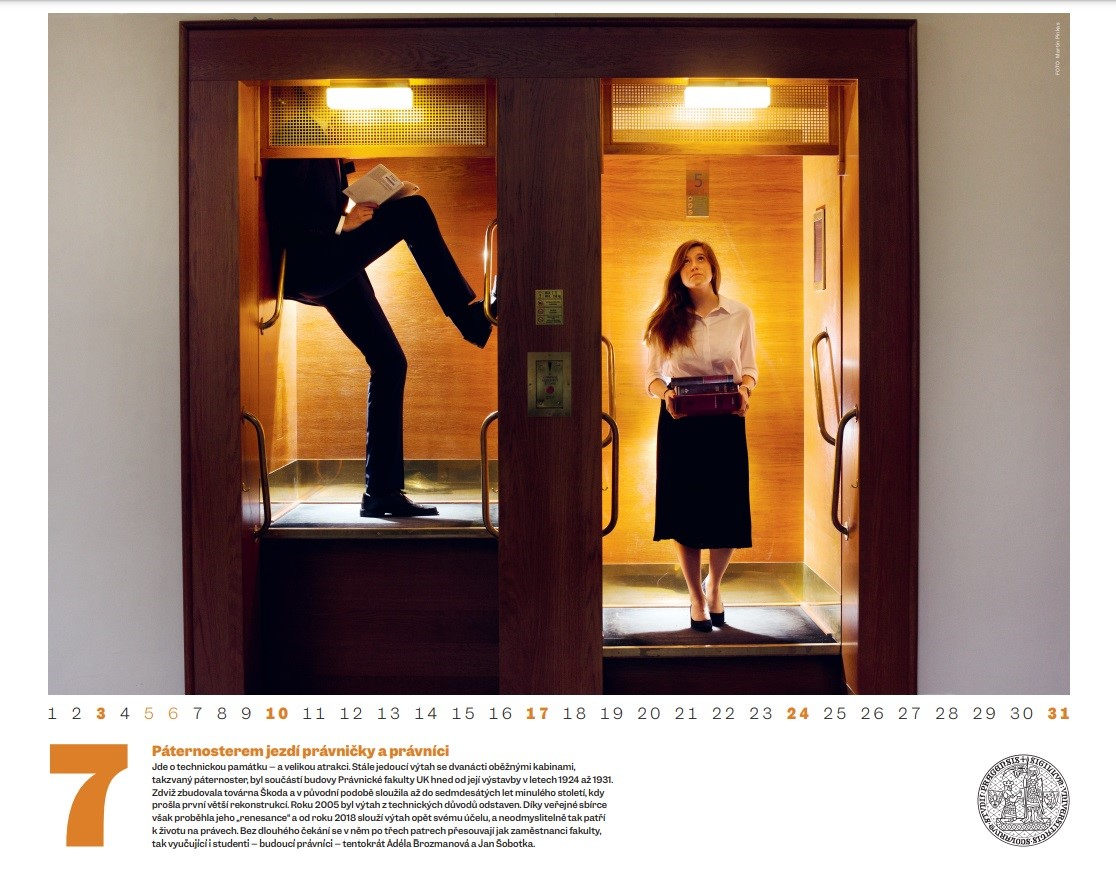 Nechtěli jsme však, aby kalendář UK 2022 byl pouhou přehlídkou prostor, ale aby vznikl i hravější koncept. Kupříkladu hradečtí medici tak pózují na šikmé stěně výukového centra lékařské fakulty, studenti práv si „zahráli“ své party při jízdě páternosterem a studentka Jana Slámová se neváhala znovu a znovu nořit do bazénu pro co nejlepší záběr... Ocenit musíme i varhaníka Jana Kalfuse, jenž se kvůli pěkné fotce nebál vylézt na štafle, přičemž pak z výšin rozhazoval notové zápisy svého oblíbeného Bacha.