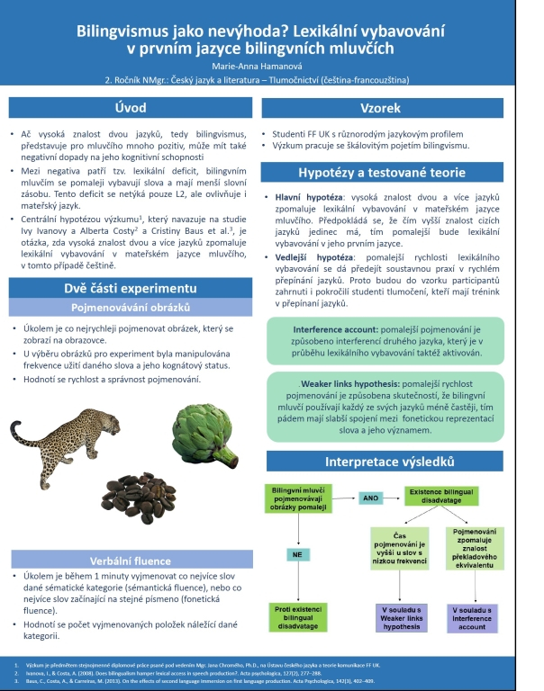 Za řečnickým pultem v jednom z přednáškových sálů Filozofické fakulty UK představovala Marie-Anna Hamanová téma své diplomové práce Bilingvismus jako nevýhoda? Lexikální vybavování v prvním jazyce bilingvních mluvčích. Už jen ten název si musí laik přečíst několikrát, než pochopí alespoň zhruba, o co jde. Když však autorka uvede pár jednoduchých příkladů, je to hned jasné: „Zajímá mě, zda schopnost člověka hovořit plynně dvěma jazyky s sebou nenese i nějaká negativa. Konkrétně zda si bilingvní mluvčí pomaleji vybavují slova ve své mateřštině,“ vysvětluje Marie-Anna Hamanová. Dosud zatím hlavně promýšlela a připravovala psycholingvistický experiment.