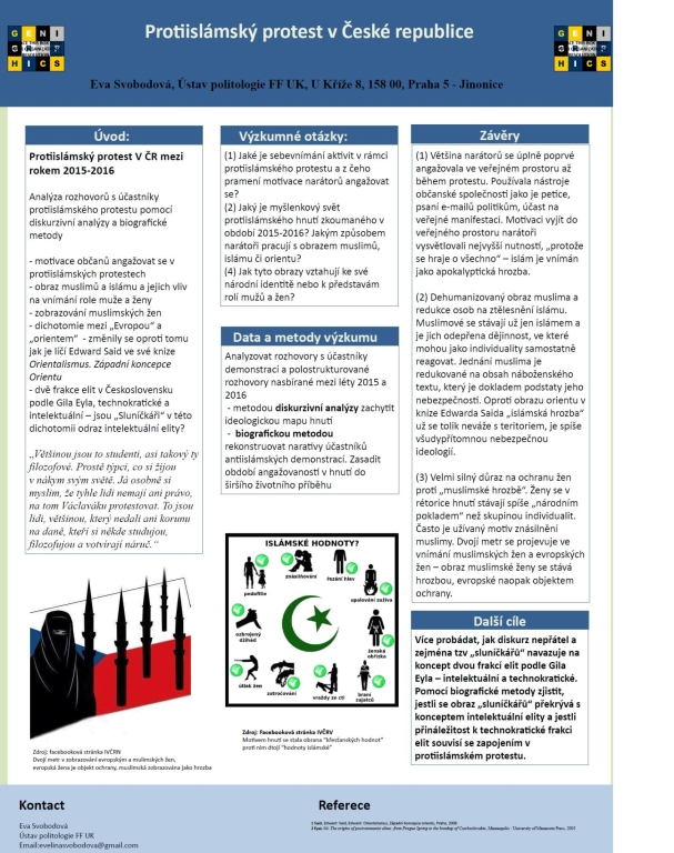 „Dnes se hodně mluví o propojení vědy a byznysu, což ale v humanitních oborech moc nefunguje, a proto se na ně často zapomíná. Zároveň si myslím, že se studenti mají podporovat v akademickém vzdělávání. Ať už pak půjdou pracovat kamkoli, zkušenosti se čtením složitých textů, prováděním analýz a výzkumů využijí v každém typu zaměstnání.“ Eva Svobodová, studentka bakalářského programu na Ústavu politologie FF UK a autorka vědecké práce Protiislámský protest v České republice.