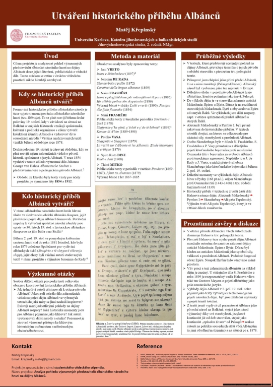 „I když si myslím, že pro historii a literární vědu není prezentace formou posteru ideální, pro mě osobně to byla ta nejlepší škola, jak se naučit shrnout všechny podstatné informace na jednu stránku, a přitom být stále srozumitelný.“ Matěj Křepinský, student 2. ročníku navazujícího magisterského studia na katedře jihovýchodoevropských studií a autor projektu Utváření historického příběhu Albánců.