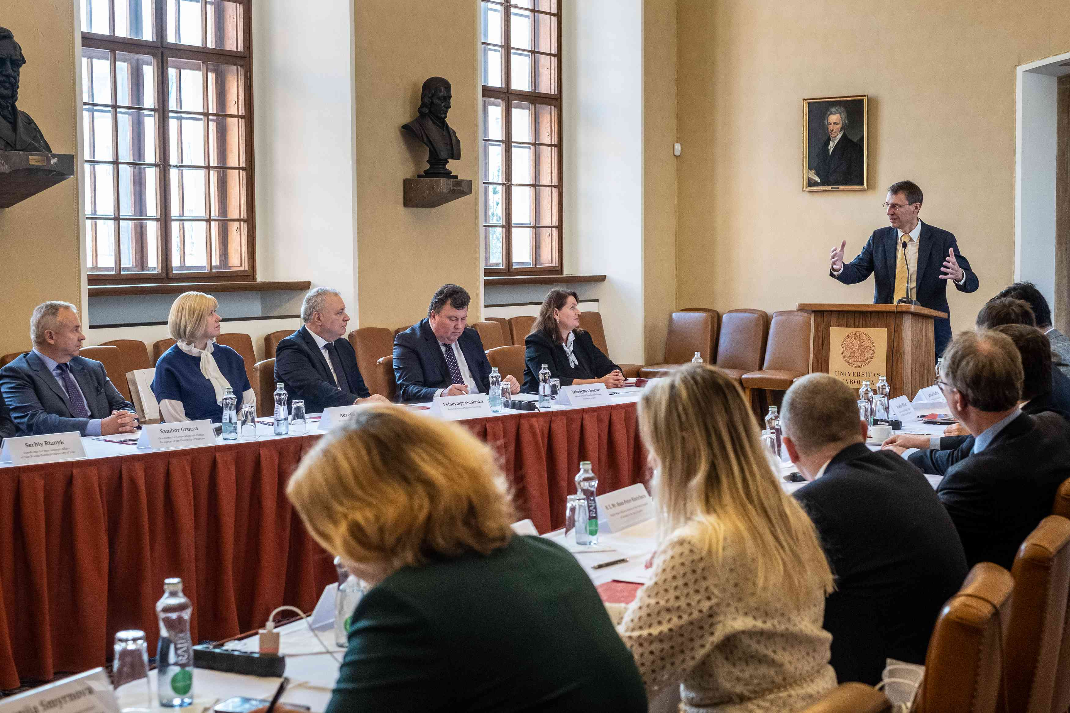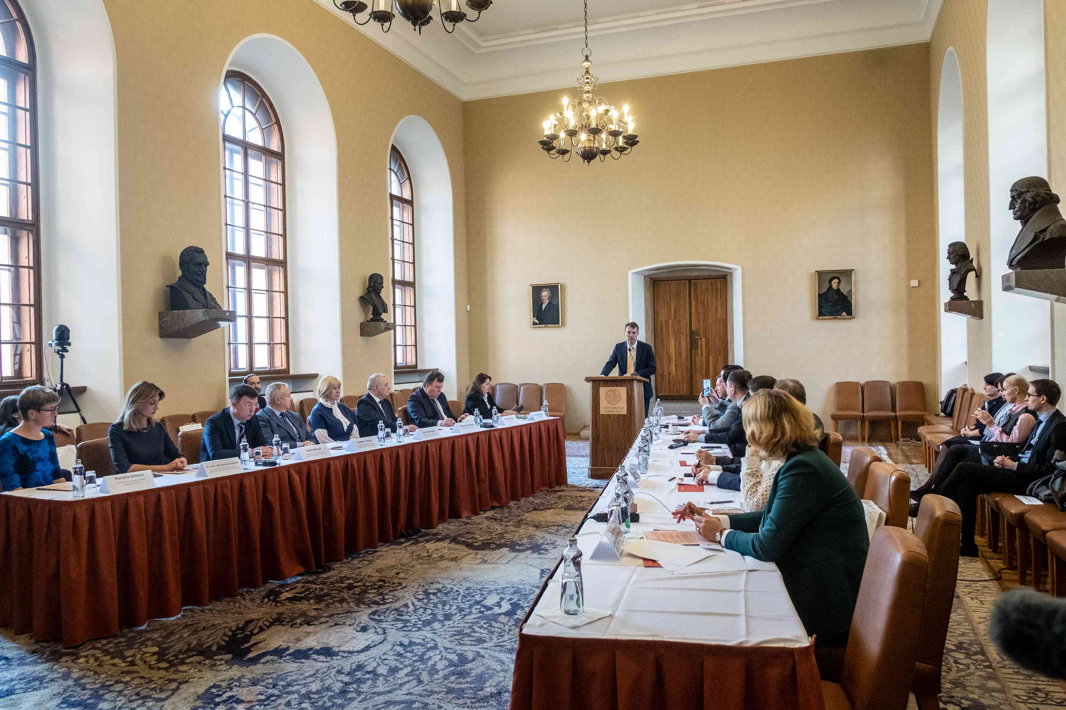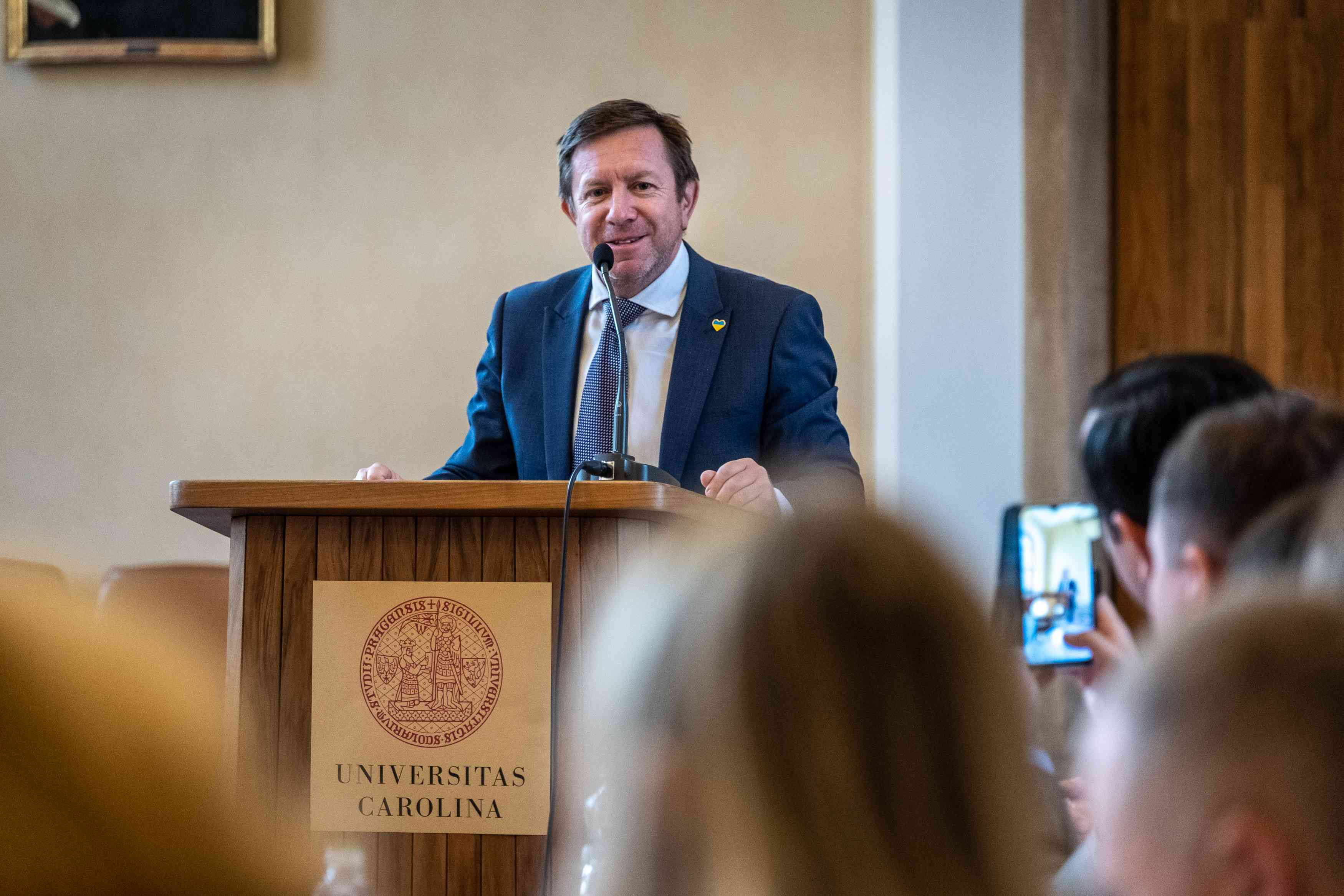 Kromě rektorek a rektorů či prorektorky UK pro zahraniční vztahy Markéty Křížové se jednání i slavnostního aktu ve Vlasteneckém sále zúčastnili rovněž zástupci ministerstva školství (včetně náměstka Jaroslava Millera, emeritního rektora Univerzity Palackého; na snímku opět u řečnického pódia), ministerstva zahraničních věcí či diplomatických sborů.