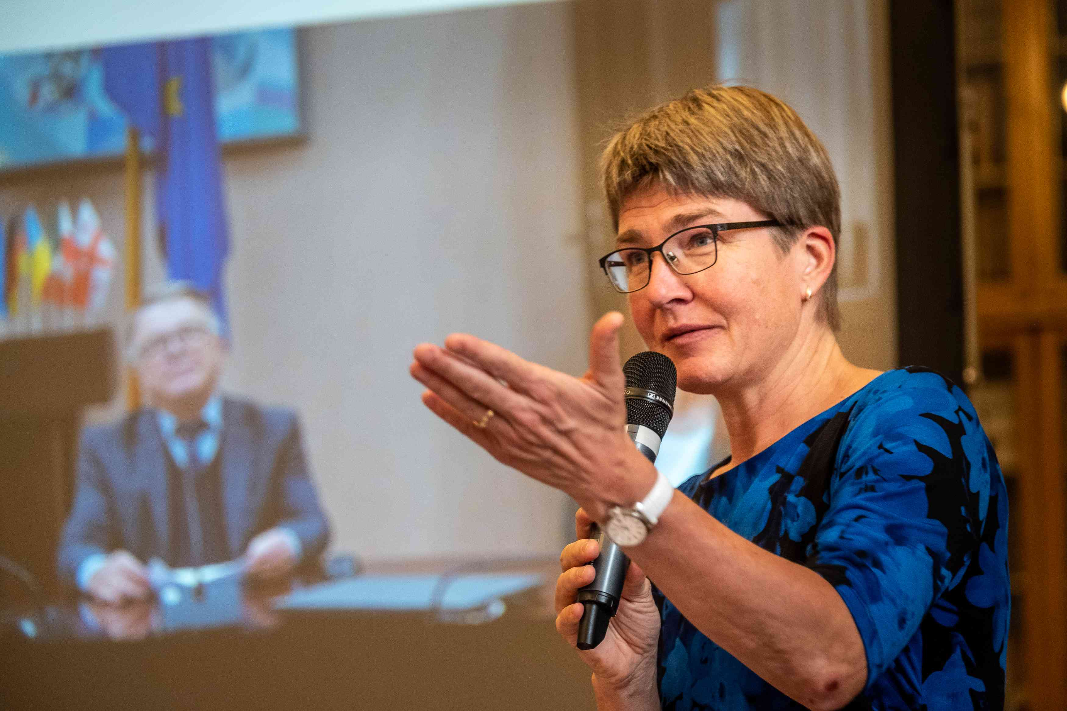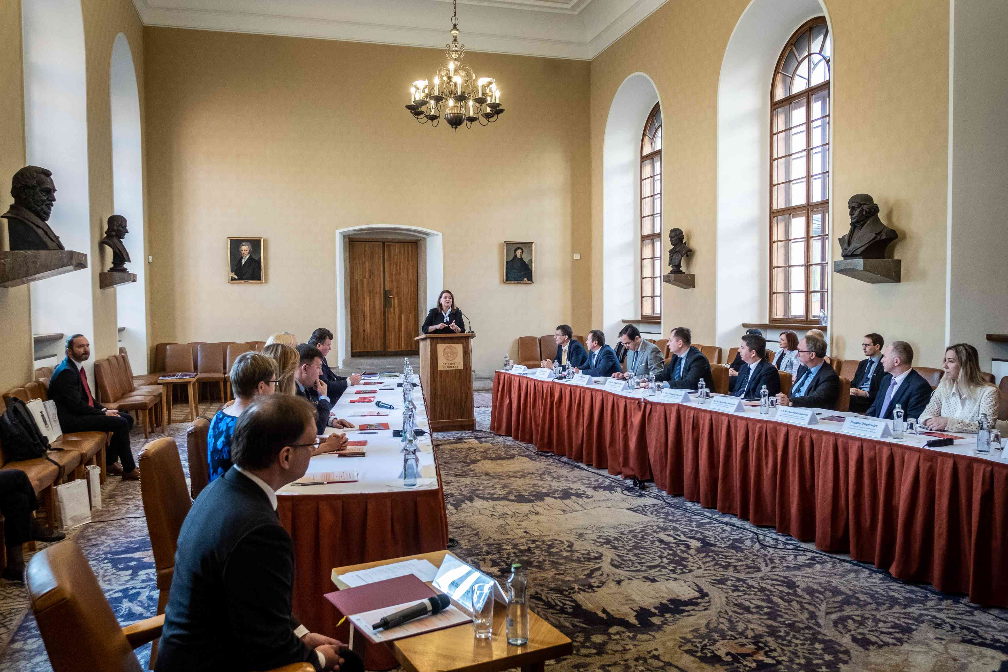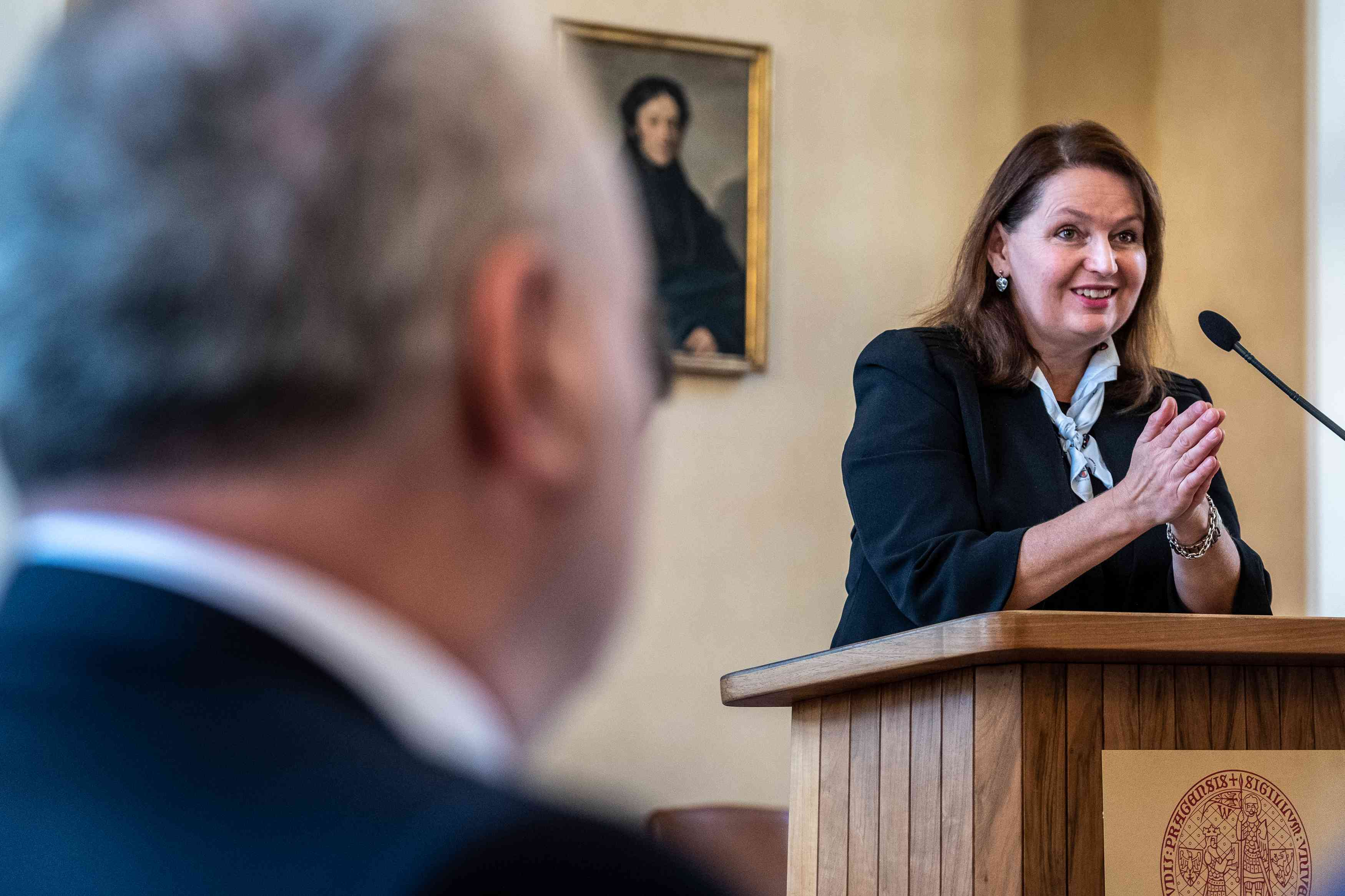 „Jsem nesmírně ráda, že je to právě Univerzita Karlova, jež stojí u vzniku této iniciativy. Díky projektům, jako je tento, se totiž stává skutečně otevřeným prostorem, jež podporuje studentky a studenty napříč zeměmi i kulturami. Současně věřím, že tato iniciativa přispěje nemalou měrou k šíření evropské akademické praxe,“ uvedla v komuniké k novému konsorciu Milena Králíčková, rektorka UK (na snímku hovoří u pultu).