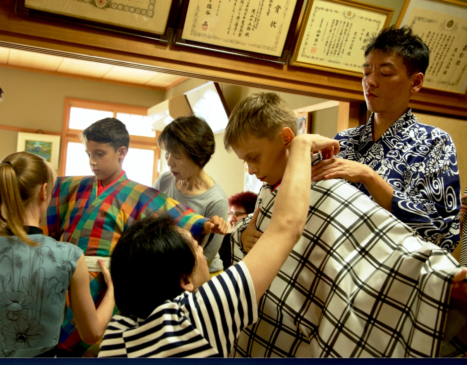 Přípravy na vystoupení k oslavě 20 let partnerství mezi Prahou a Kjótem, společně s Šime Sigejamou a jeho syny (Praha, 2016). Foto: Kuba Jíra