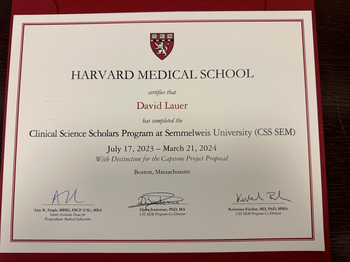 (s úsměvem) No právě, když jsem si tehdy o programu zjišťoval více informací, zjistil jsem, že náplní jsou přesně ty oblasti týkající se klinické vědy, kde mám rezervy. Zároveň jsem relativně nedávno, na konci roku 2022, strávil na Semmelweis University tři měsíce v rámci klinicko-vědecké stáže, na které rád vzpomínám. Celý program byl navržen jako hybridní (distančně-prezenční), tedy byl koncipován tak, aby bylo možné absolvovat ho i s našimi běžnými každodenními pracovními povinnostmi, což bylo mojí hlavní podmínkou.