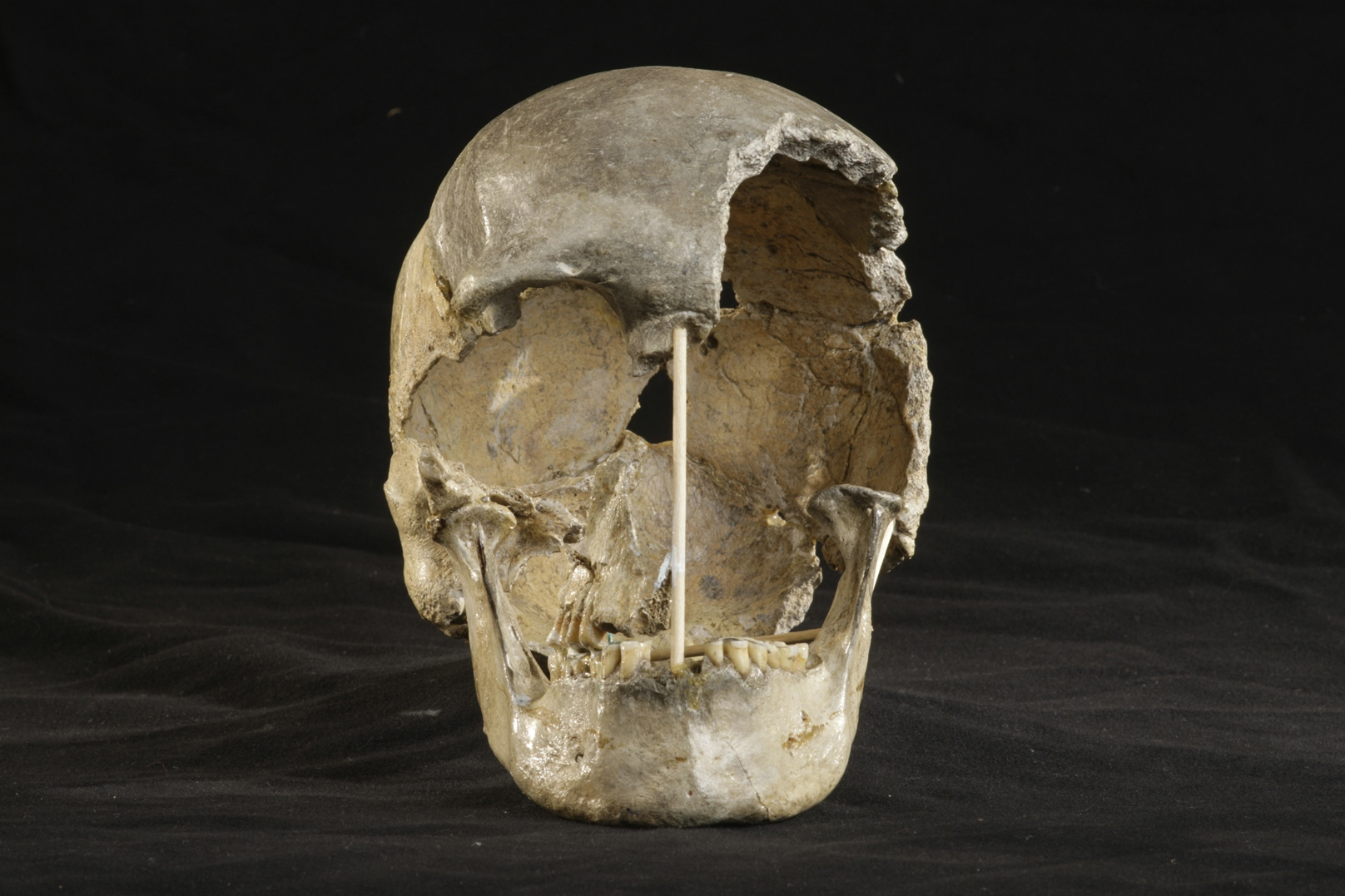 Studovaná lebka ženy zvané Zlatý kůň: z boku a z předního pohledu. Foto: Martin Frouz, PřF UK, Nature Ecology & Evolution