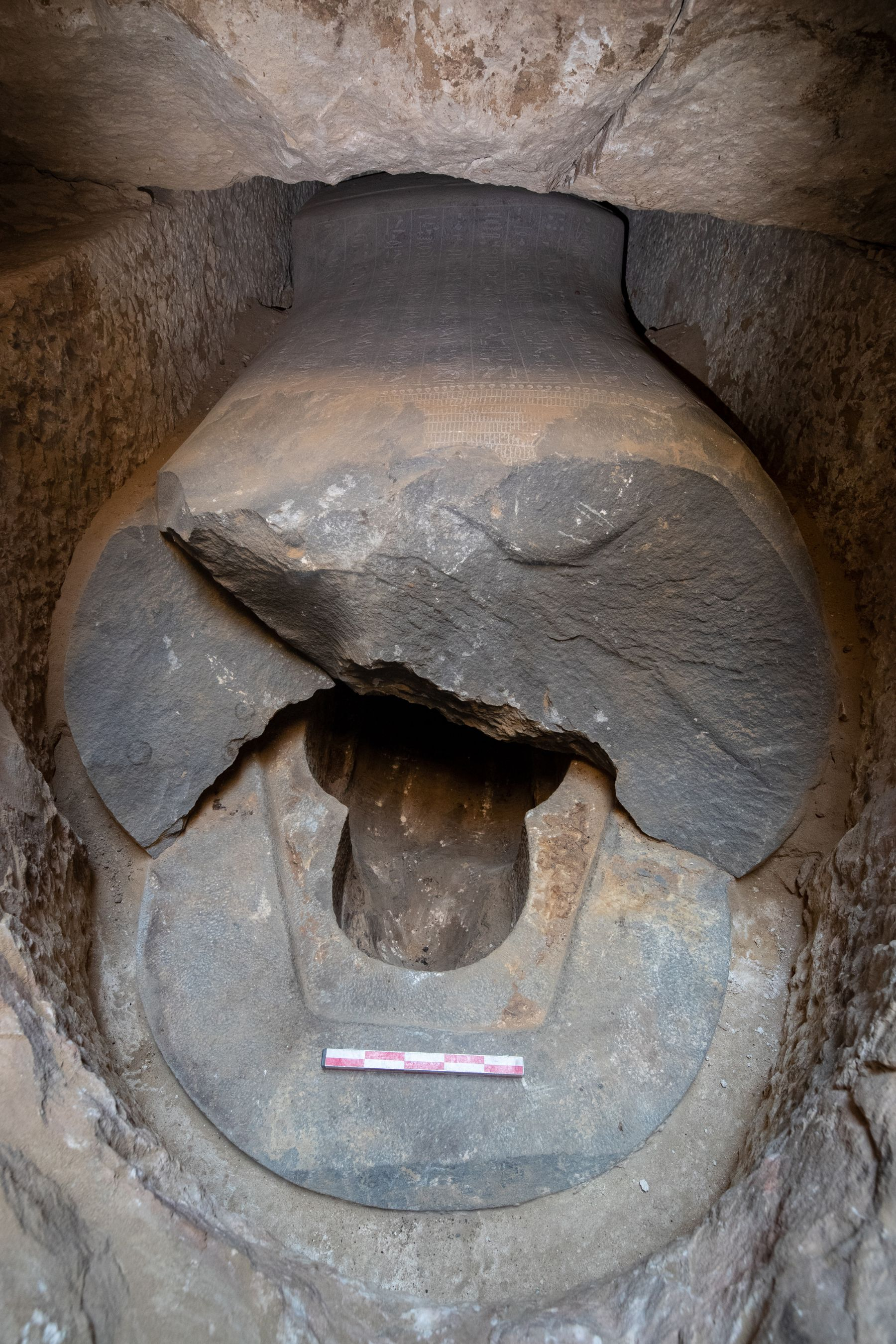 Na dně centrální hrobové šachty, v hloubce asi šestnácti metrů, vědci nalezli dvojitý sarkofág, částečně poškozený starověkými lupiči. Starověcí zloději mumifikované tělo zesnulého odnesli i s veškerou výbavou, kterou měl při sobě a na sobě. V prázdném sarkofágu se našel pouze krásný, ale nepopsaný srdeční skarab – amulet zajišťující zesnulému příznivý výsledek posmrtného soudu – a malý amulet ve tvaru podhlavničky. „Zajímavostí je, že podle kontextu a způsobu vykradení se zdá, že tehdejší lupiči takto velkou hrobku nemohli vykrádat tajně. To vše, stejně jako podrobná dokumentace sarkofágů a analýza nálezů, ale ještě bude podrobena dalšímu zkoumání,“ říká Janák.