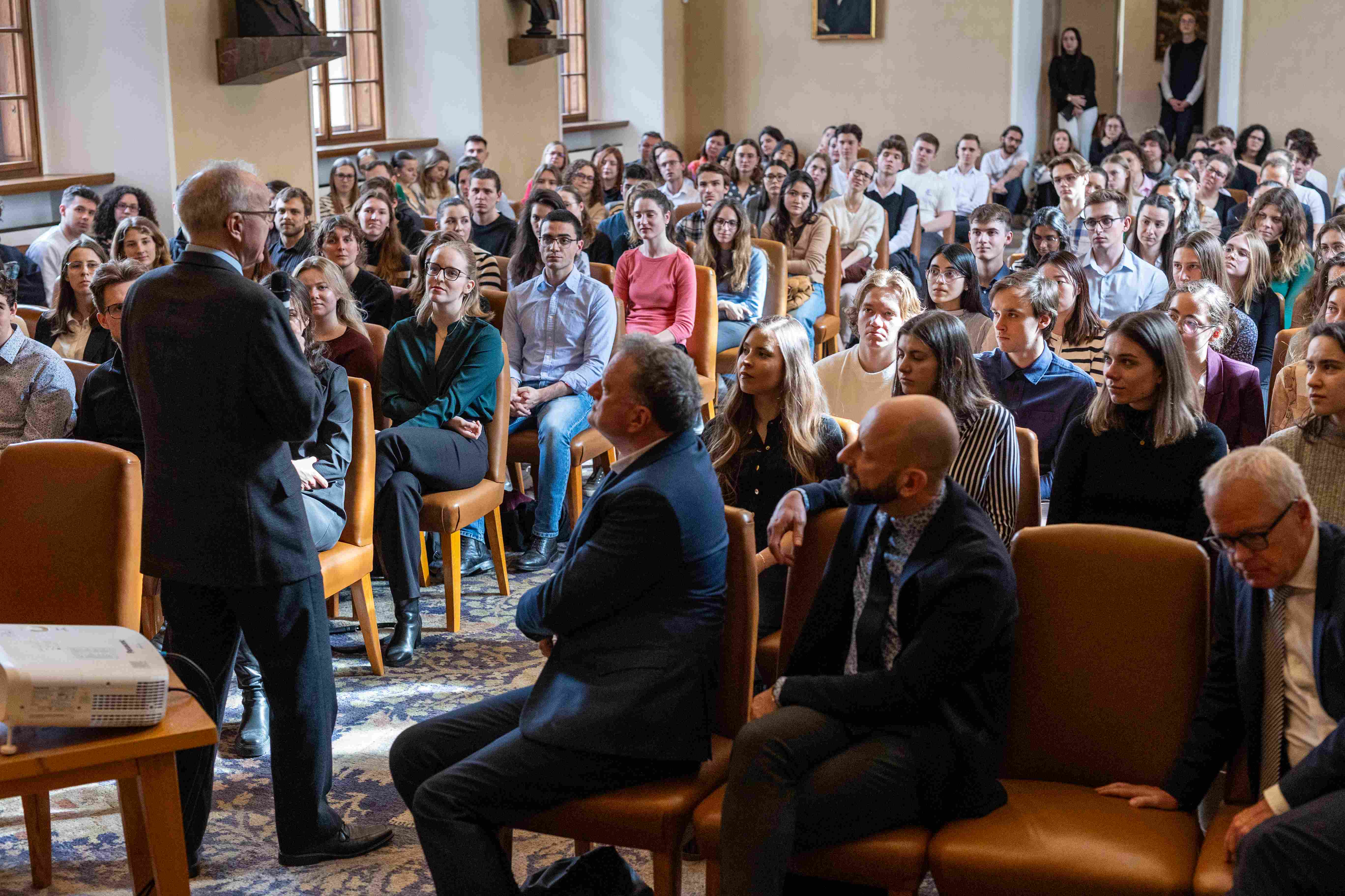 Chtěl bych jim říci, jaký ve mně univerzita zanechala dojem za pár dnů, které jsem zde strávil. Již mnoho let mi mnozí kolegové, kteří navštívili Prahu, říkali, jaký je to klenot v dějinách světa, zejména Evropy, a já jsem se o tom nyní přesvědčil. Procházíte ulicemi tohoto krásného města, jste ponořeni do jeho historie, potkáváte rektorku Milenu (Králíčkovou), vidíte velkou univerzitu a oceňujete i zdejší závazek k excelenci. To mě nechává v úžasu nad tím, co tato akademická komunita představuje. Rozhodně přeji tedy Univerzitě Karlově a všem jejím studentkám a studentům hodně úspěchů! A těším se na svou další návštěvu.