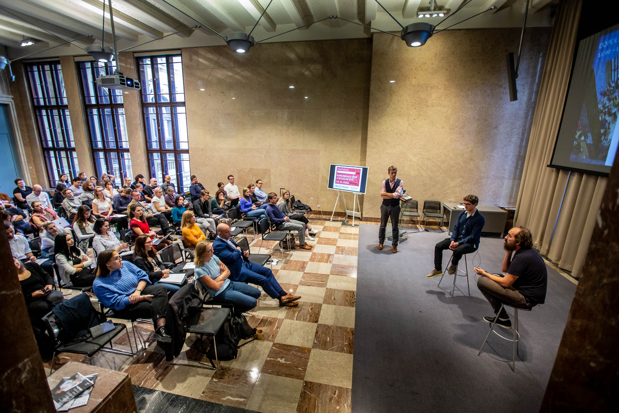 Napotřetí již bez respirátorů a roušek. Před plným sálem odborníků nejen z akademické obce debatují Aleš Vlk, Tomáš Kodydek a Petr Cieslar.