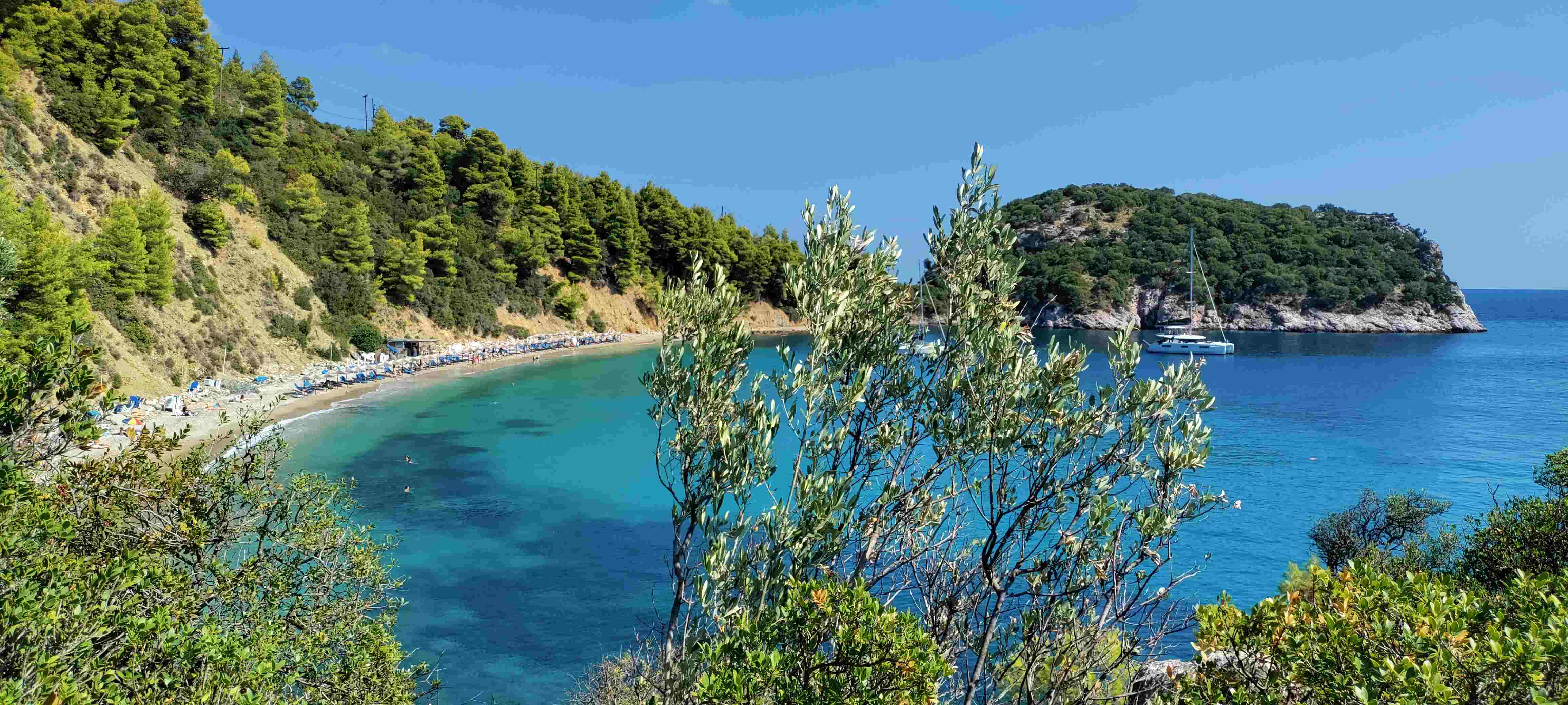 Pohled na lokalitu Stafylos (poloostrůvek vpravo) na řeckém ostrově Skopelos, který leží v souostroví Severní Sporady.