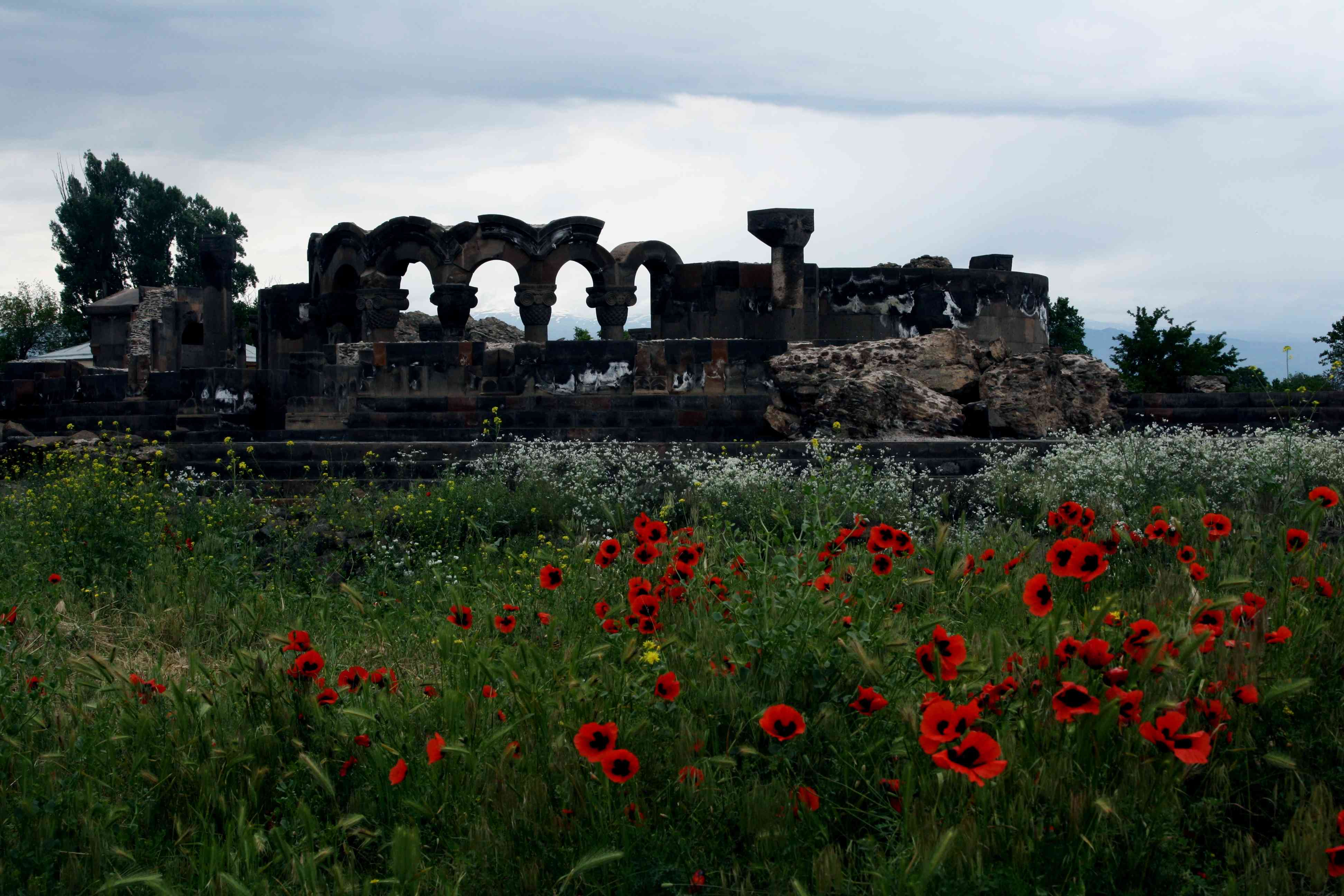 Katedrála Zvartnoc, kterou zarůstá polní kvítí, byla postavena v 7. století a dnes je nedaleko mezinárodního letiště - moderní brány do Arménie.