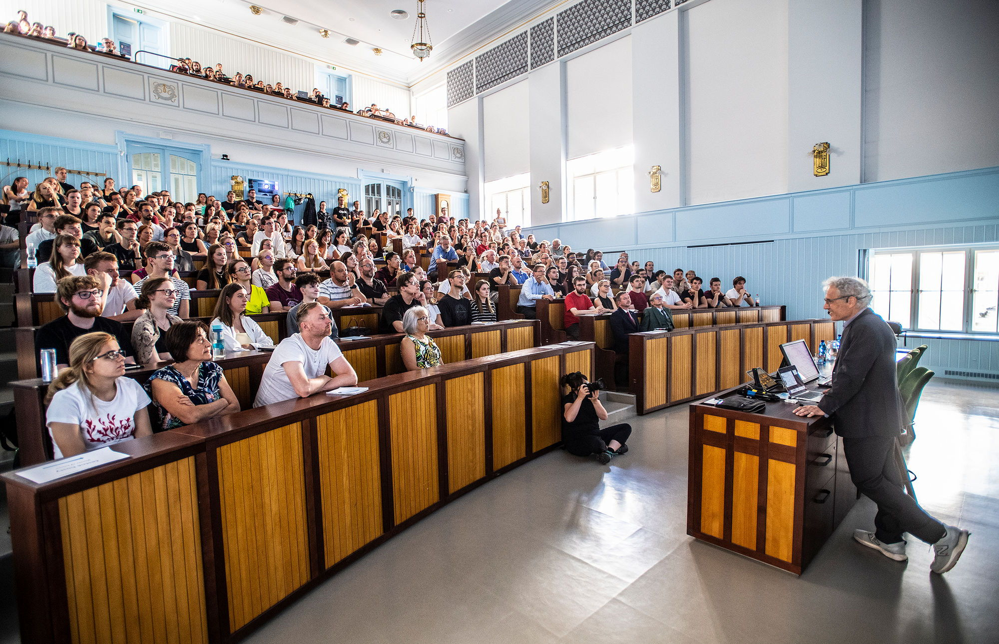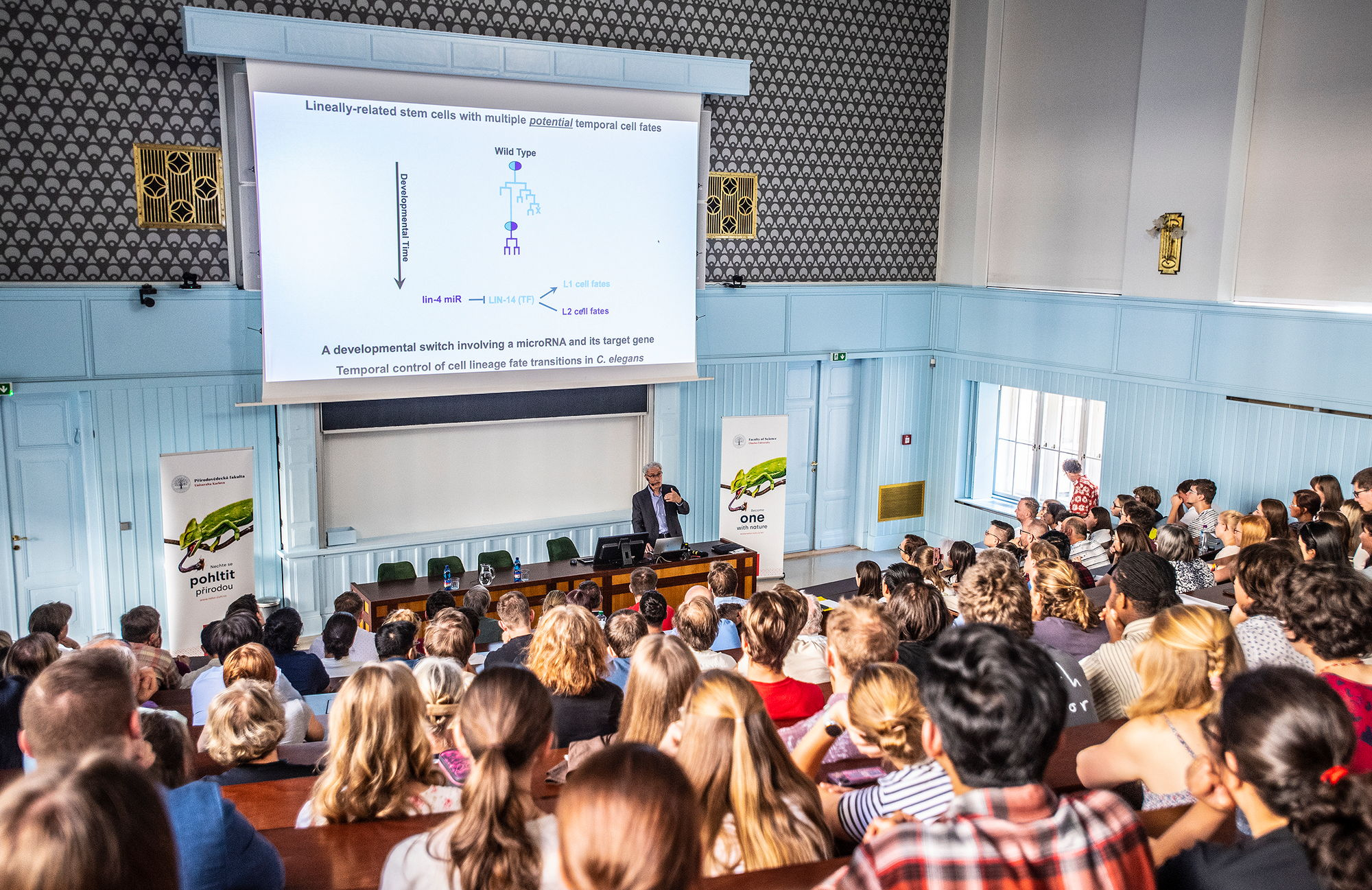 Victor Ambros přednesl ve zcela zaplněné Velké geologické posluchárně Přírodovědecké fakulty UK přednášku na téma Development timers in a tiny worm!