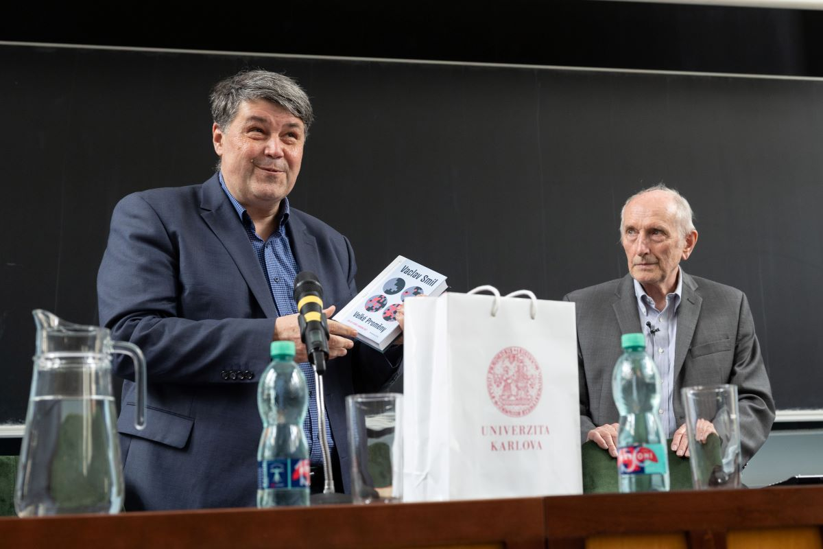 Otázky vzácnému hostovi klade mimo jinými děkan PřF UK Jiří Zima. Smil ve světě proslul jako zajímavý a intelektuálně podnětný autor řady knih.