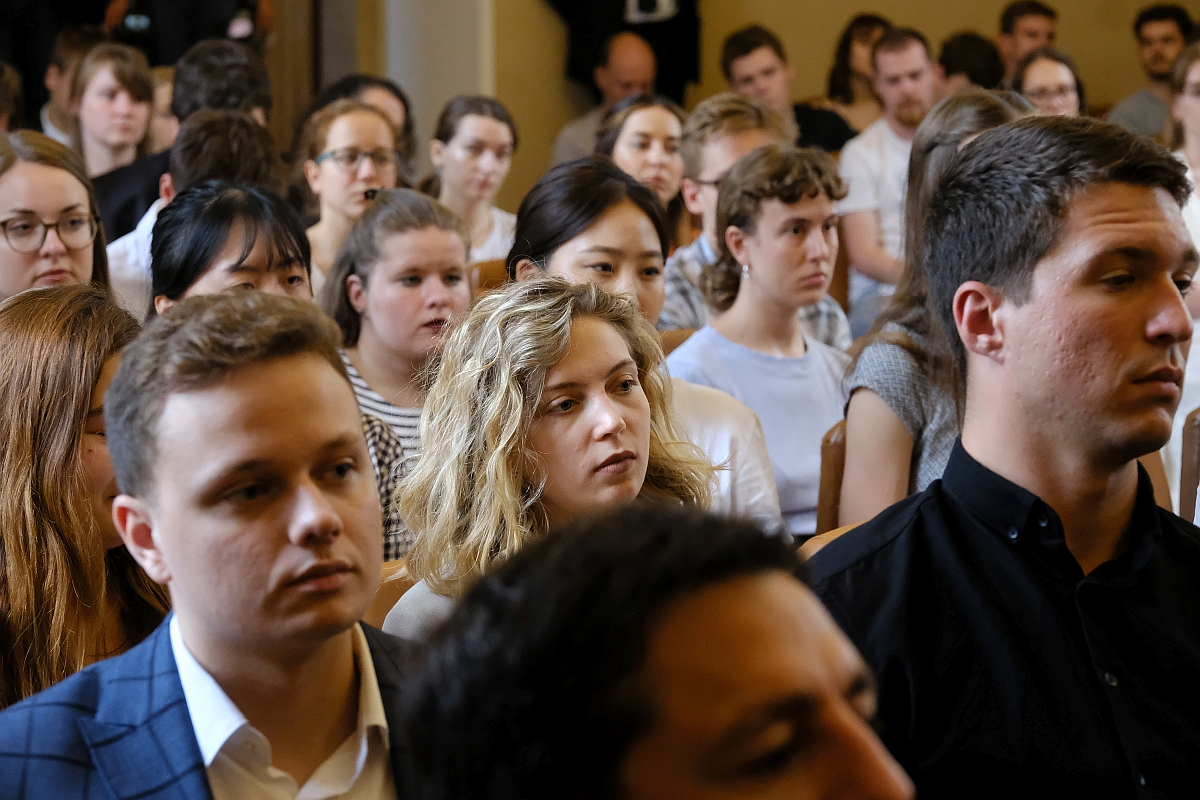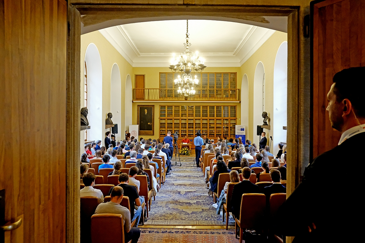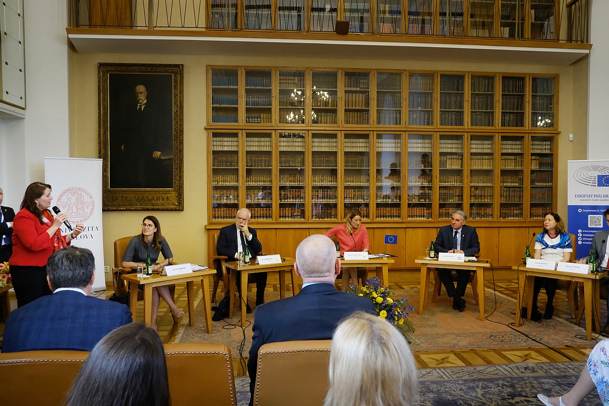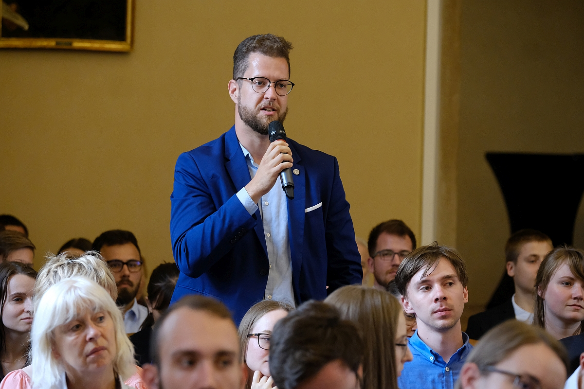 Charles University’s Lenka Rovná spoke first, welcoming Rector Milena Králíčková, who in turn (along with student representative Martin Čihák in the role of moderator) introduced EP President Metsola to a hall packed with both fresh-faced first years as well as more seasoned PhD students. She thanked Roberta Metsola and other speakers present (MEPs from Italy, Czechia and Poland – Laura Ferrara, Jan Zahradil and Jan Olbrycht, respectively), saying students as well as others in attendance, such as academics and journalists, were keen for the debate to begin.